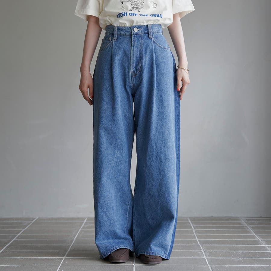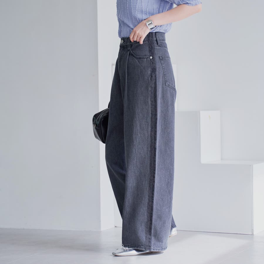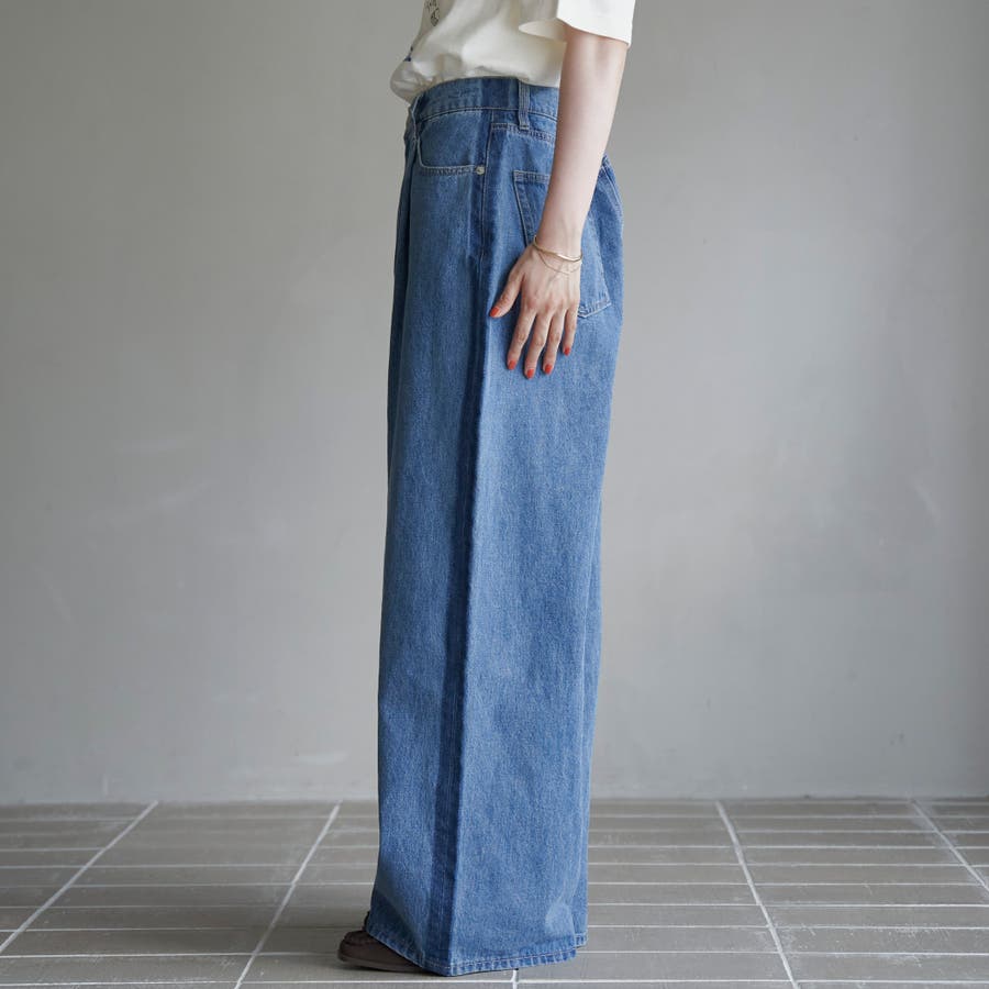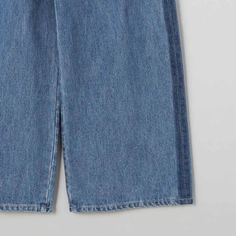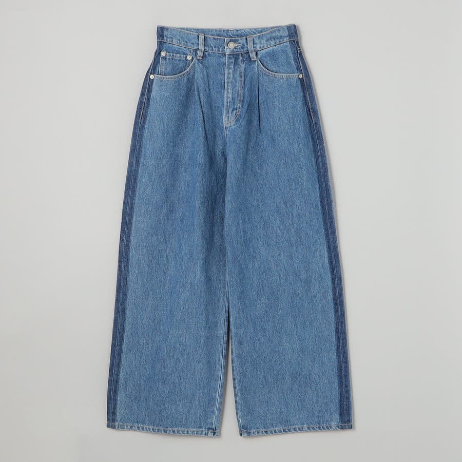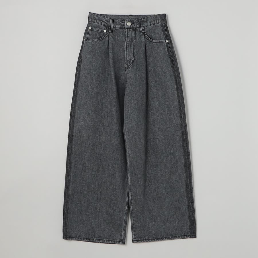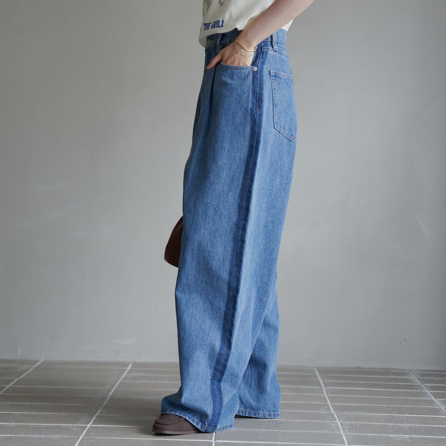 サイドにラインが入っているような色落ち加工が印象的な、タック入りワイドデニム。