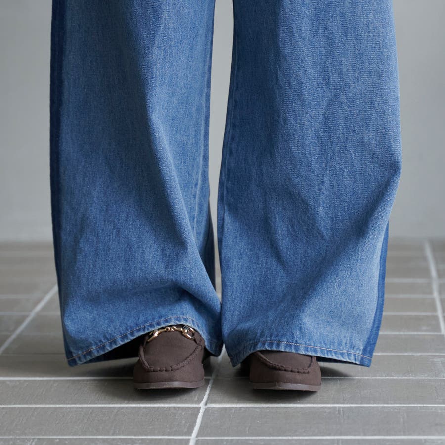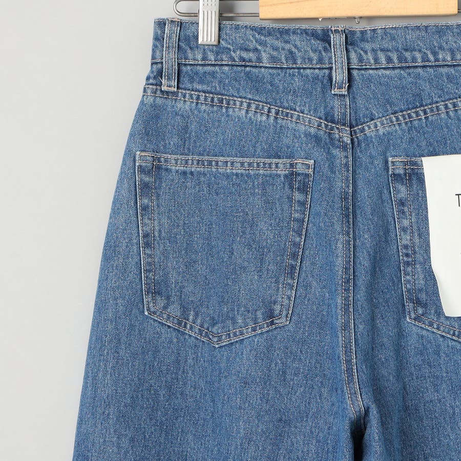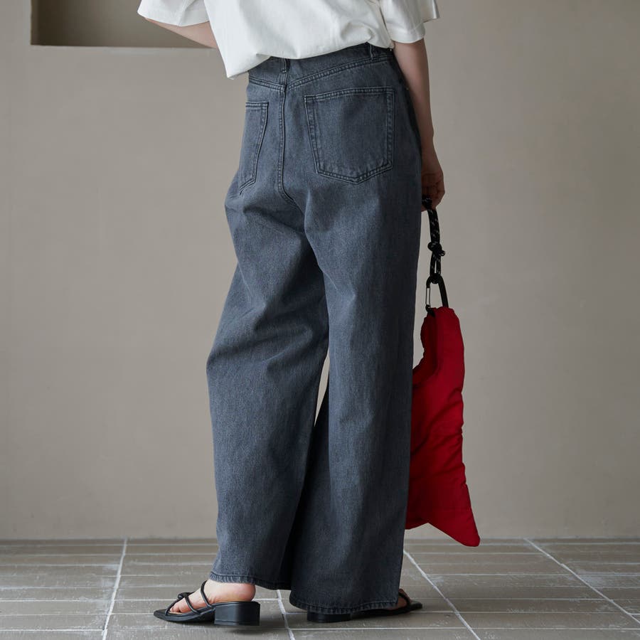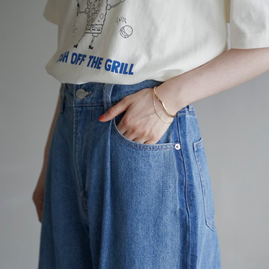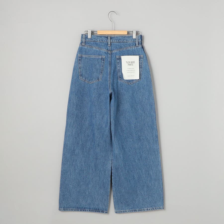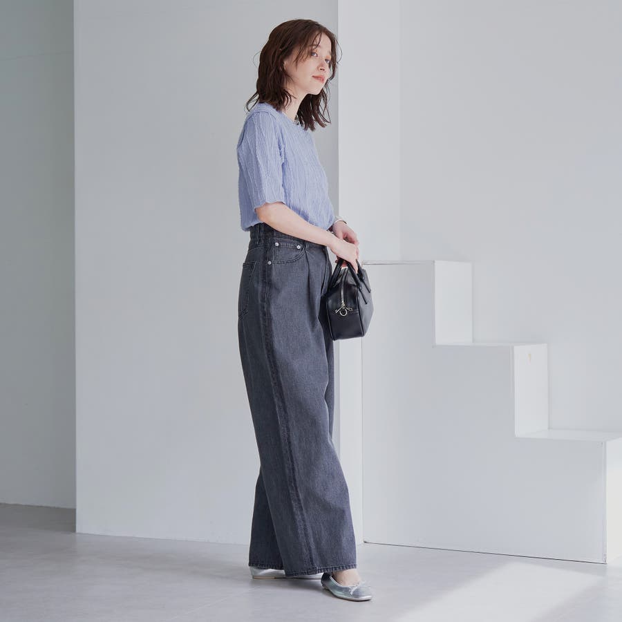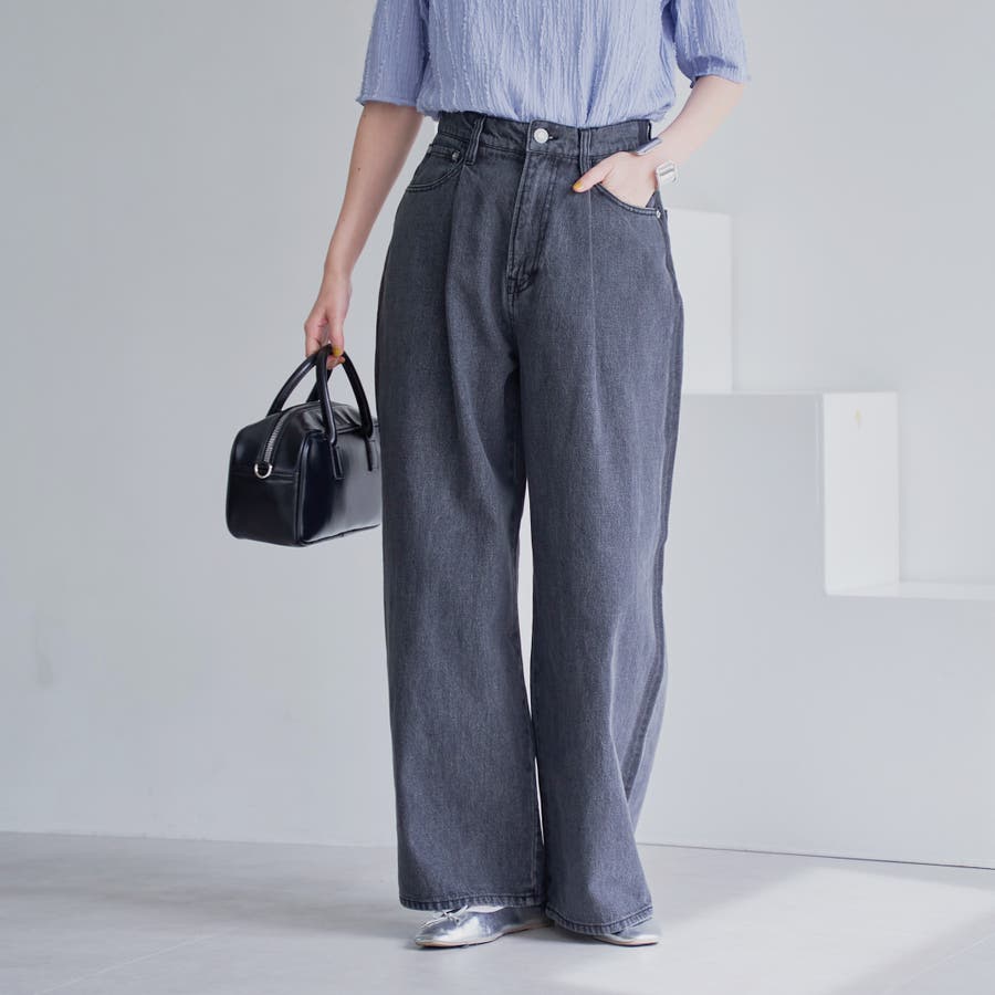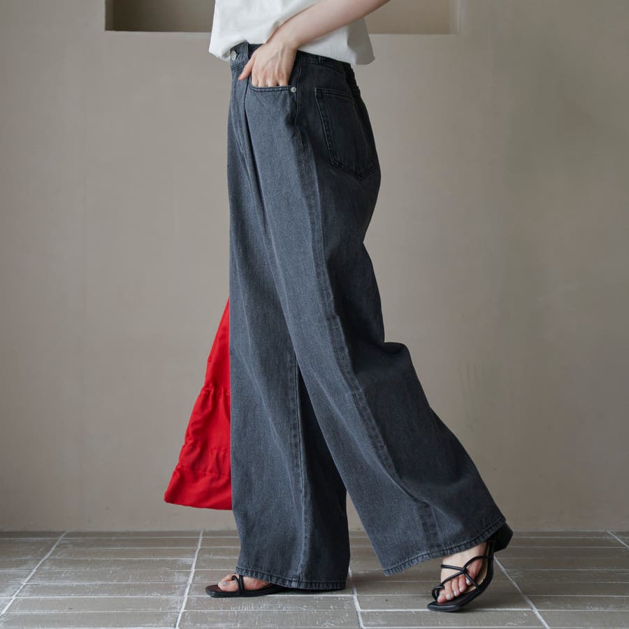 サイドにラインが入っているような色落ち加工が印象的な、タック入りワイドデニム。