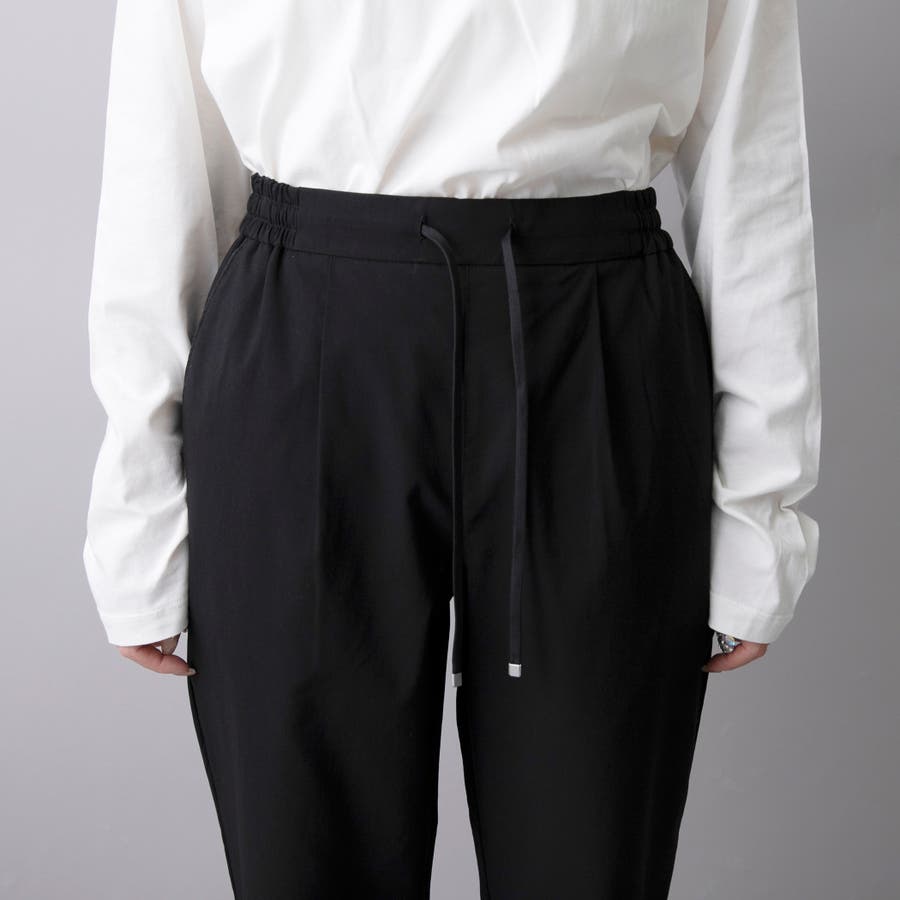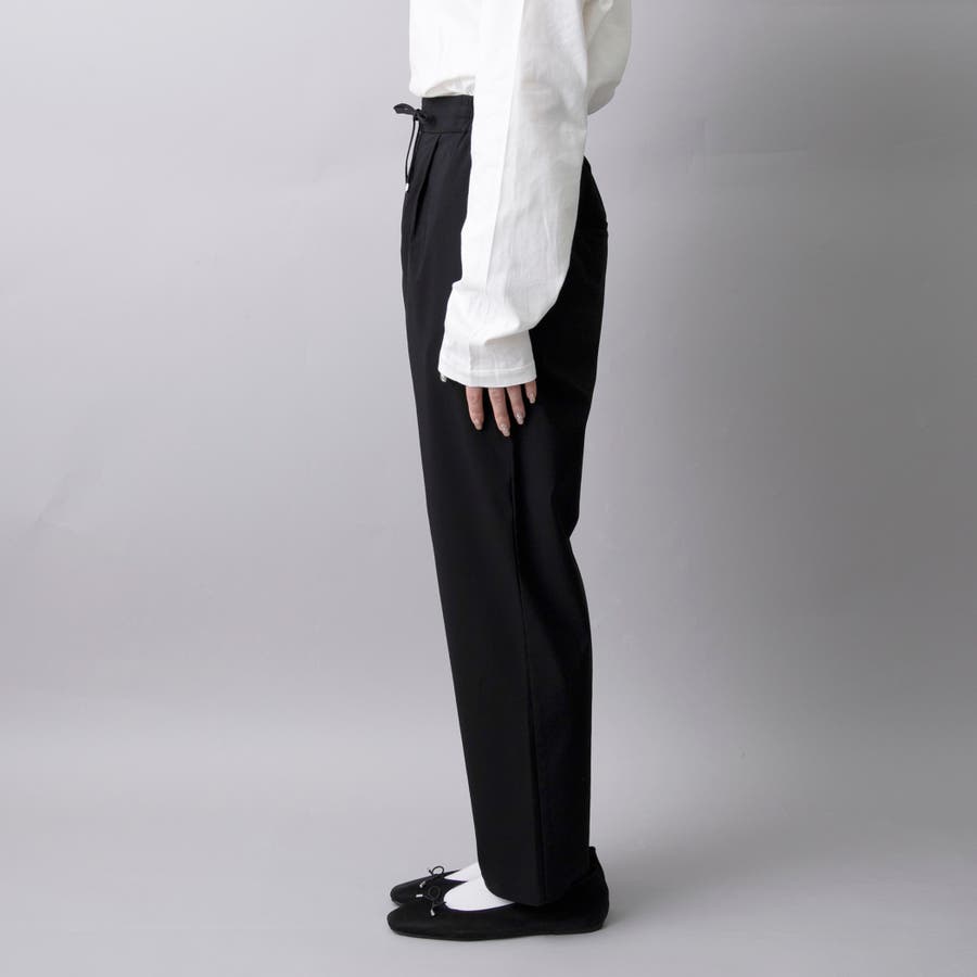 ワンタックと金具付きウエスト紐で、カジュアルすぎない印象に仕上げています。