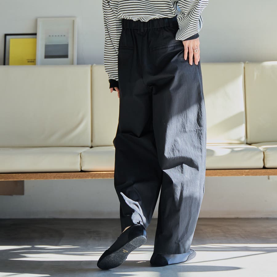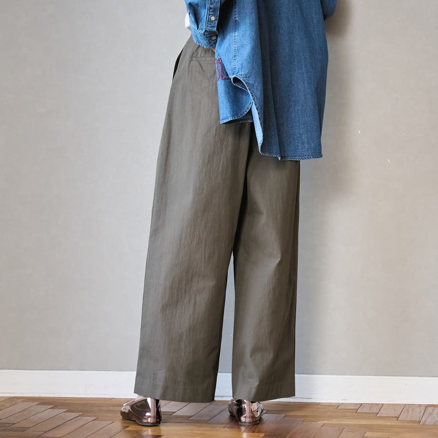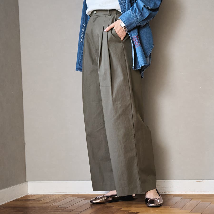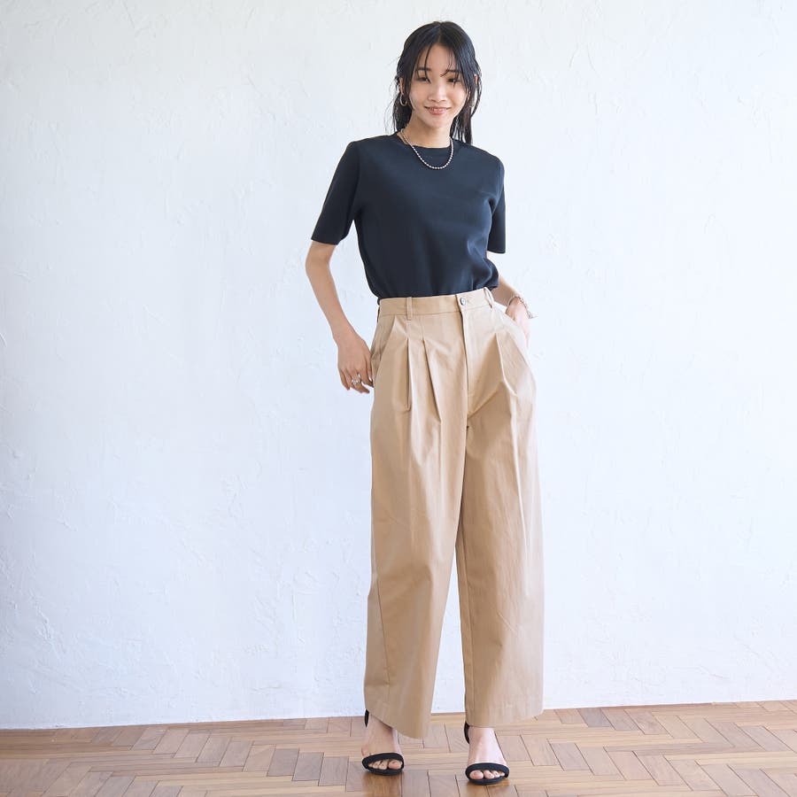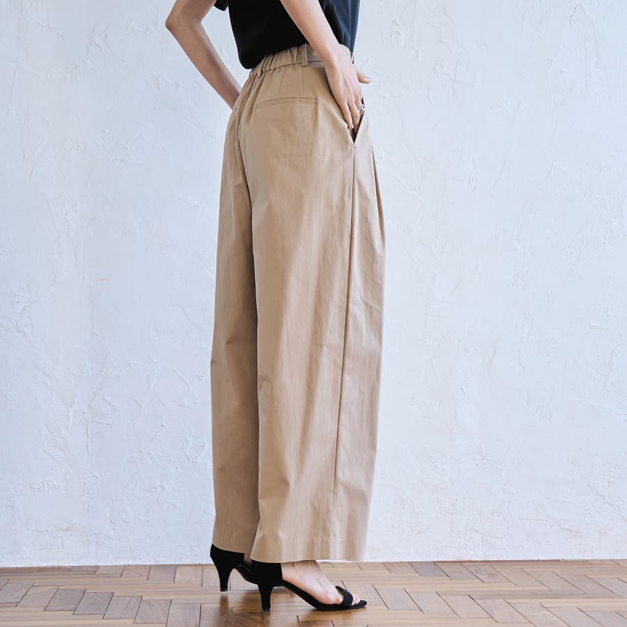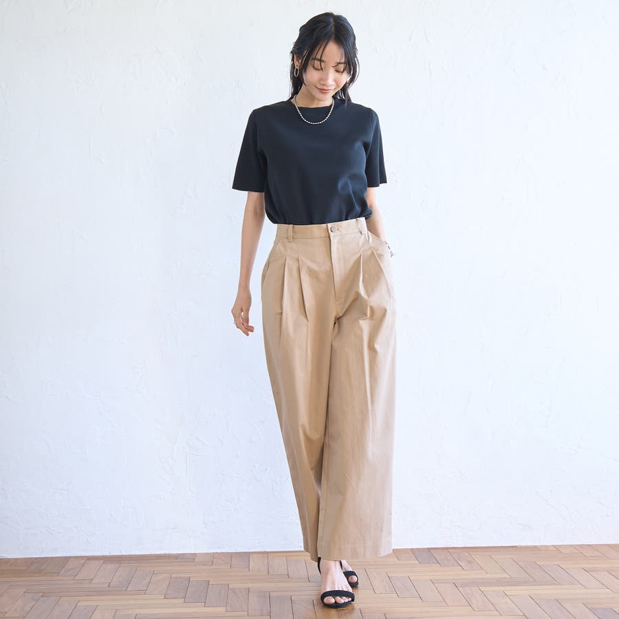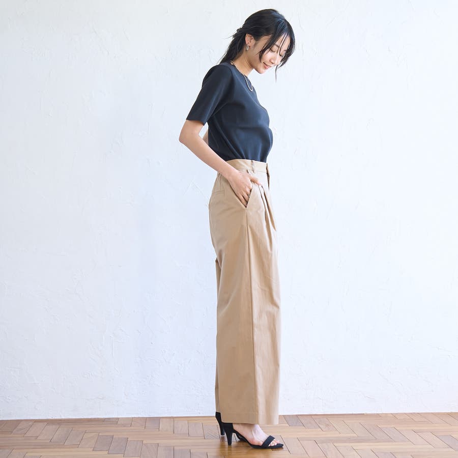 しっかりとしたハリ感のある生地で作られたワイドパンツは、程よいルーズ感を持ちながらも、キレイ目な印象を与えてくれます。