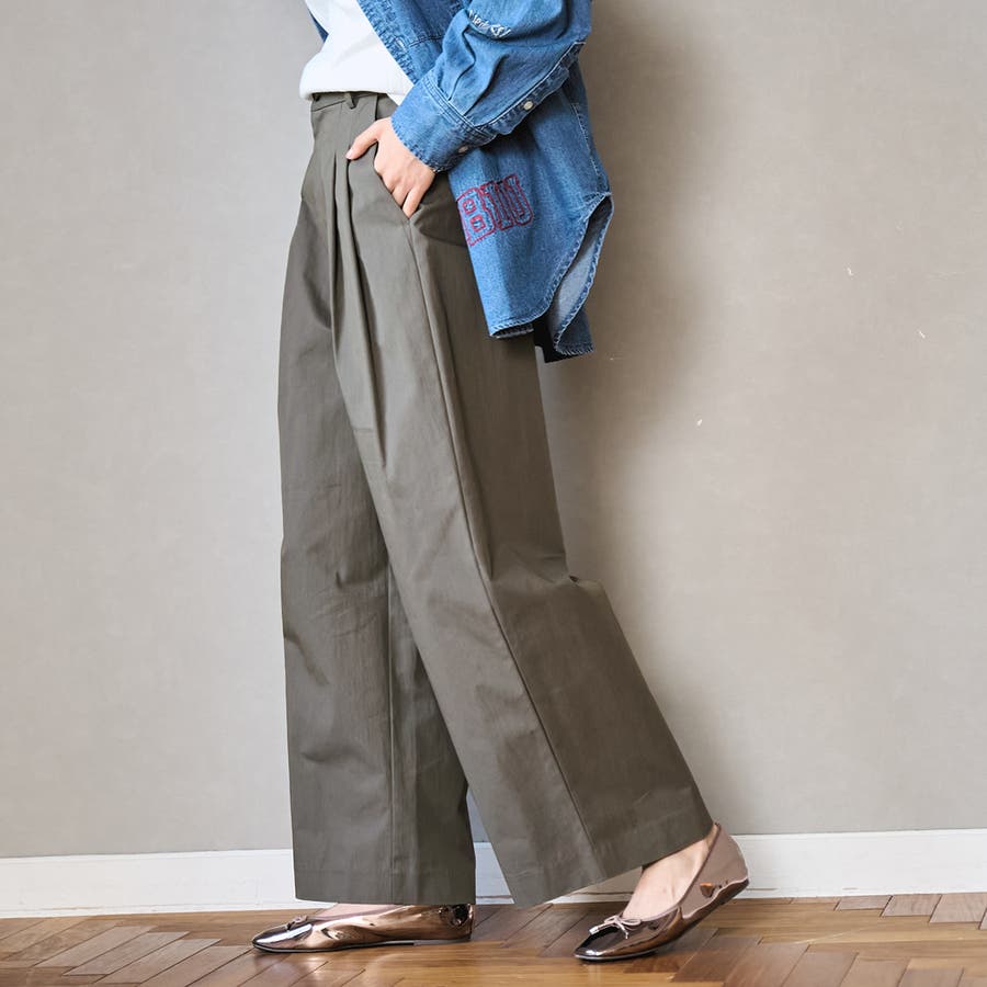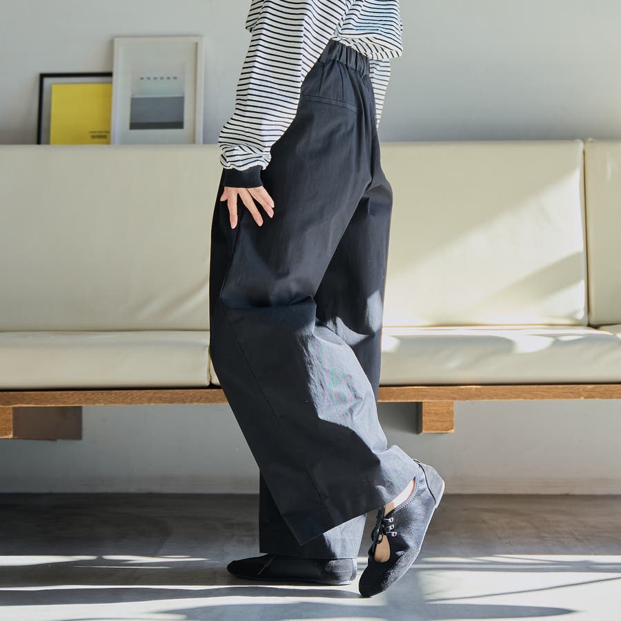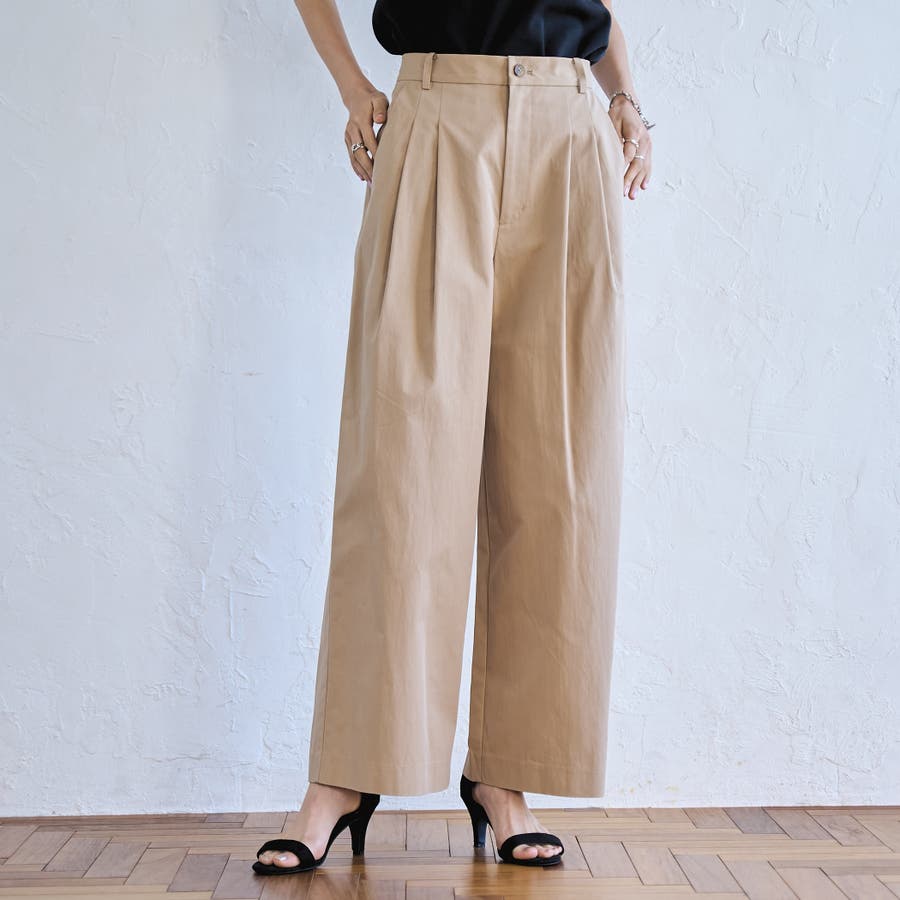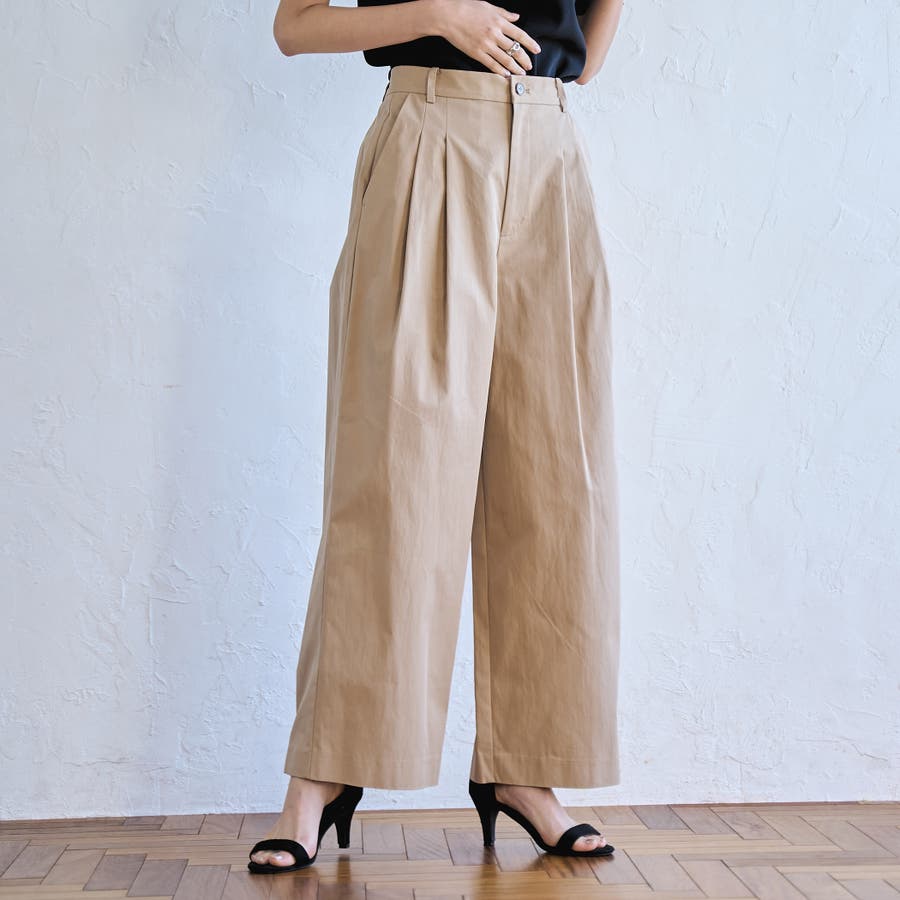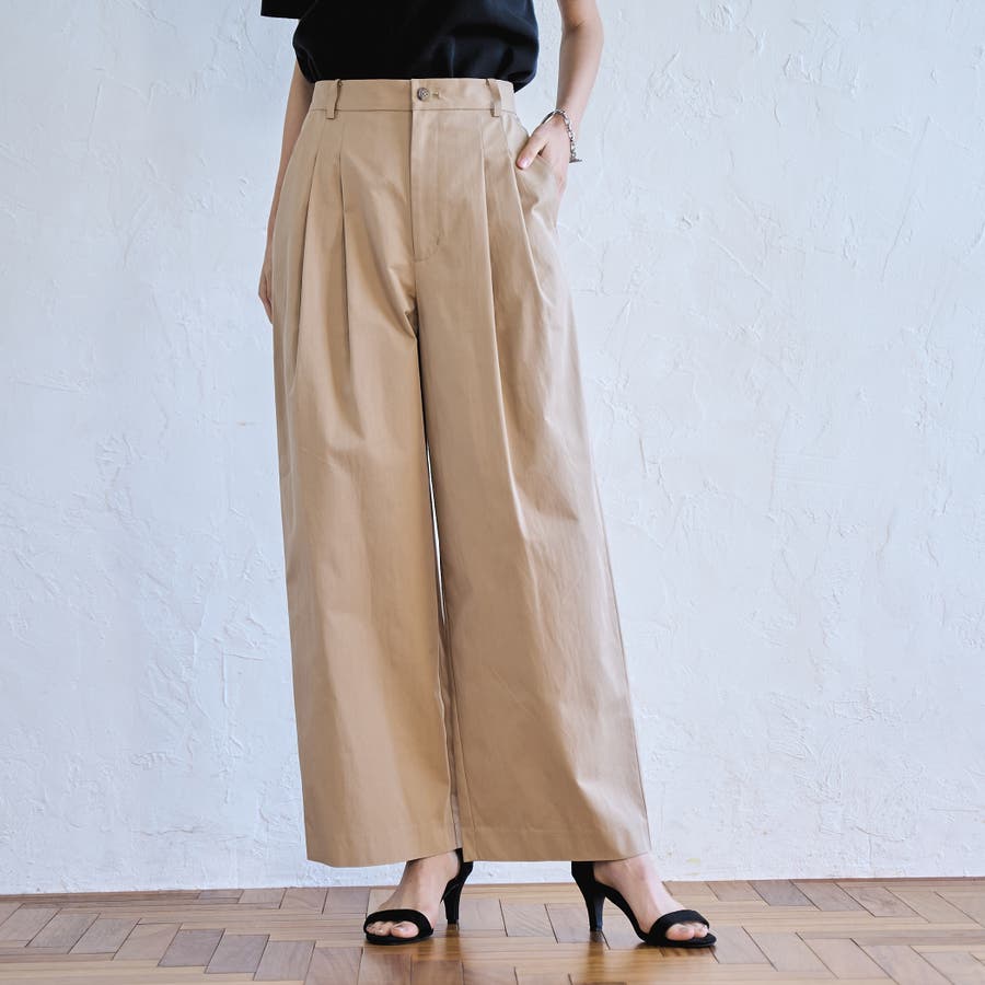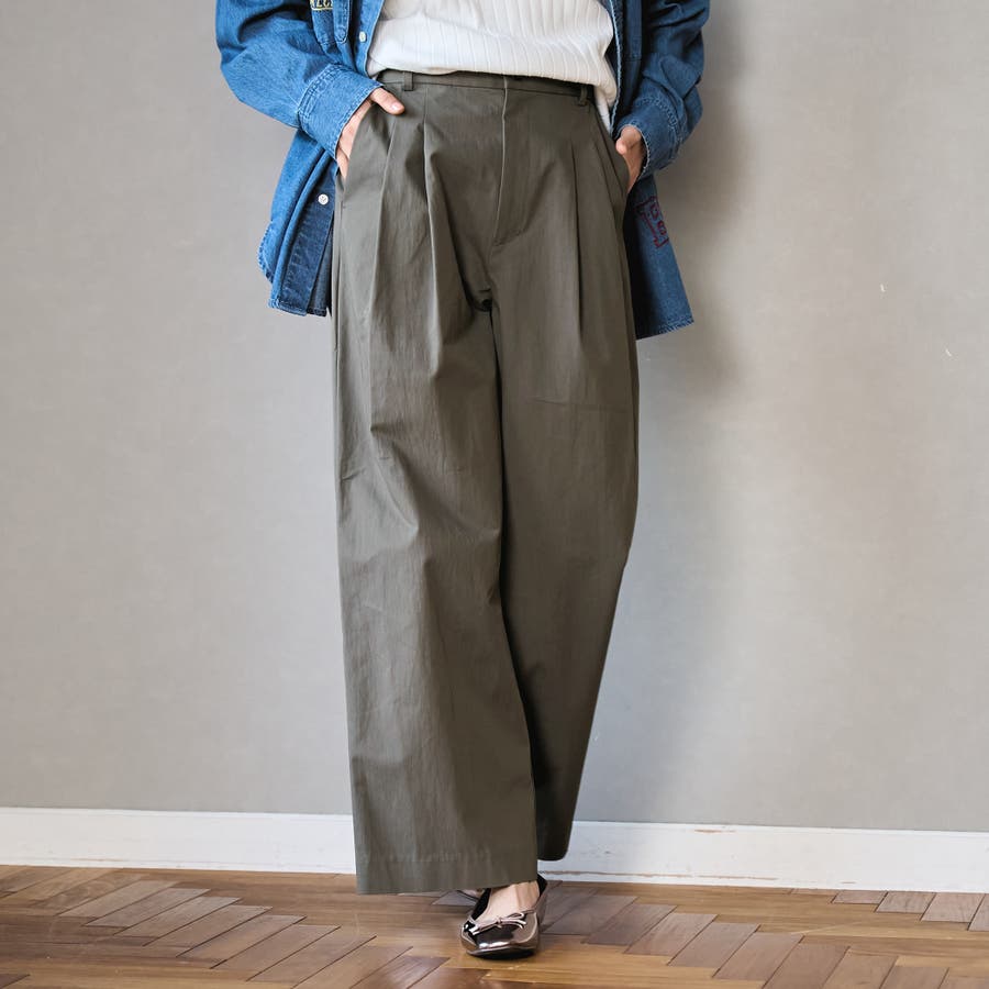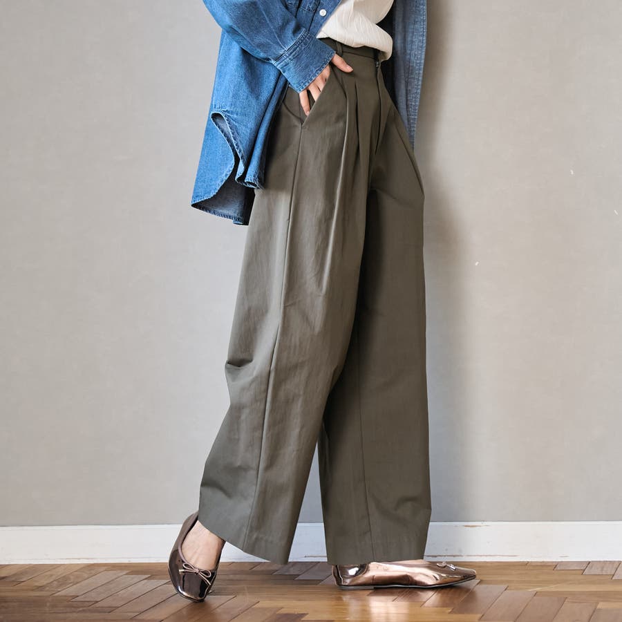 しっかりとしたハリ感のある生地で作られたワイドパンツは、程よいルーズ感を持ちながらも、キレイ目な印象を与えてくれます。