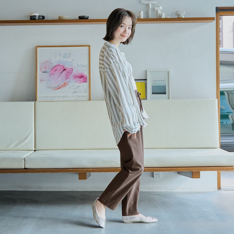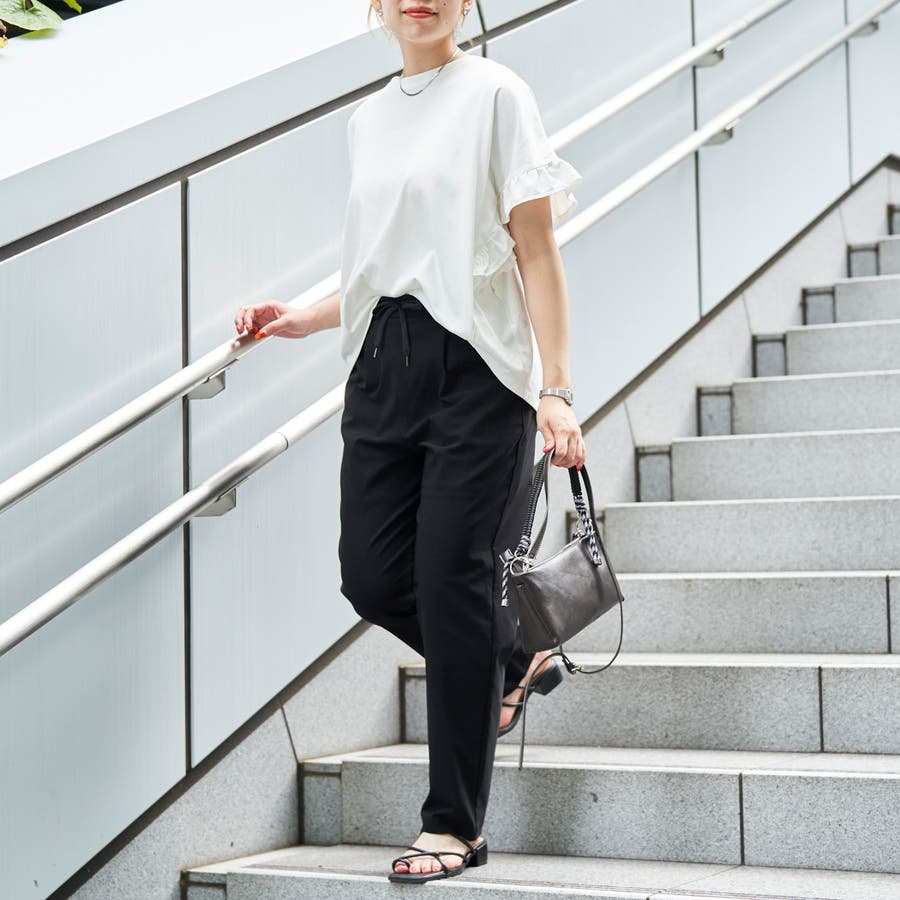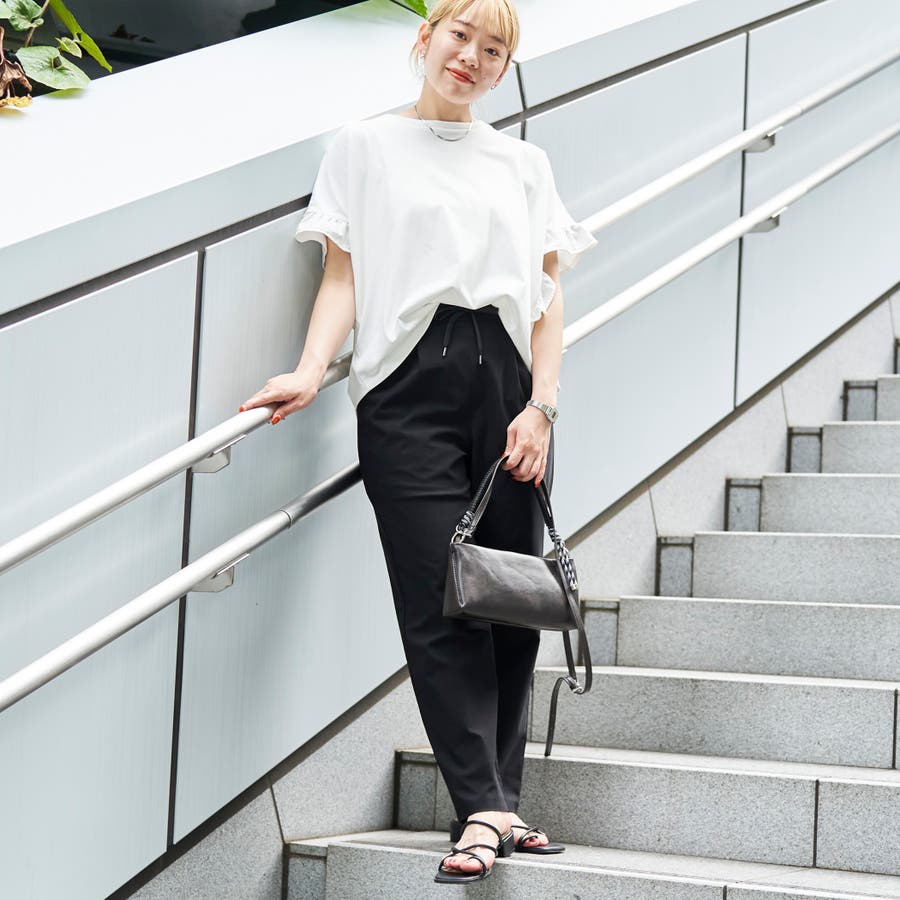 ・カジュアル見えしすぎないよう、ワンタック+ウエスト紐の先端に金具を配しクラス感をプラス
