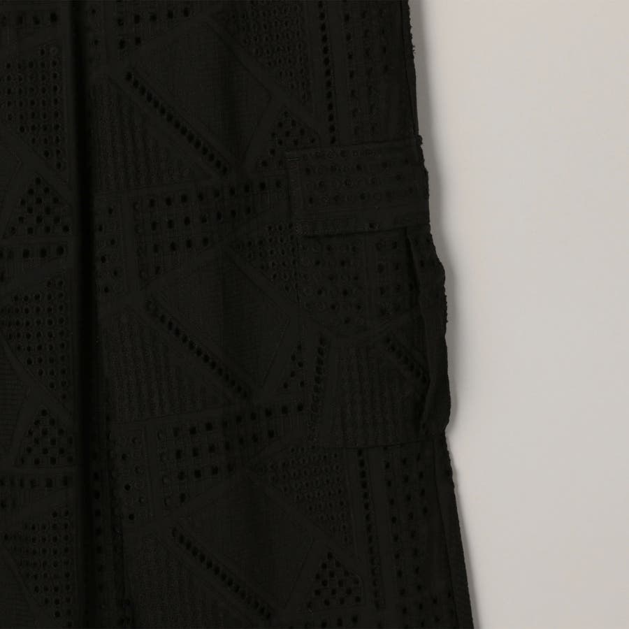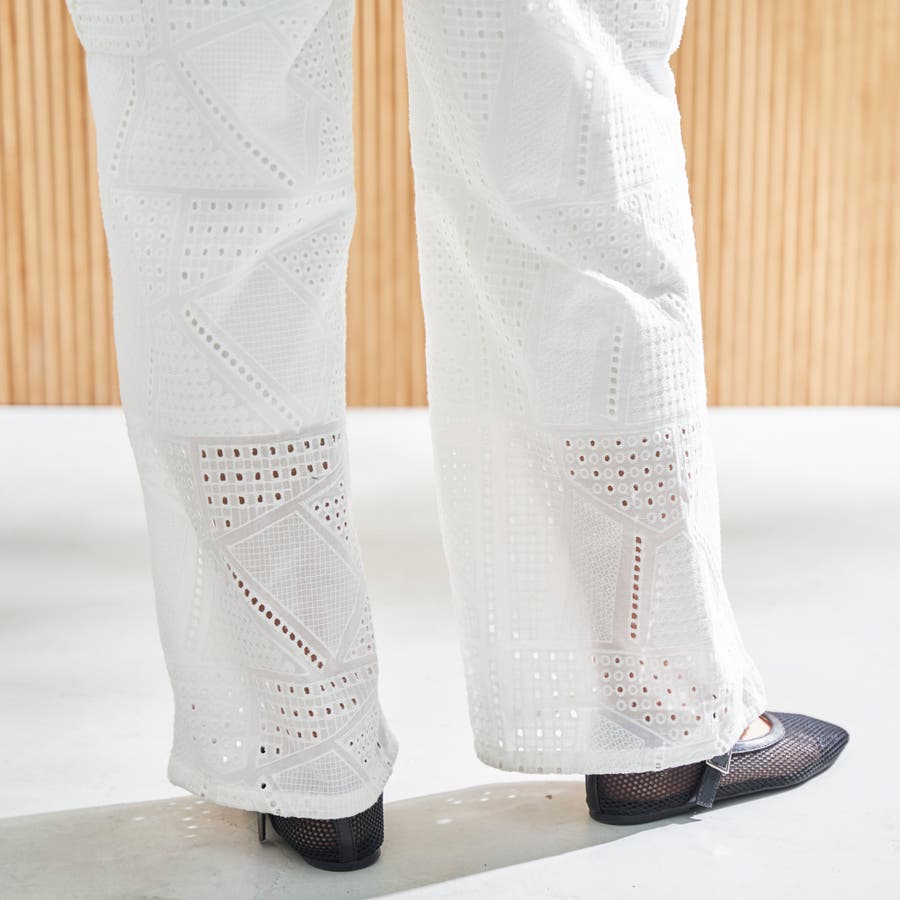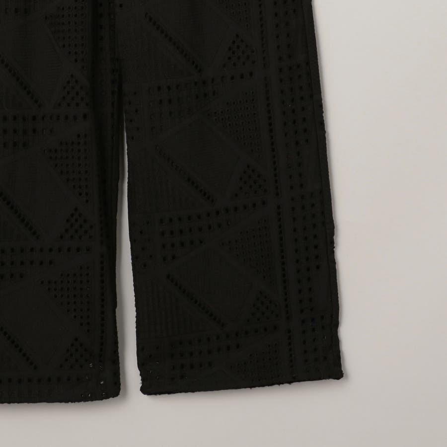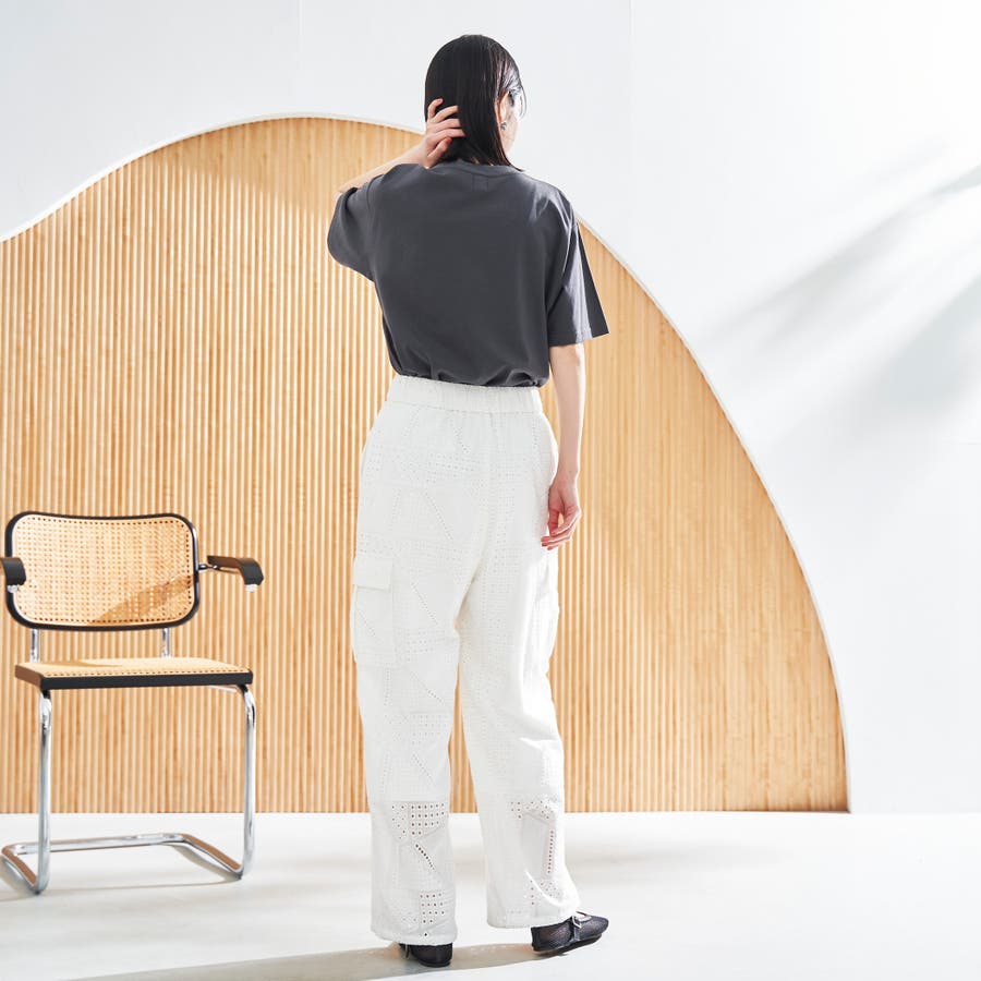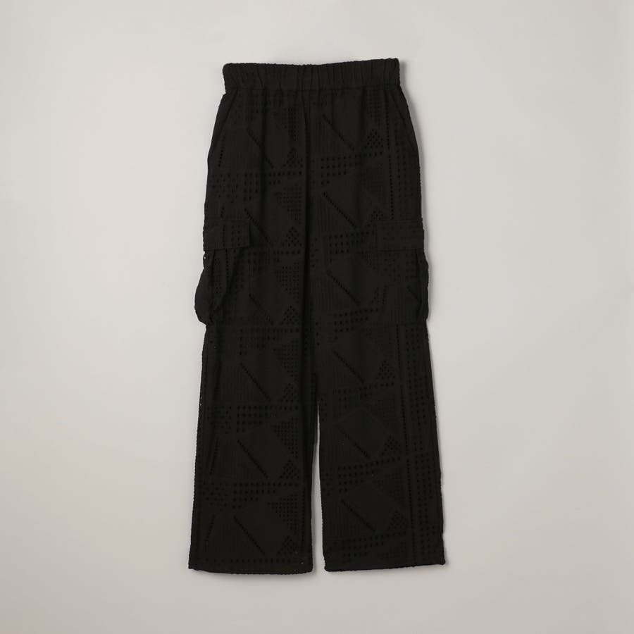 ●シャツと同素材のエンブロイダリーレースを使用した、セットアップでも楽しめるカーゴパンツ
