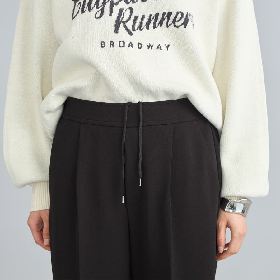 センタープレスと高めの位置のヒップポケットでシャープに見せつつ、ウエストはリラックスできる穿き心地のドローコード仕様。