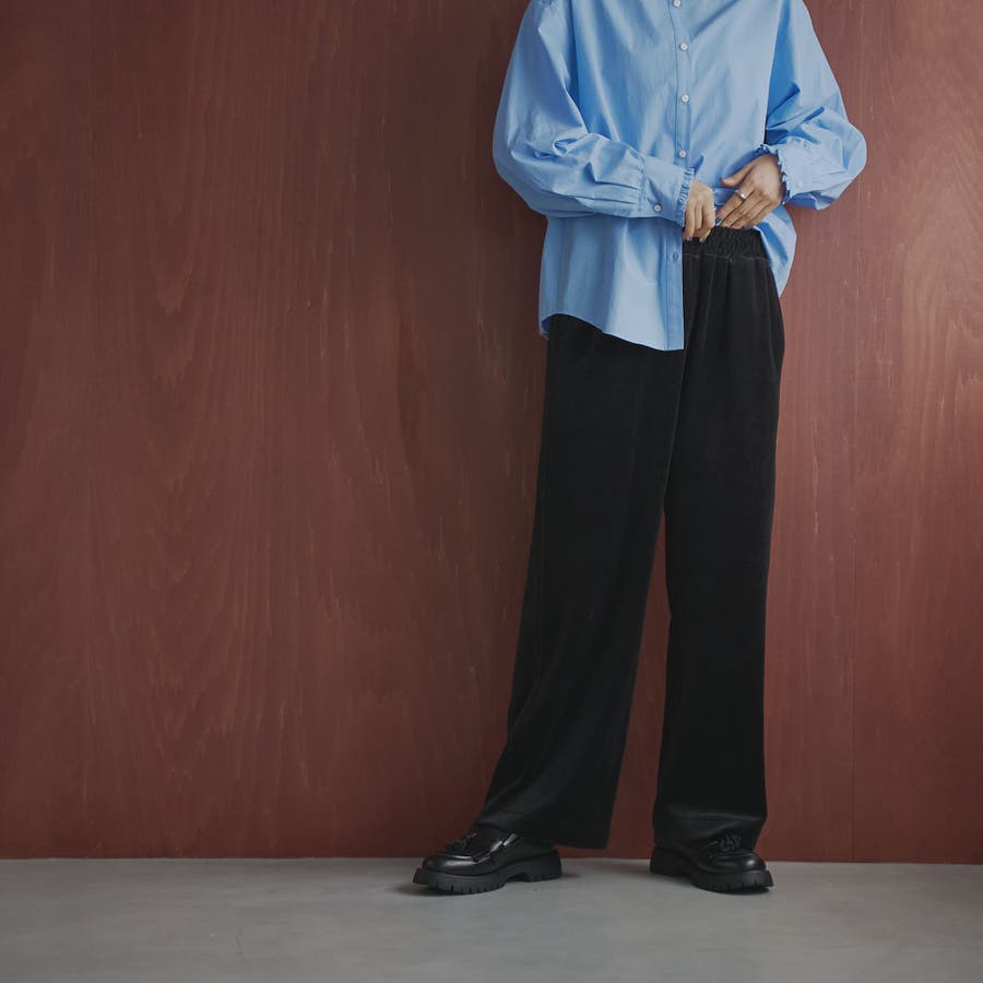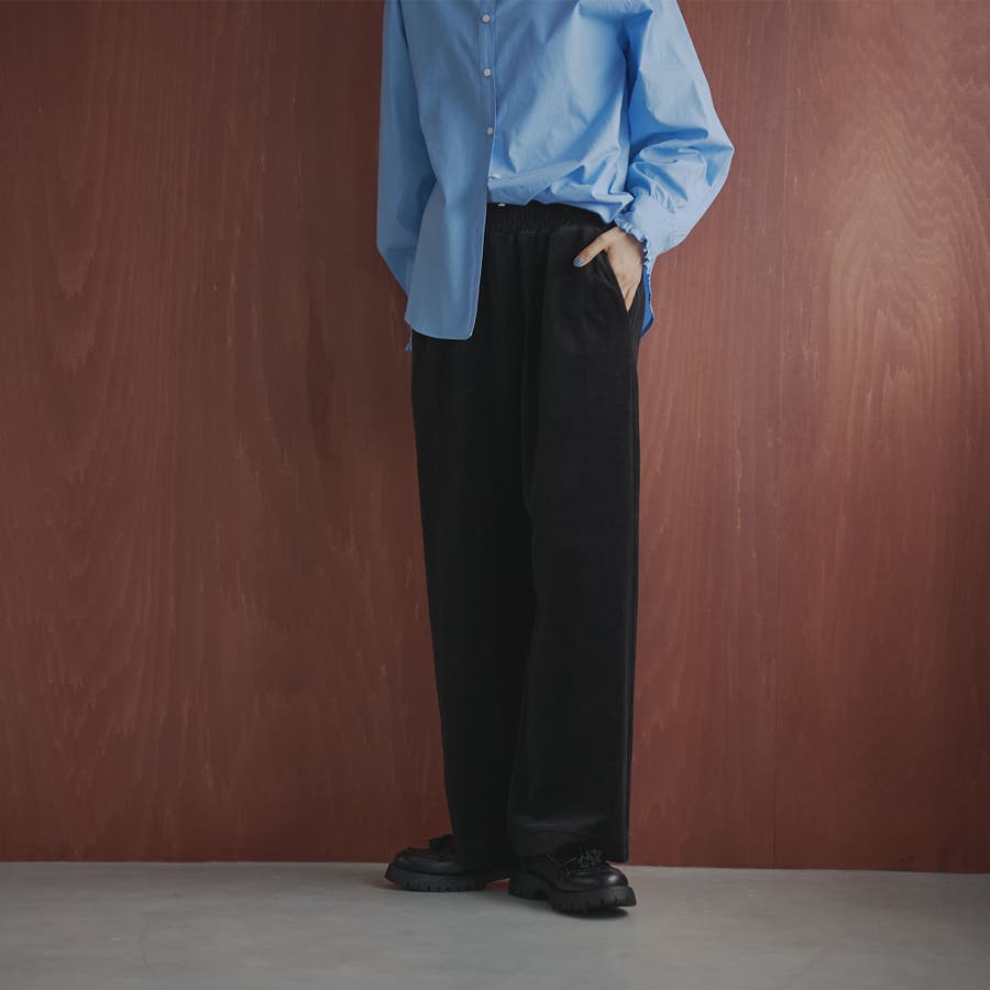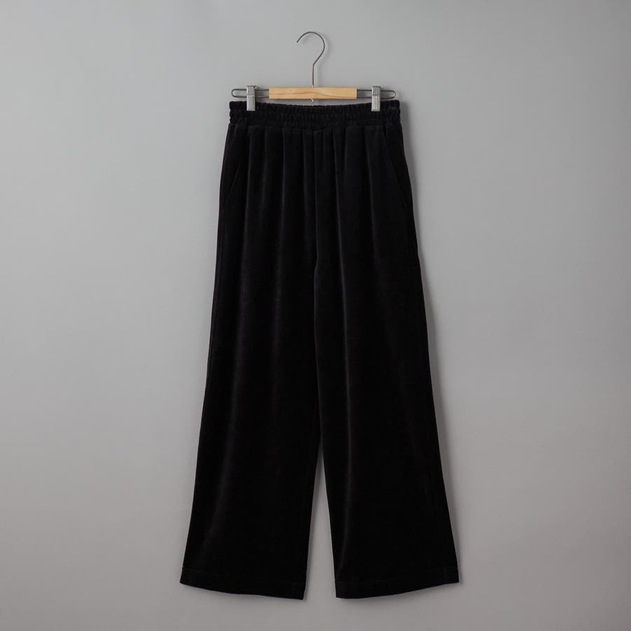 微起毛感と光沢が特徴のベロア生地を使用し、ゆったりシルエットに仕上げたシンプルなワイドパンツ。