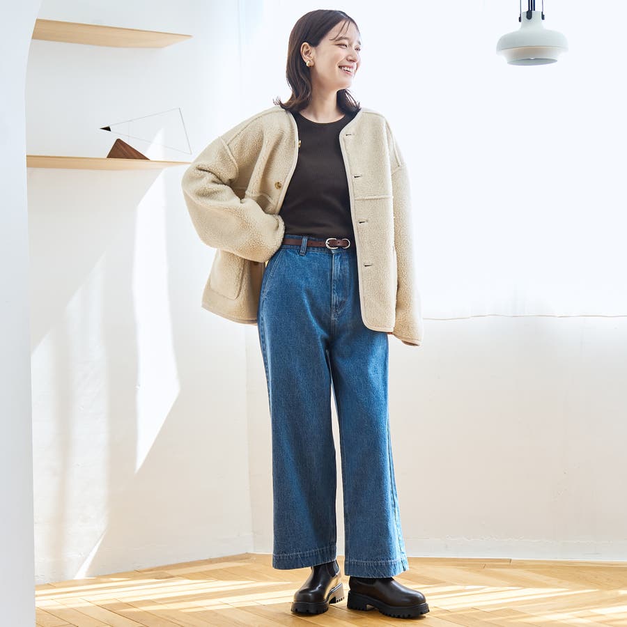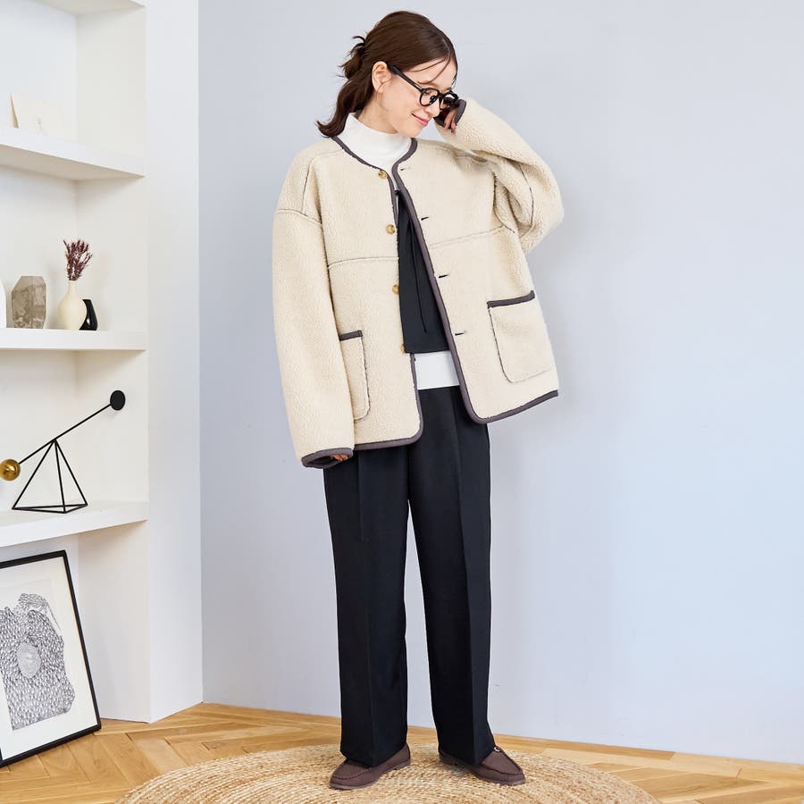 大きめサイズで厚手のトップスとも好相性。ノーカラー仕様で首元もすっきり見えます。