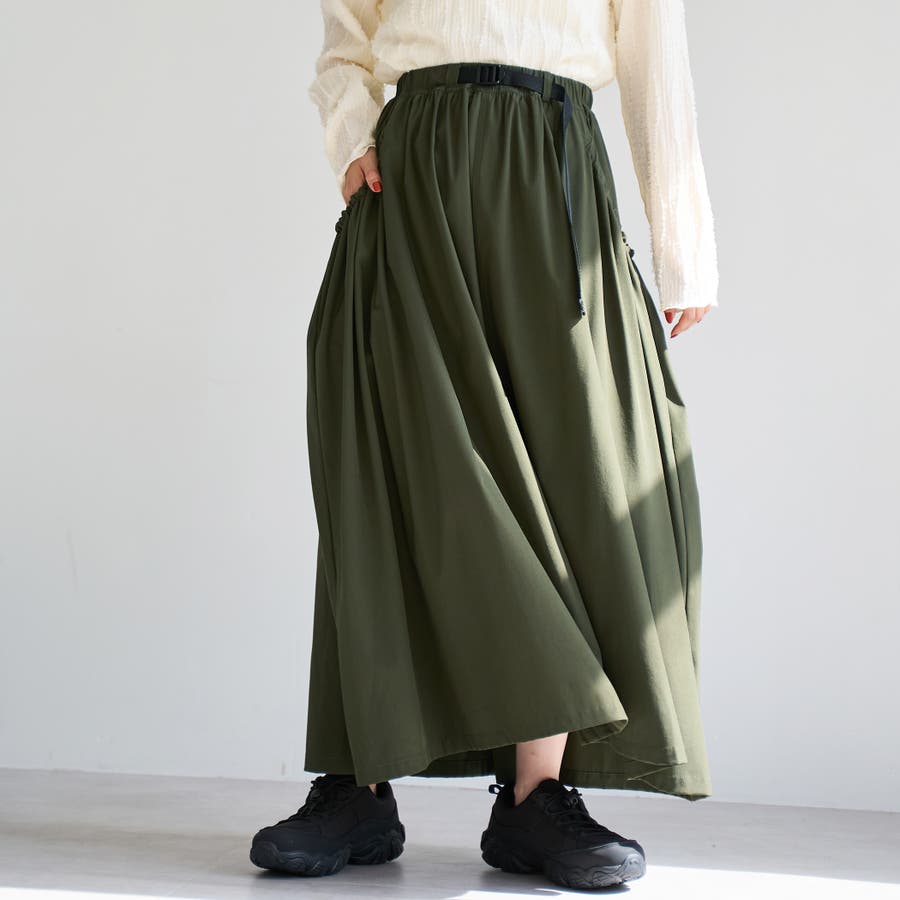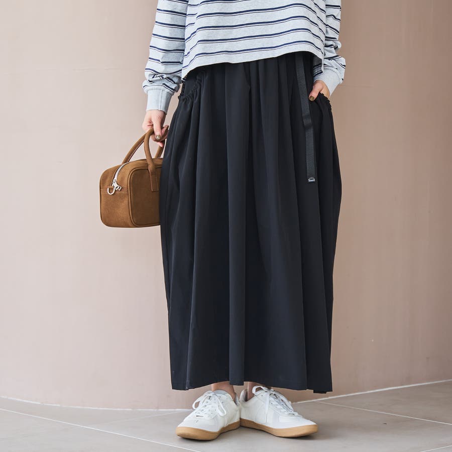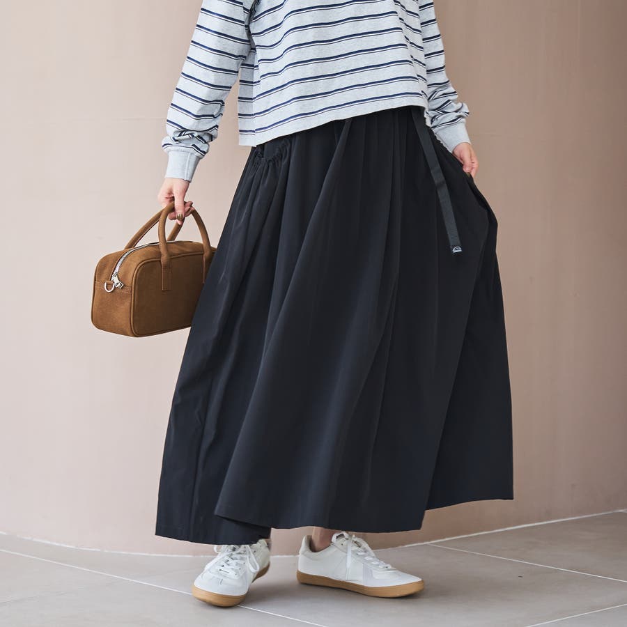 ナイロンベルトをアクセントにしたスポーティなデザインと、ふんわり広がるシルエットが特徴のスカート。