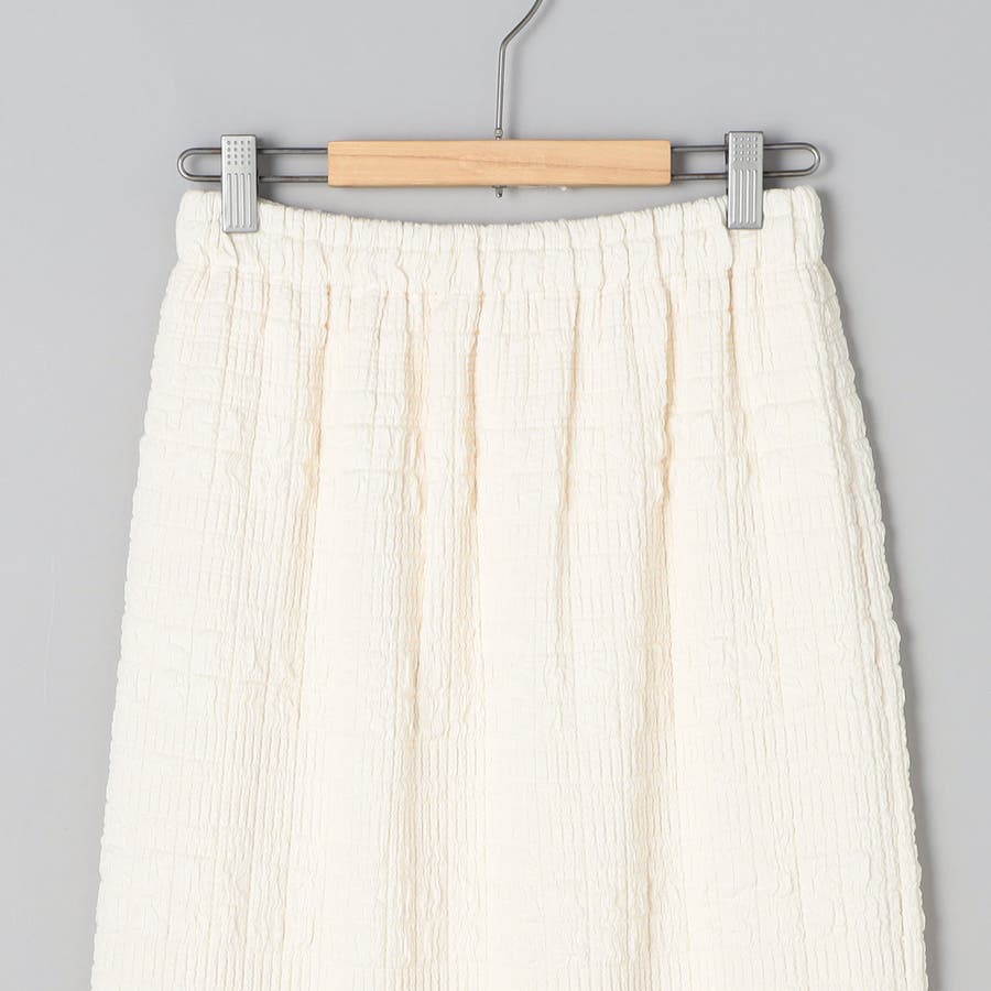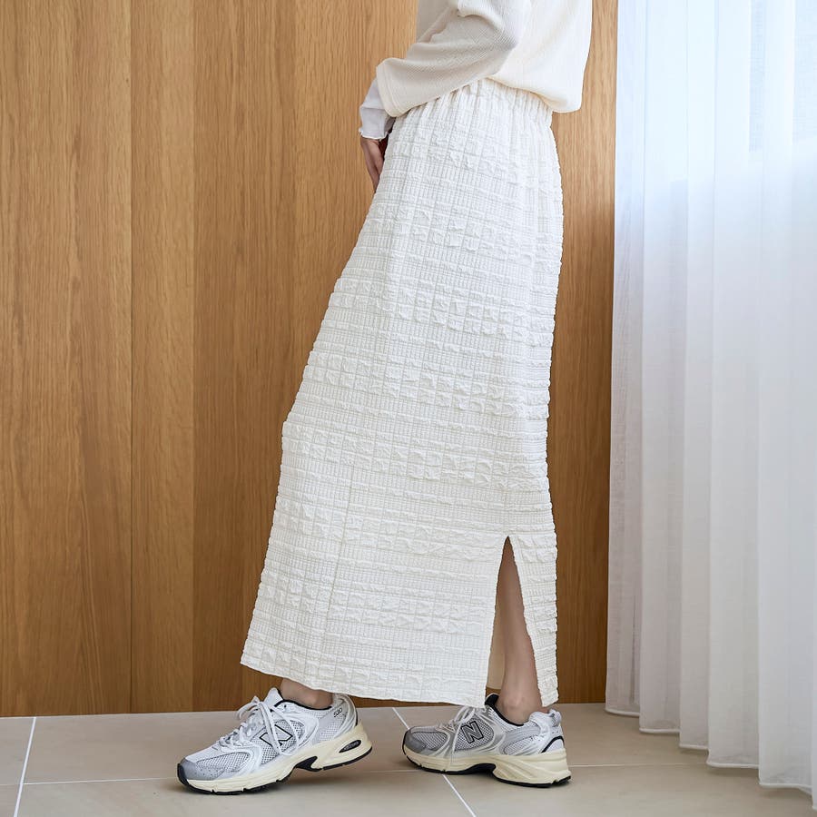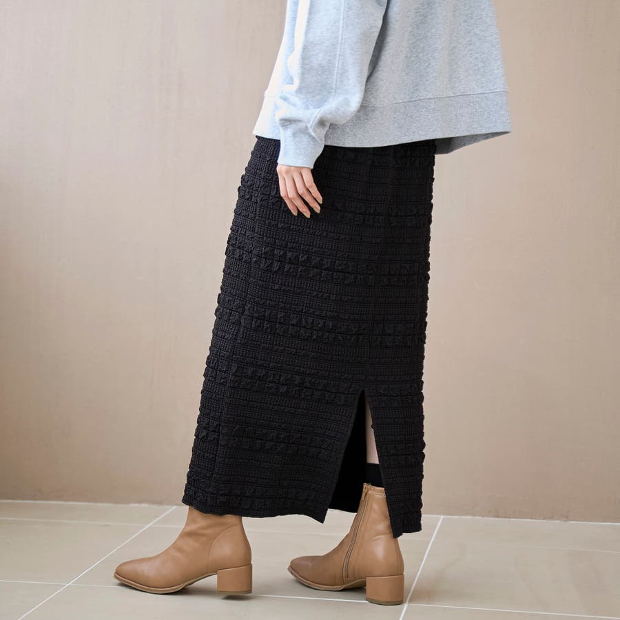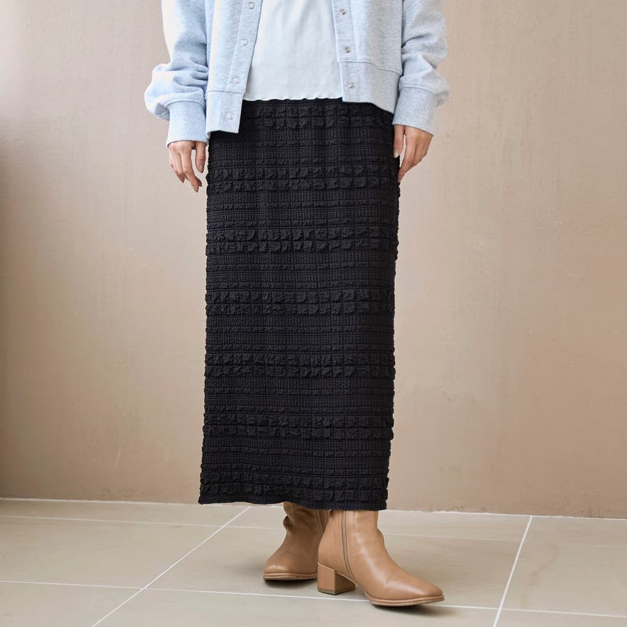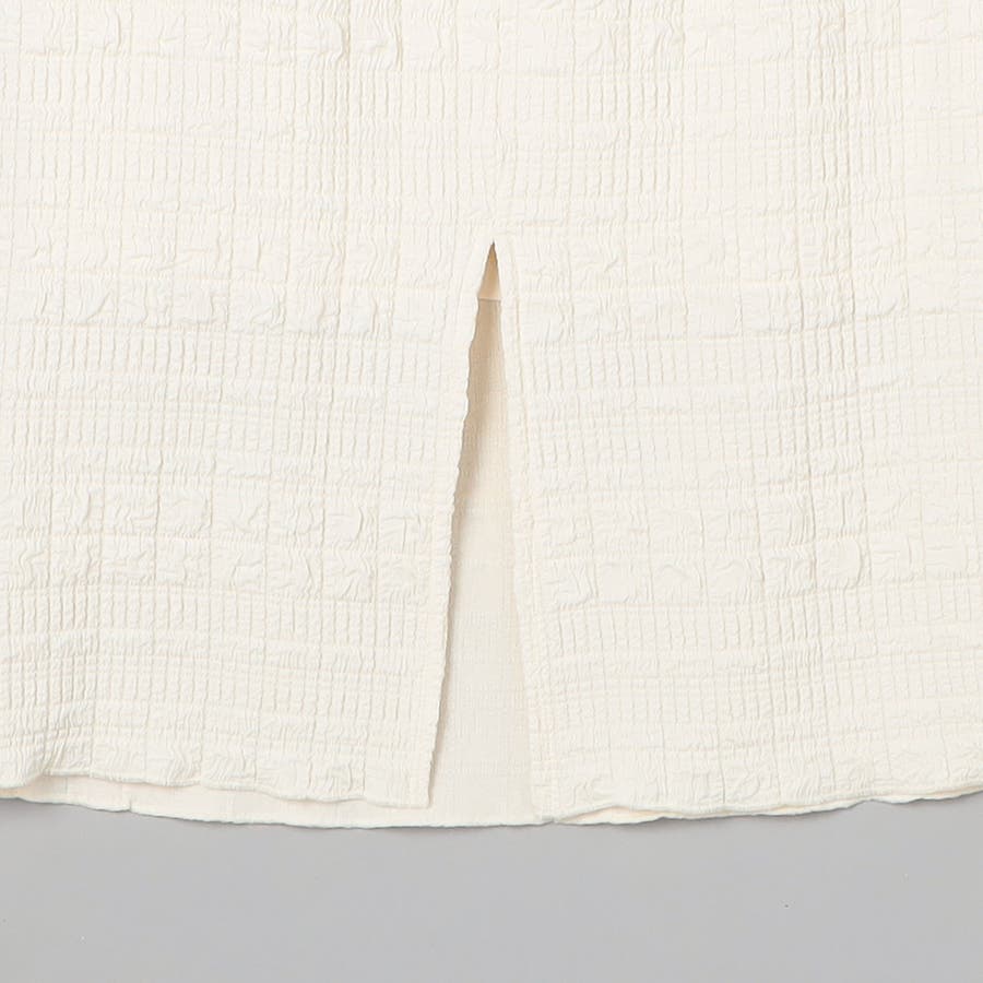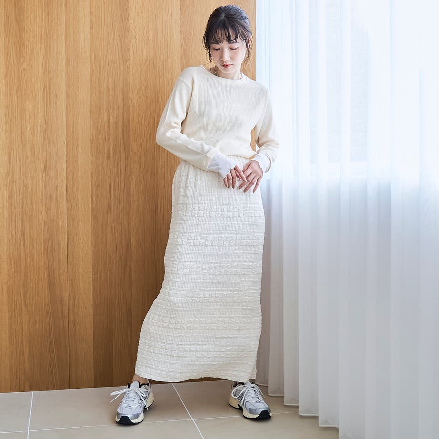 トレンド感のあるポコポコとした肉厚素材で、シンプルながら着映えし、女性らしさを引き立てます。