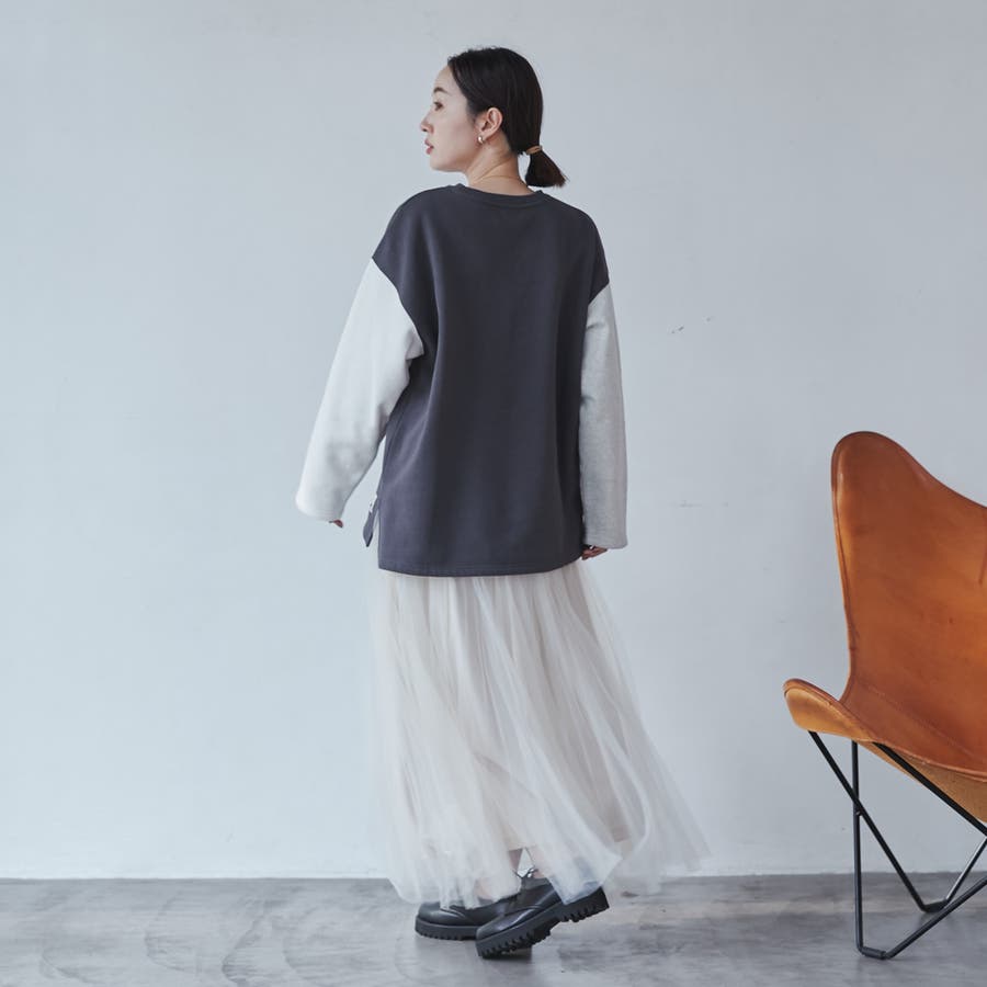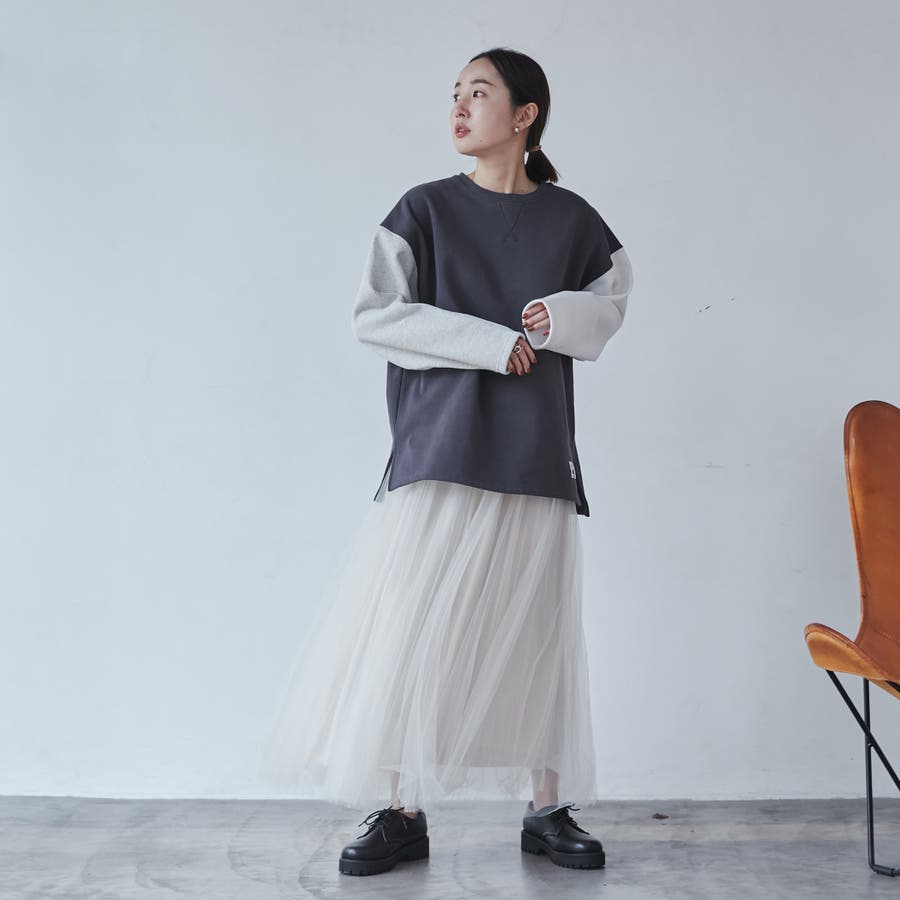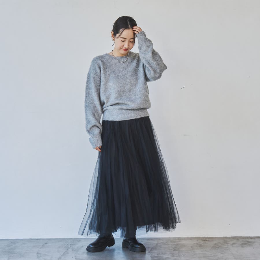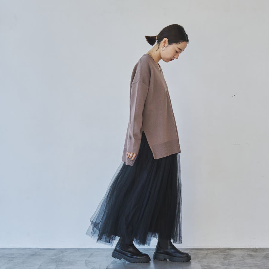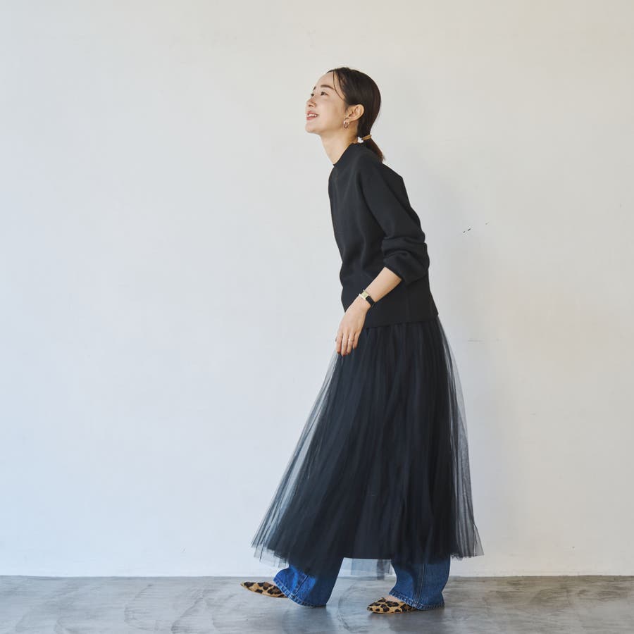 寒くなってきたらゆるニットとのコーデで大人フェミニンに仕上げるのも◎。