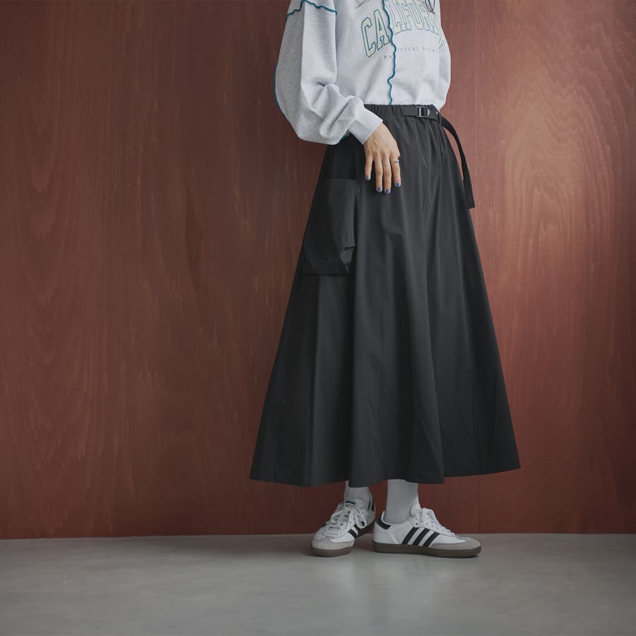 UVカットやストレッチ性など多機能な生地を使用したポケット付きフレアスカートです。