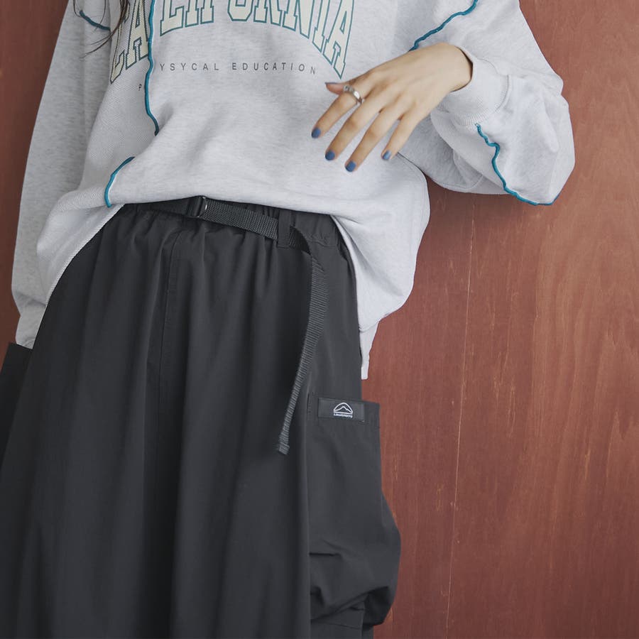シャカシャカする生地だけど、そんな広がりすぎてる感じでもないし、おっきなポケットかわいい。アウトドアな感じ。ウエストのベルト?のとこが履く時時間かかる