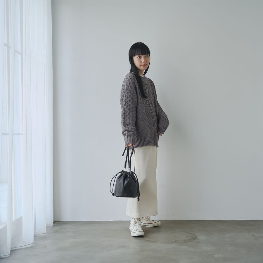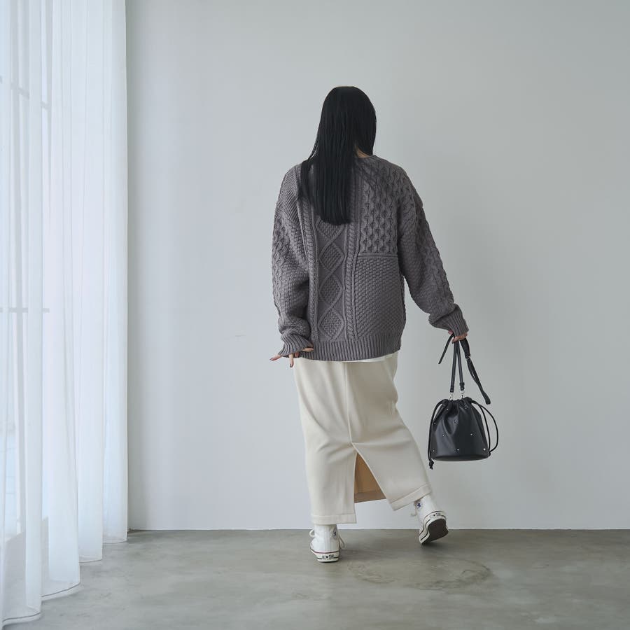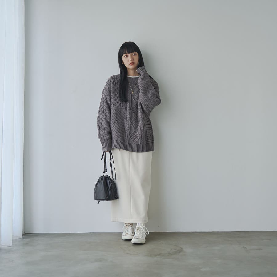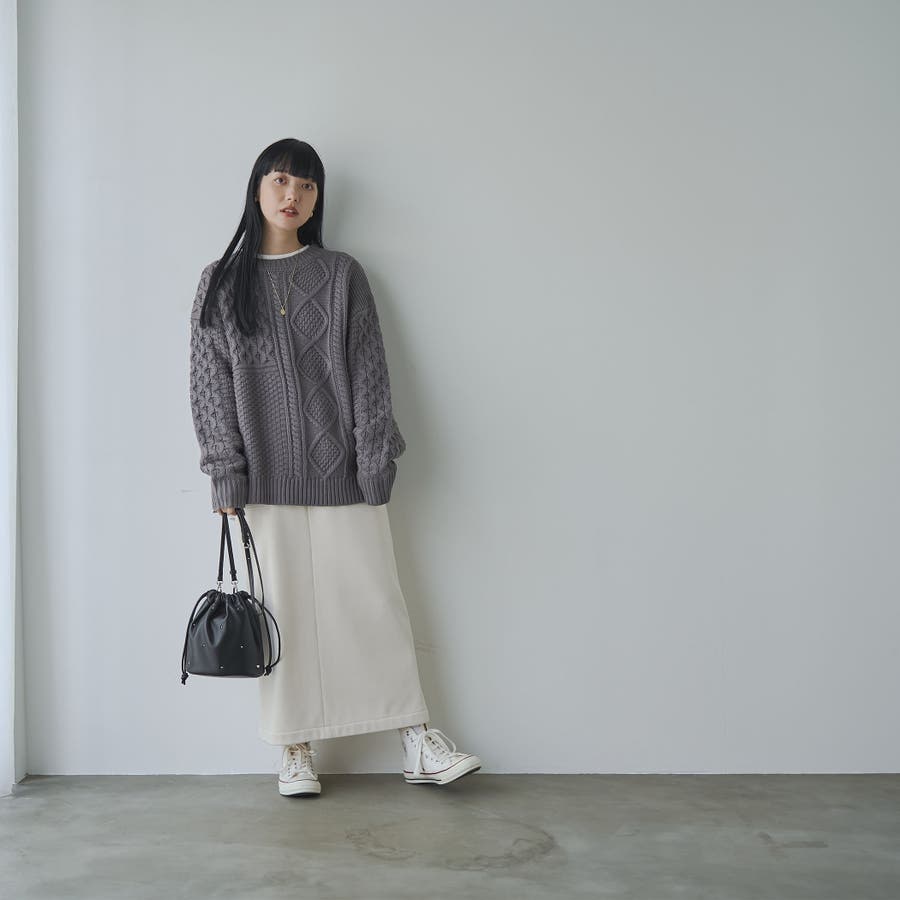 表面感のあるケーブルニットと合わせるのもおすすめのコーディネートです。