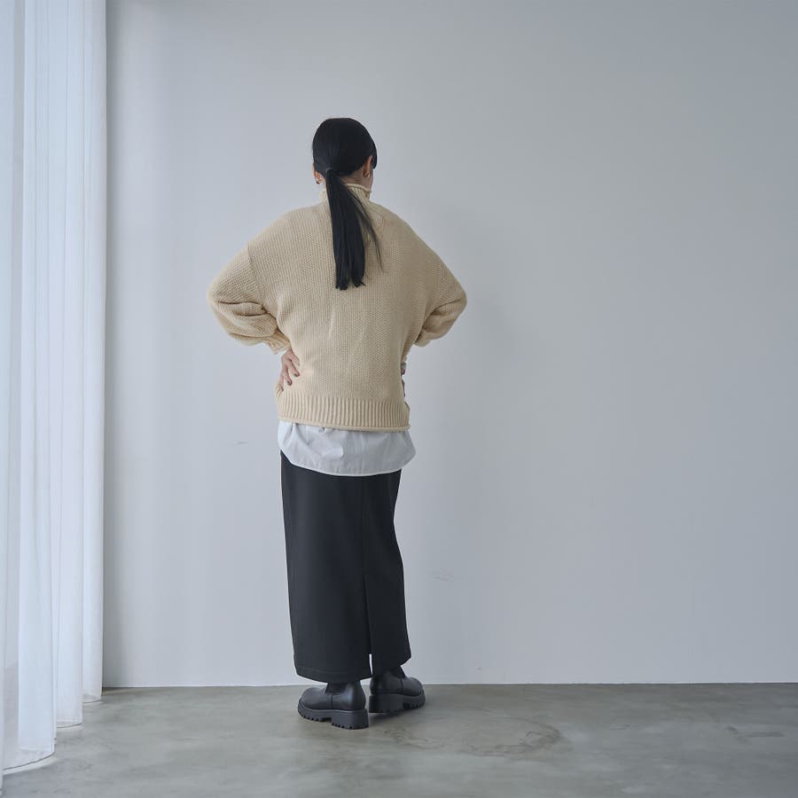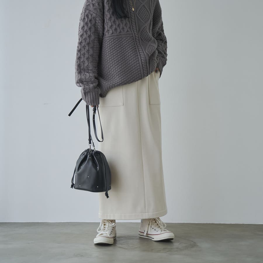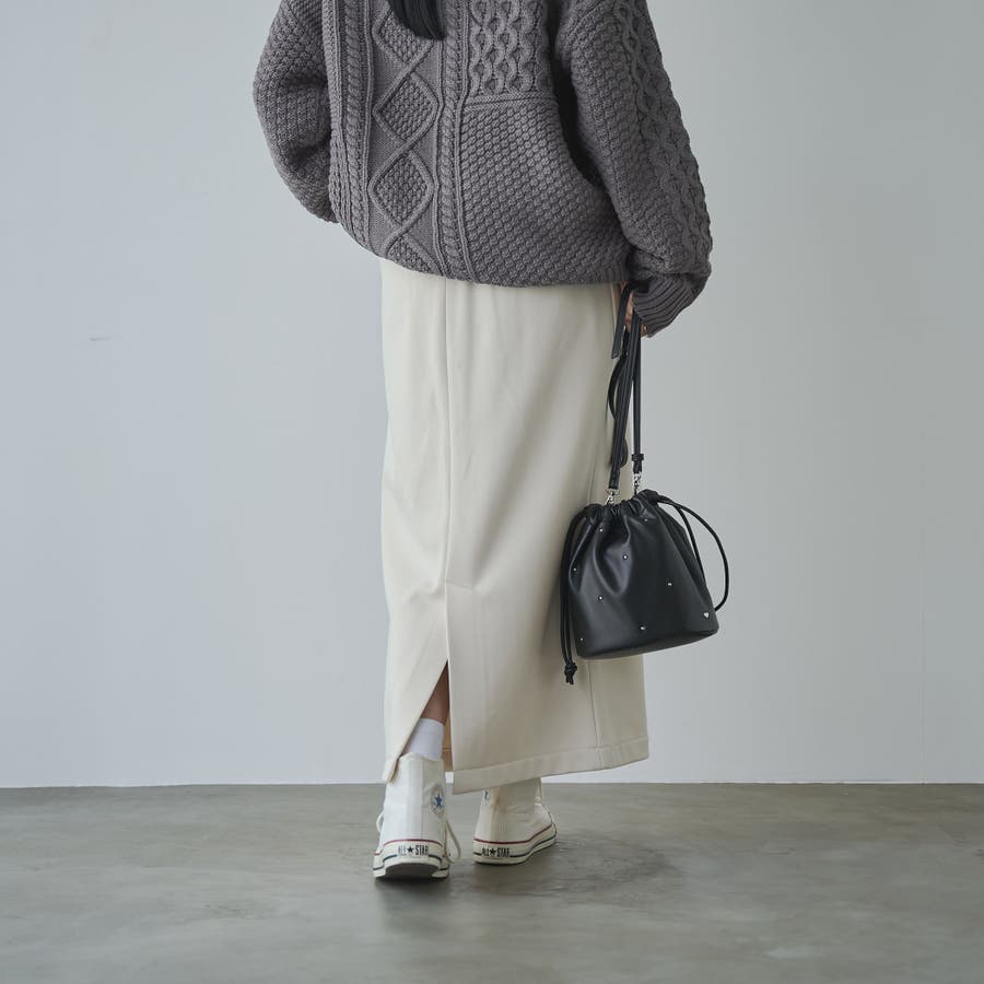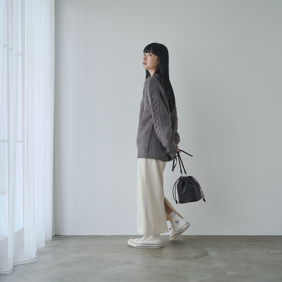 表面感のあるケーブルニットと合わせるのもおすすめのコーディネートです。