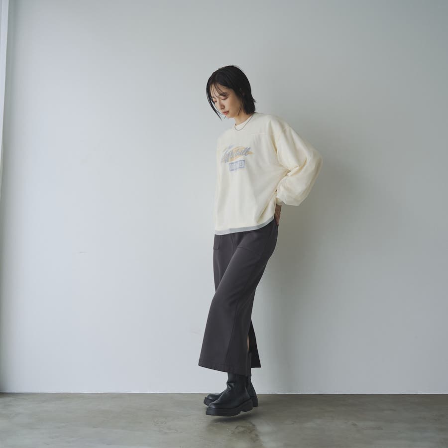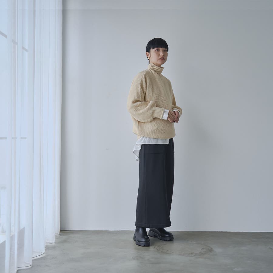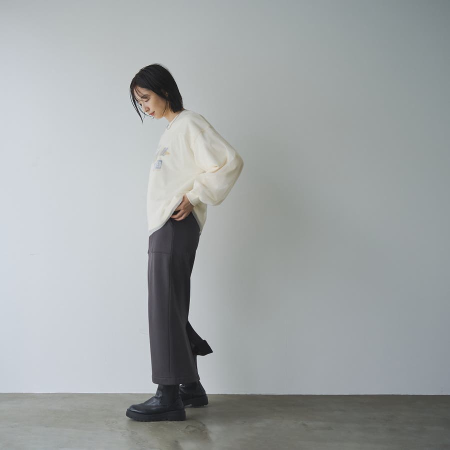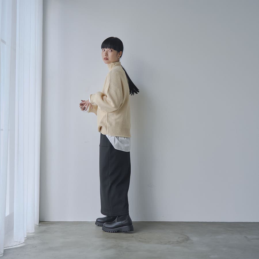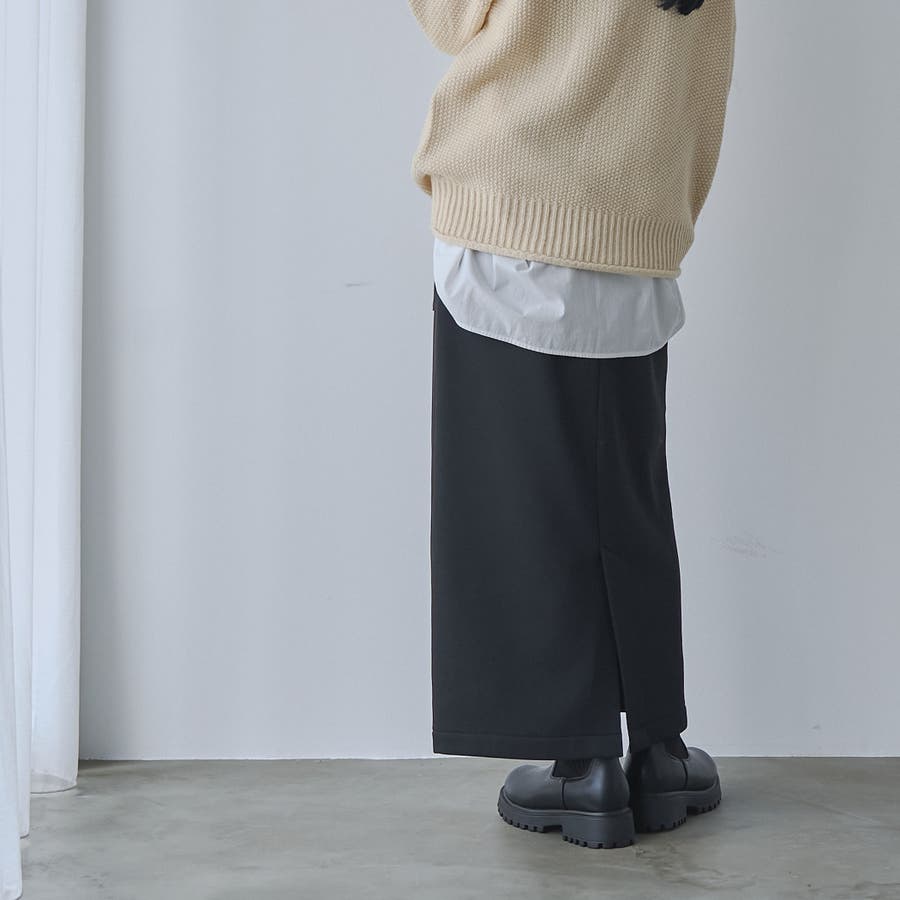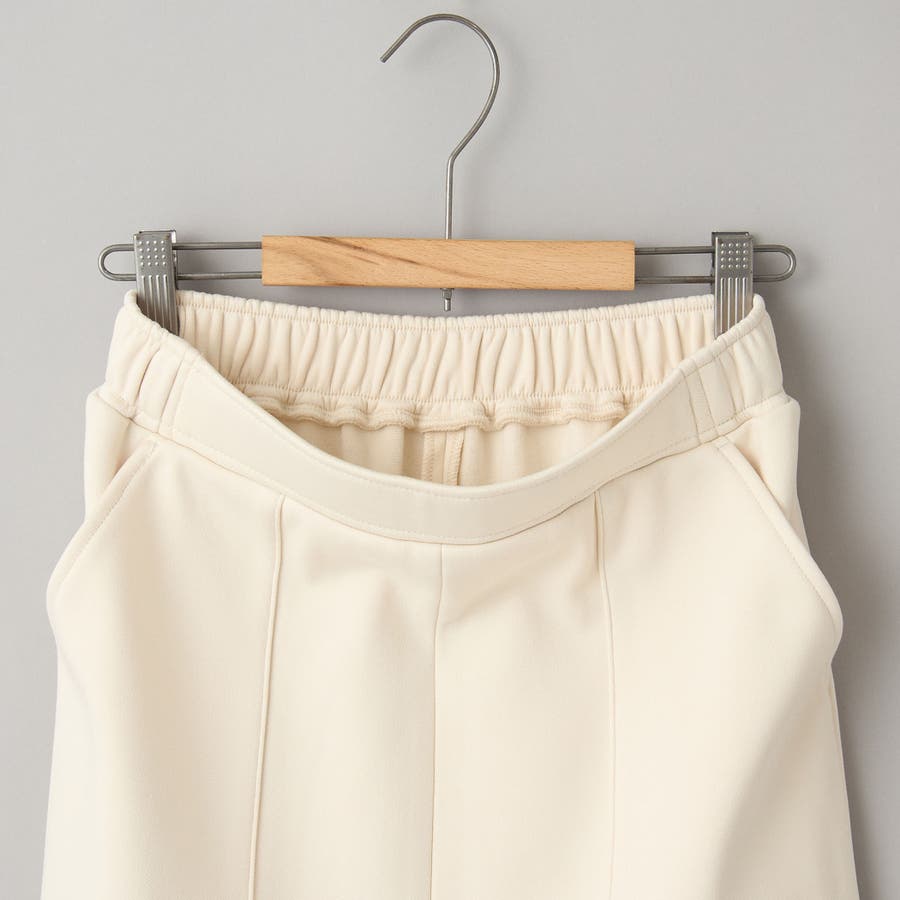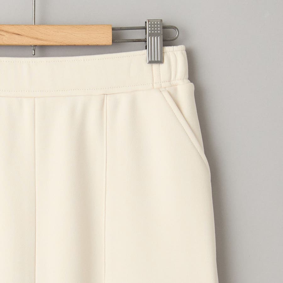 ウエストはゴム入りでフィット感良く着用でき、すっきりとしながらもボディラインを拾いすぎないシルエットです。