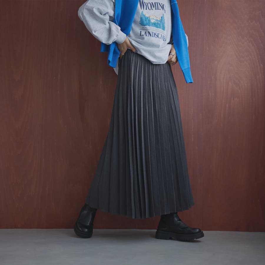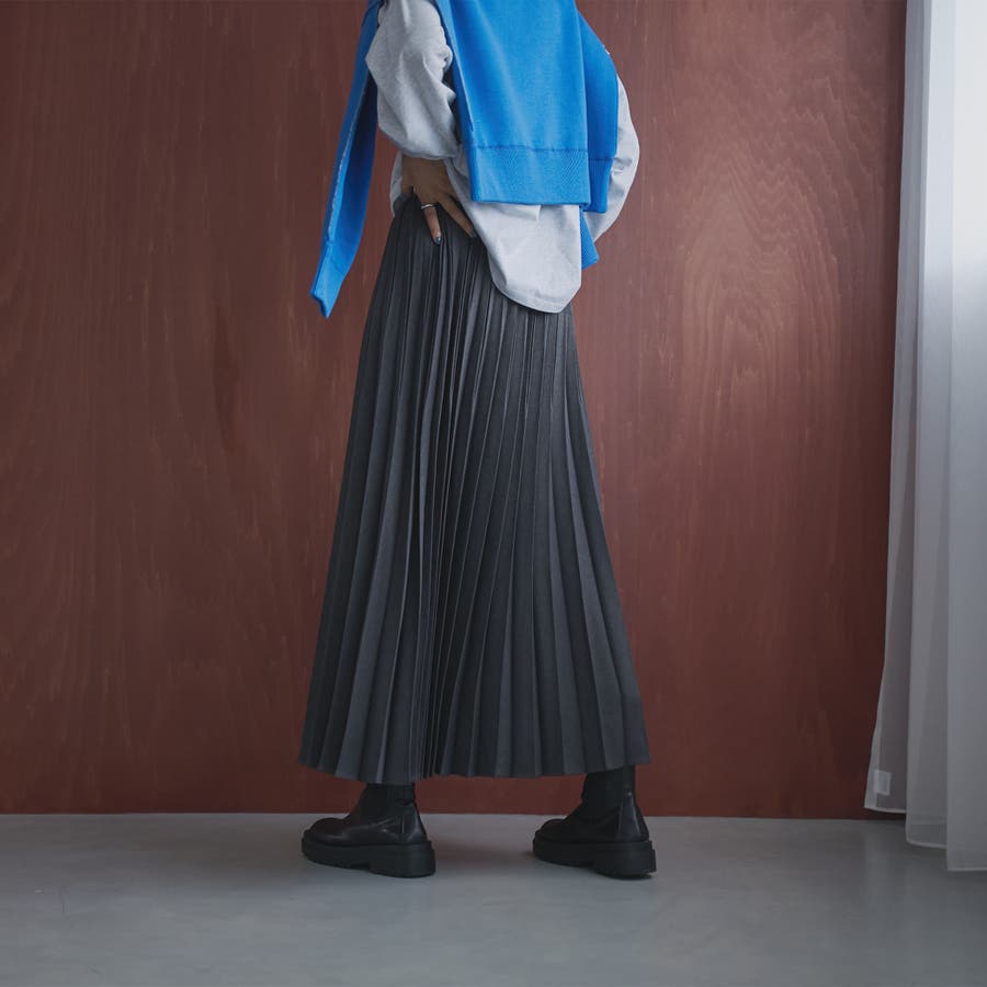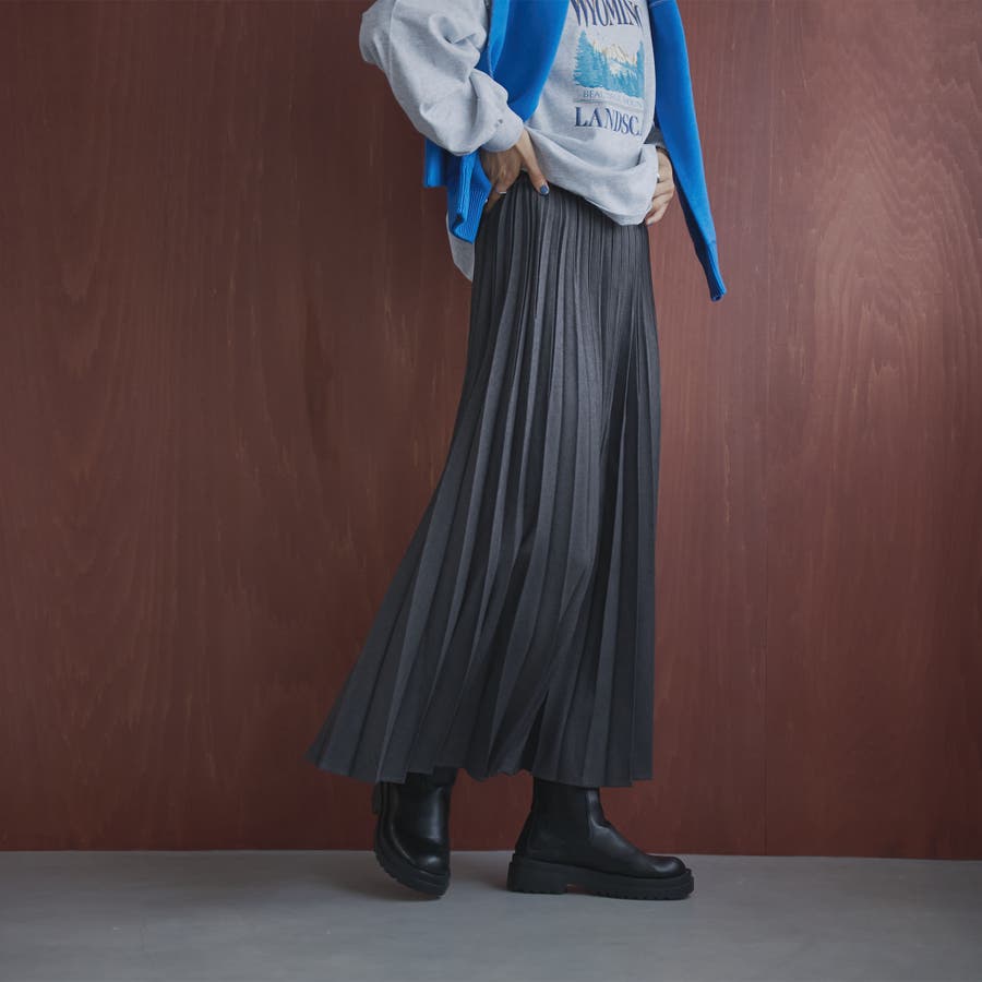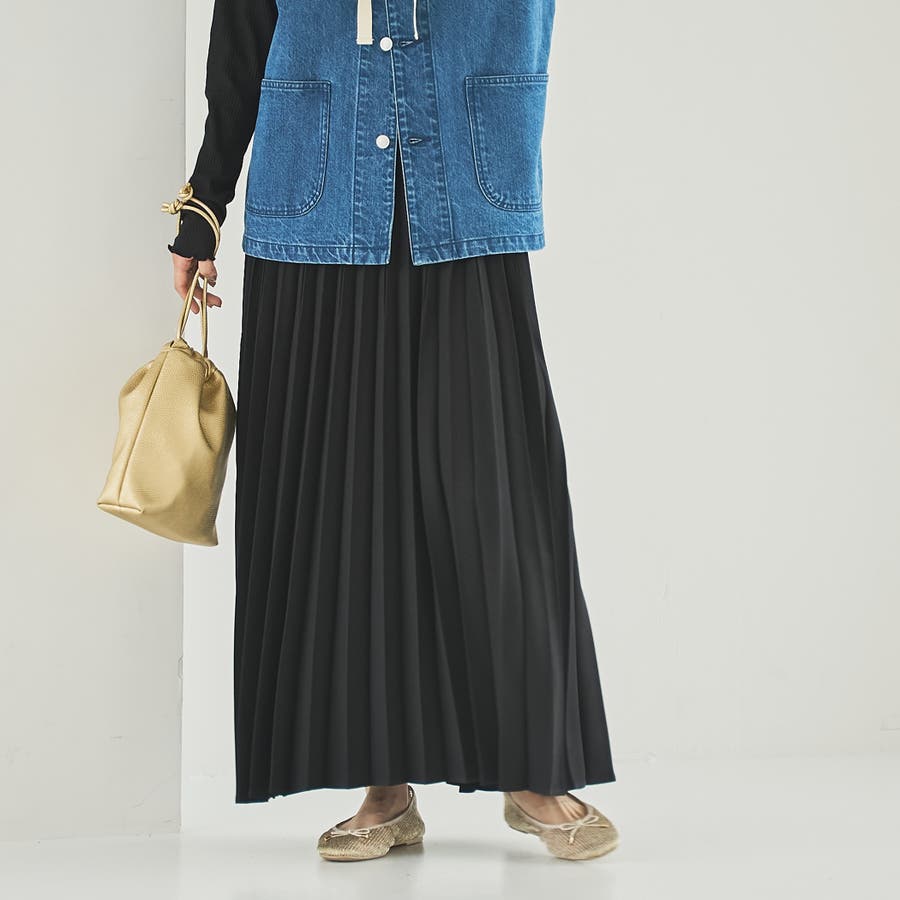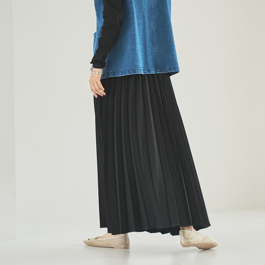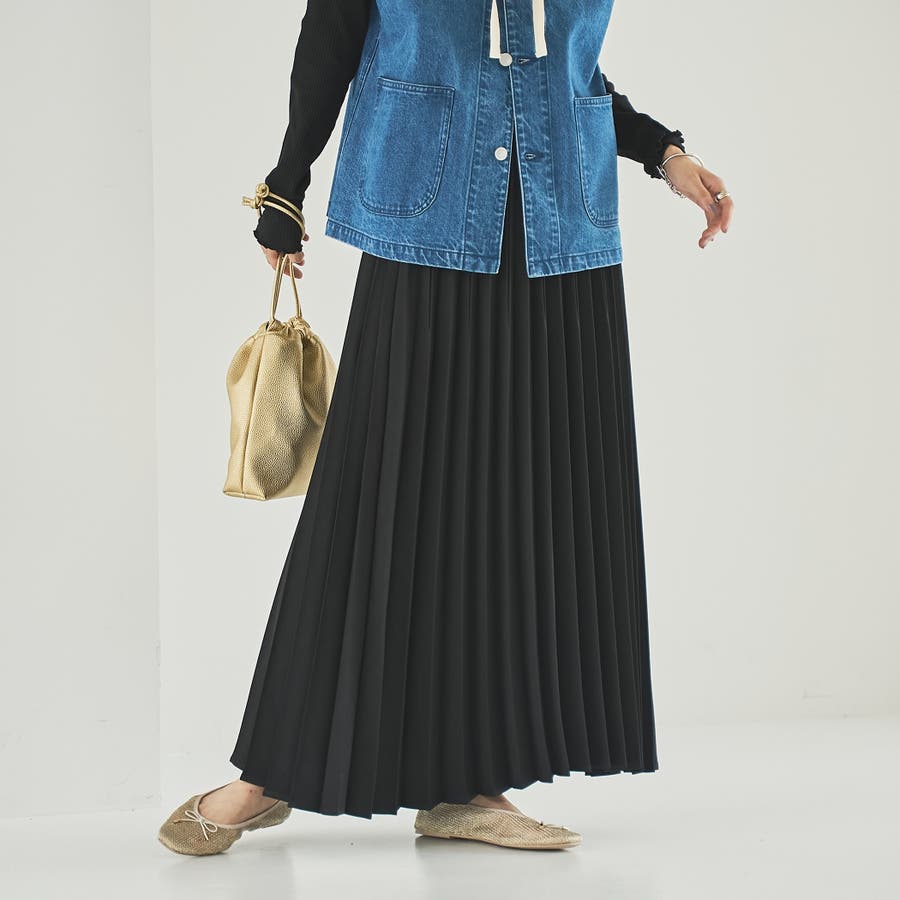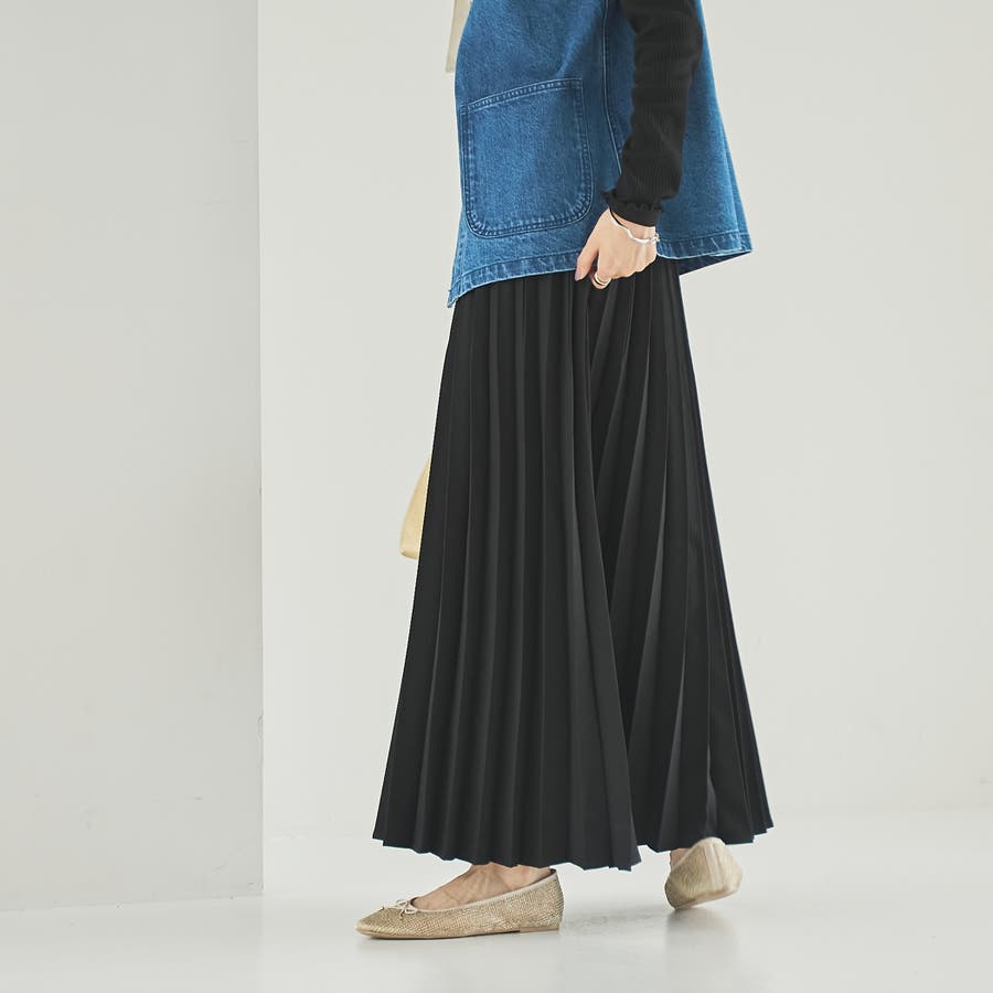 ロング丈×細プリーツが縦のラインを強調し、スッキリと穿きこなせる1枚です。