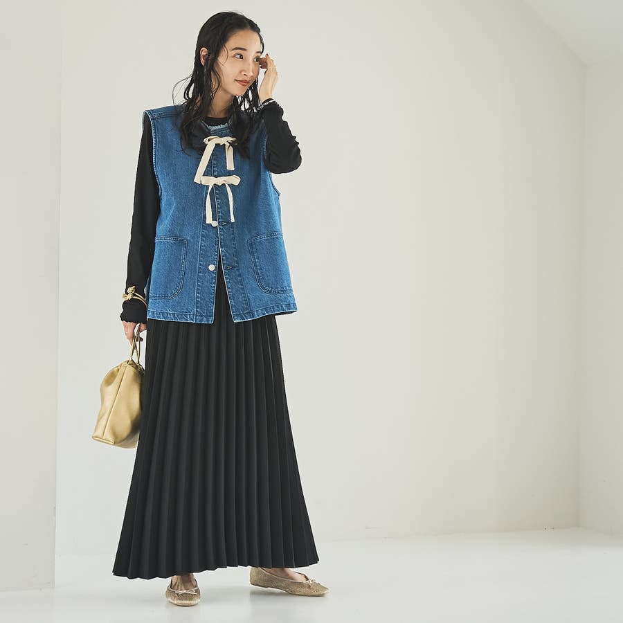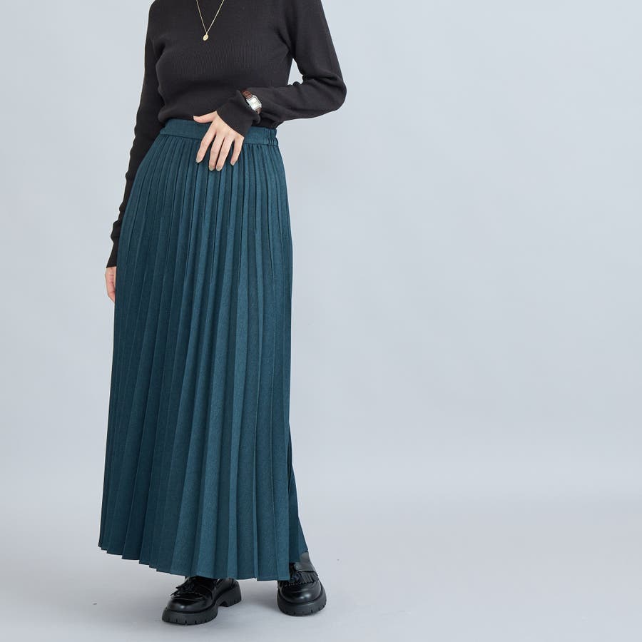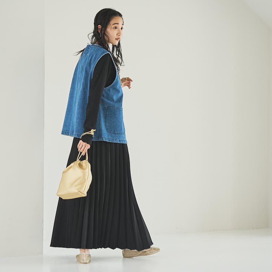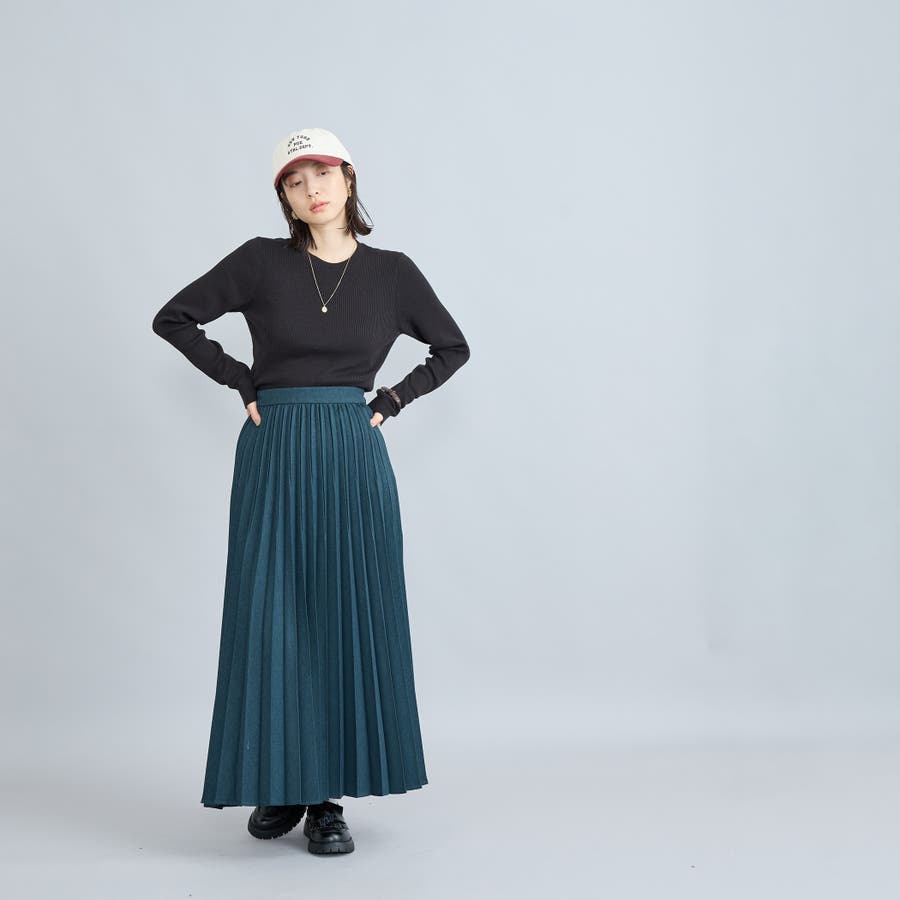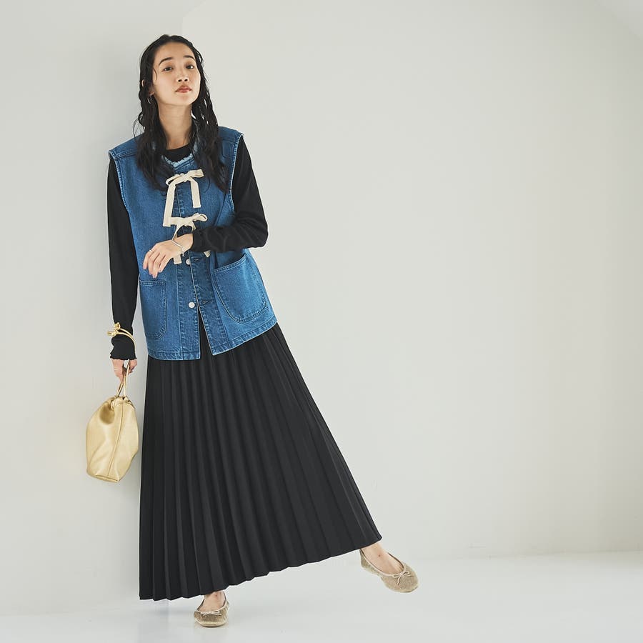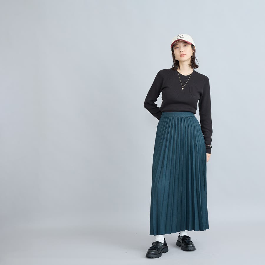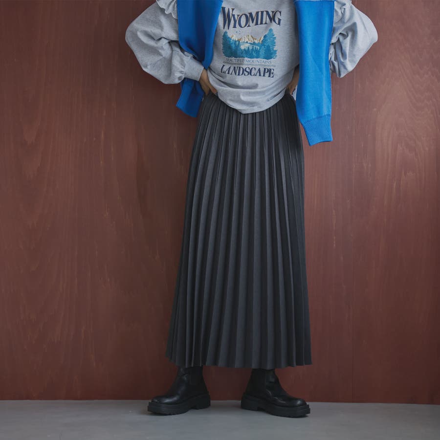 ロング丈×細プリーツが縦のラインを強調し、スッキリと穿きこなせる1枚です。