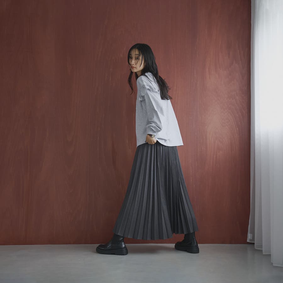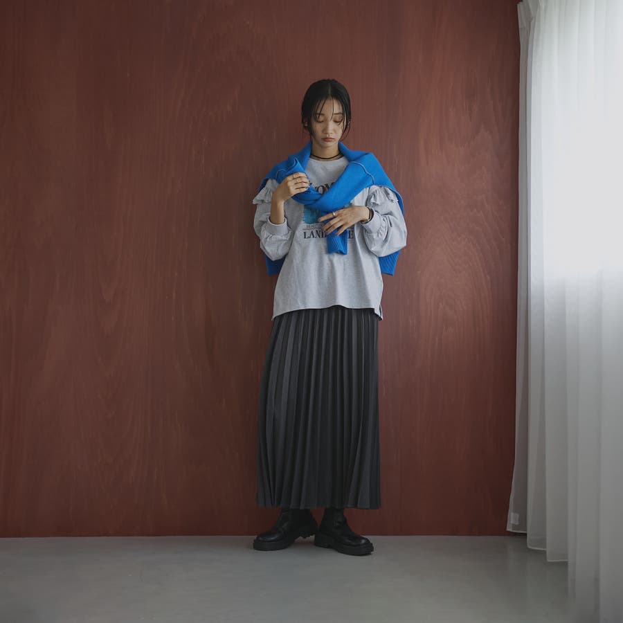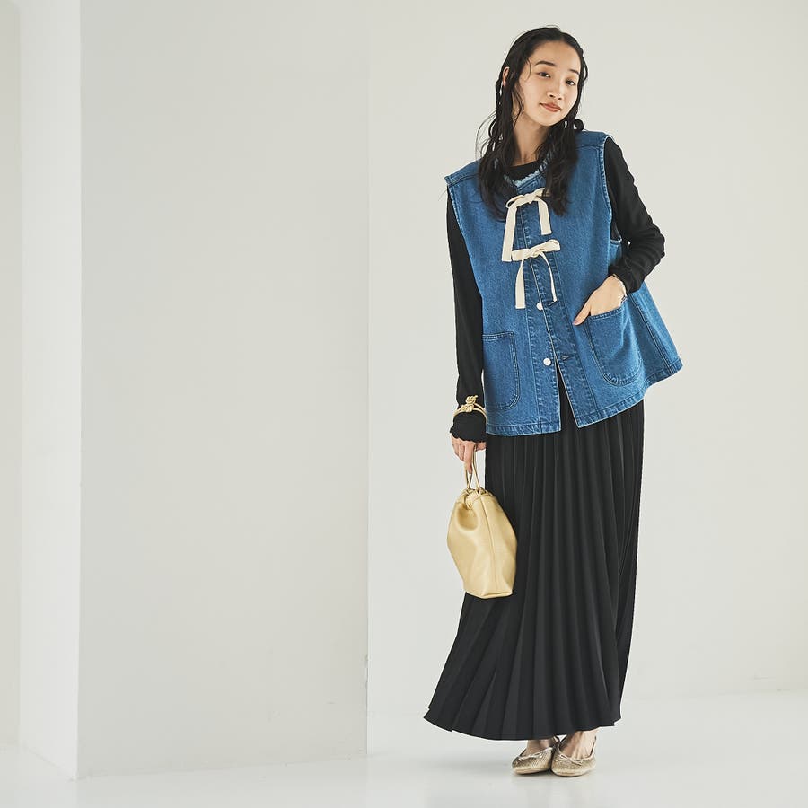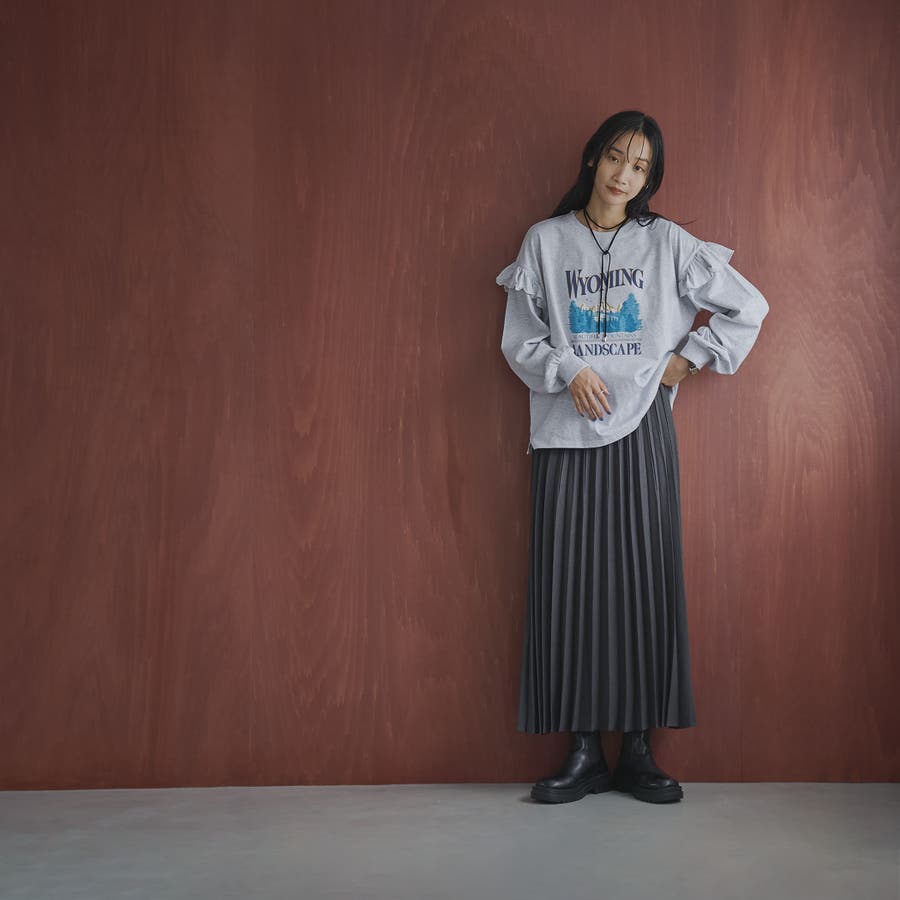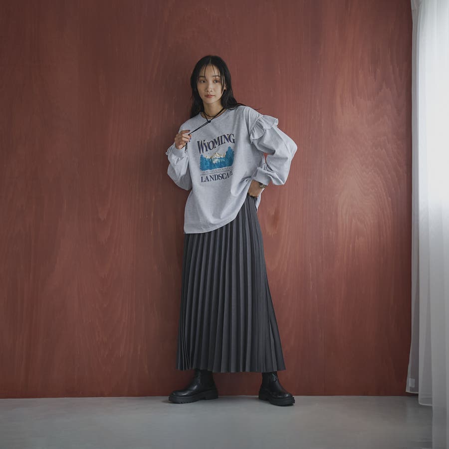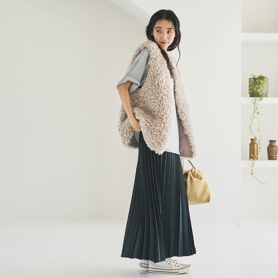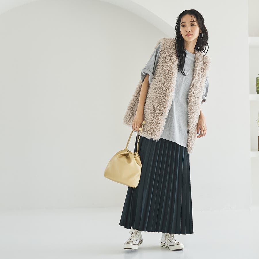 ロング丈×細プリーツが縦のラインを強調し、スッキリと穿きこなせる1枚です。