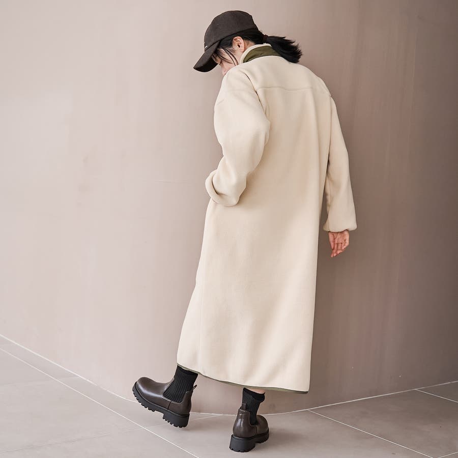 ゆとりあるサイズ感なので厚手のインナーも重ねやすく、季節の変わり目にも活躍する一着です。