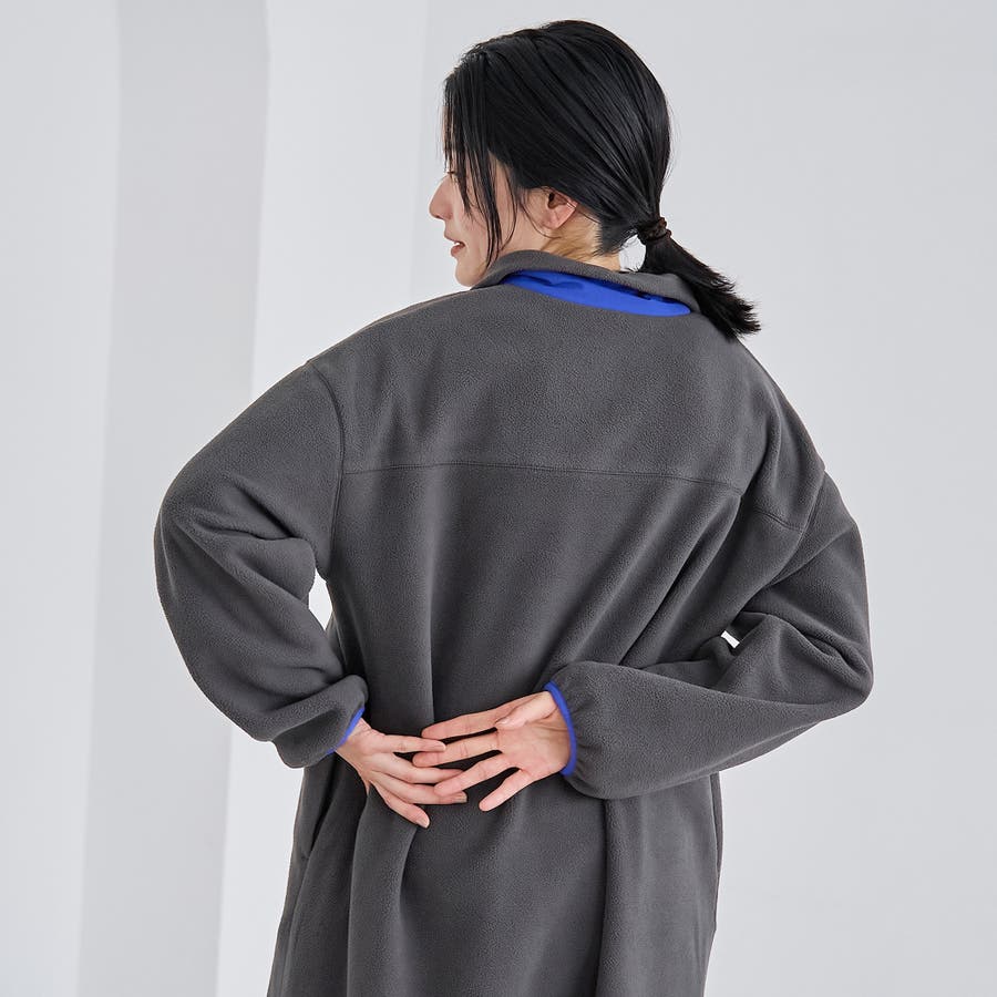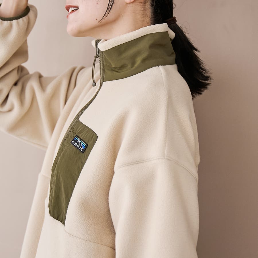 首元のハーフスナップボタンがさりげないアクセントとなったプルオーバーデザインで、温かみのある肌触りの良いフリース素材を使用しています。