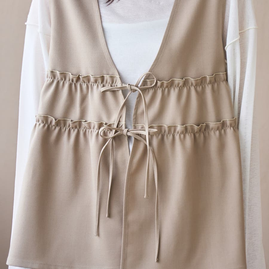 ビスチェはベストタイプ×深めVネックで大人っぽく、フロントギャザーとリボンでさりげなく体型カバー。