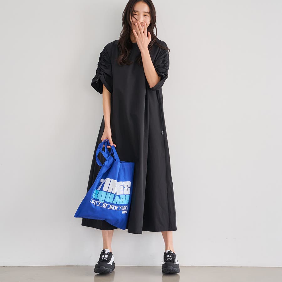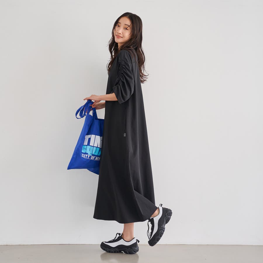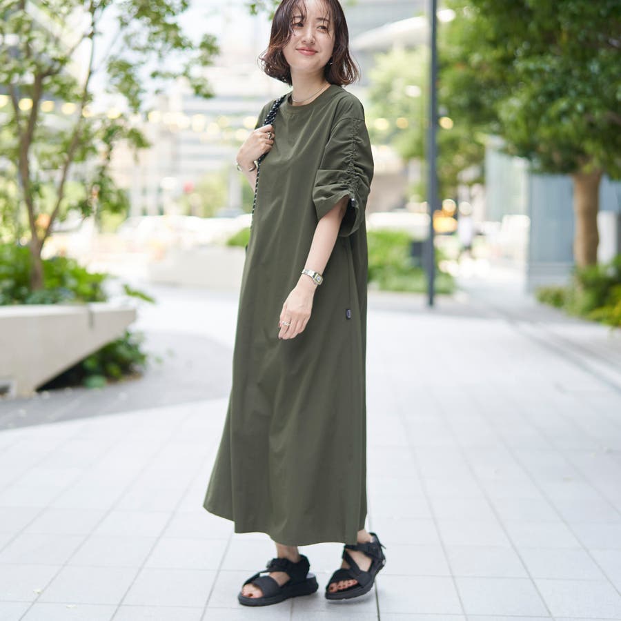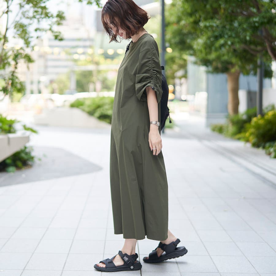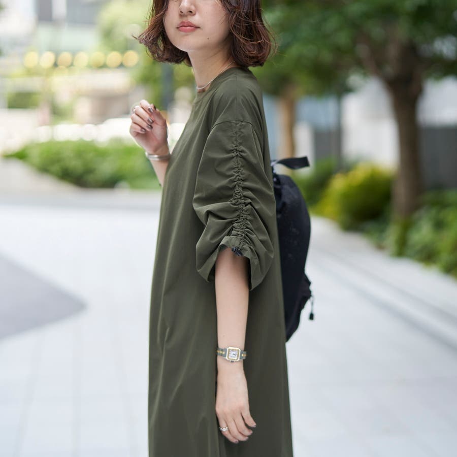 袖のドロストデザインが今年らしいアクセントになり、ゆったりとしたAラインシルエットで体型カバーも◎