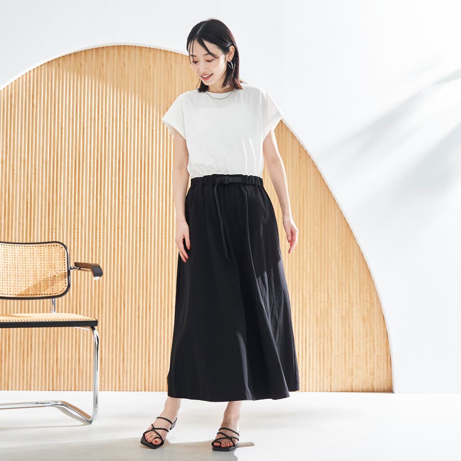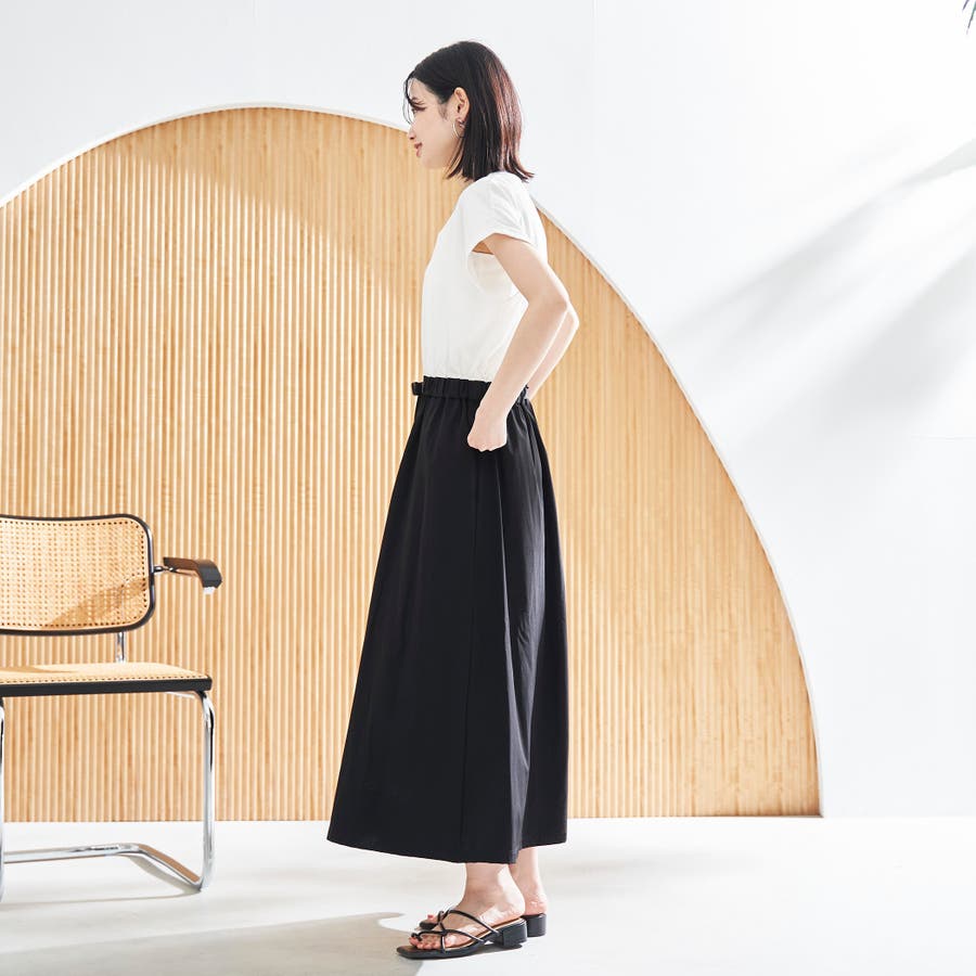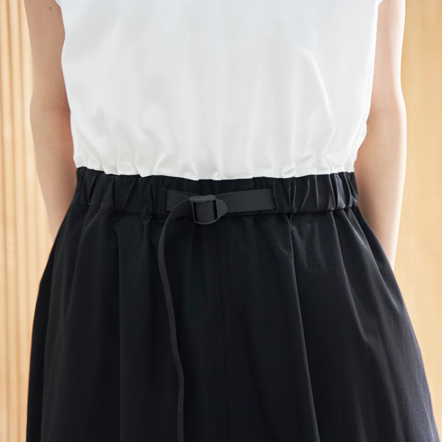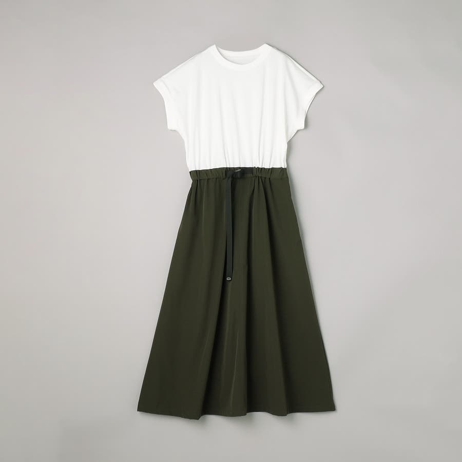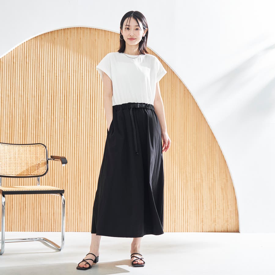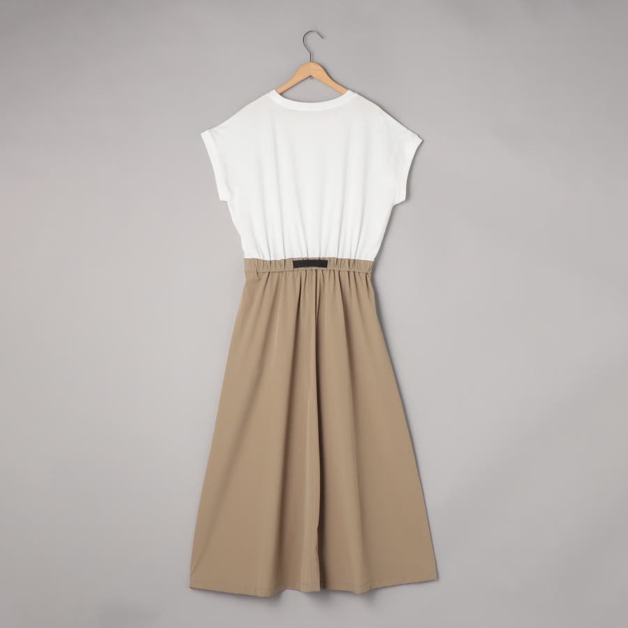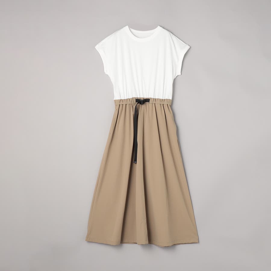 Tシャツ感覚で着られる気軽さと、スカート部分の軽やかなナイロン素材でこなれ感をプラスした、異素材ドッキングワンピース。