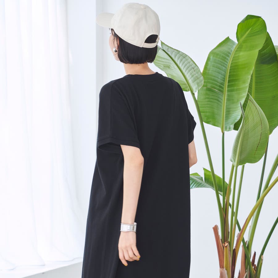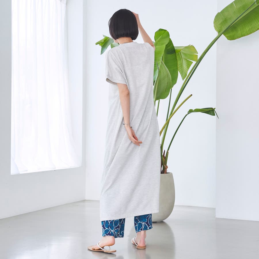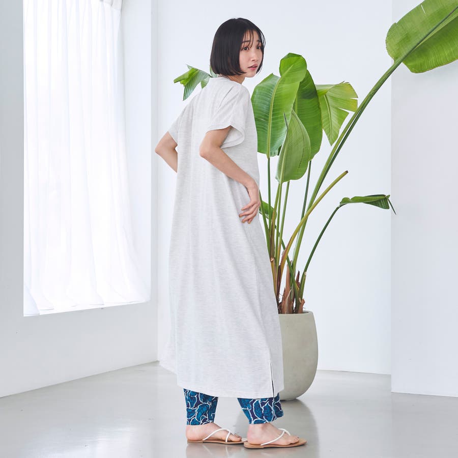 肩まわりをさりげなくカバーするフレンチスリーブと、ゆったりとしたシルエットで、リラクシーながらも抜け感のある印象に。