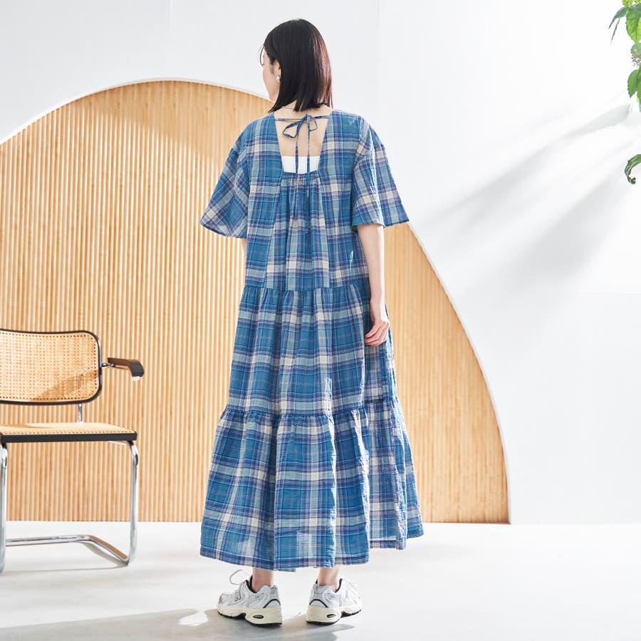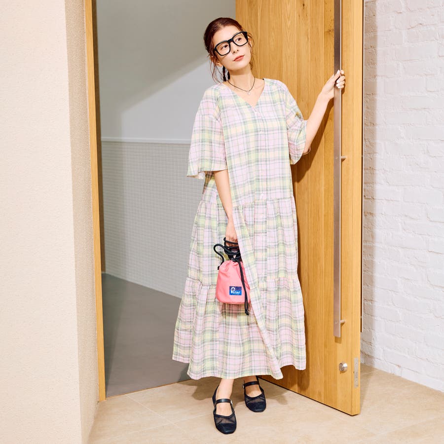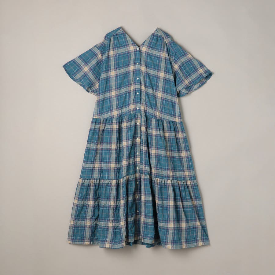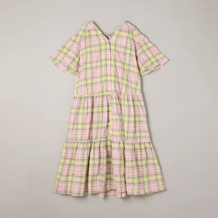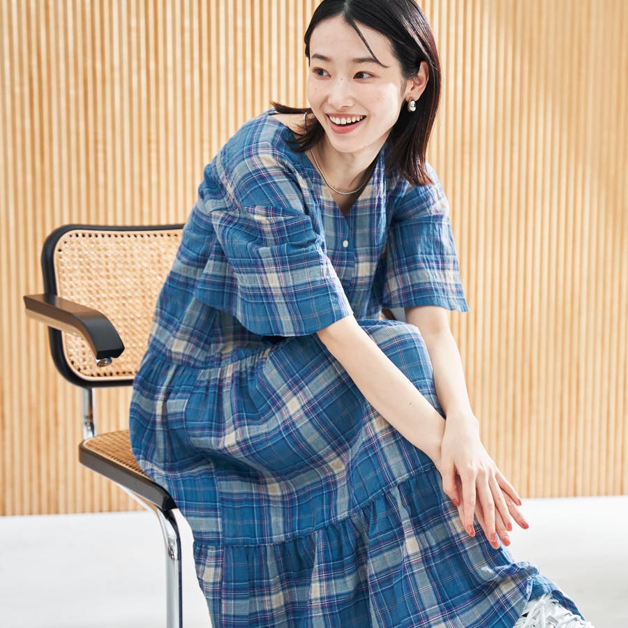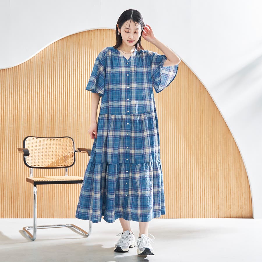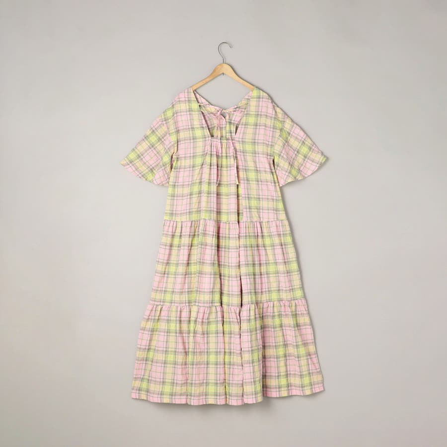 ●さらっとした肌触りと清涼感が魅力のシャーリングチェックを使用したフレアスリーブワンピース