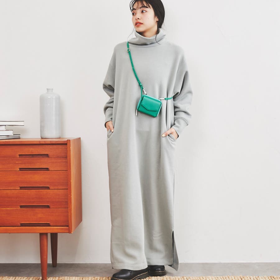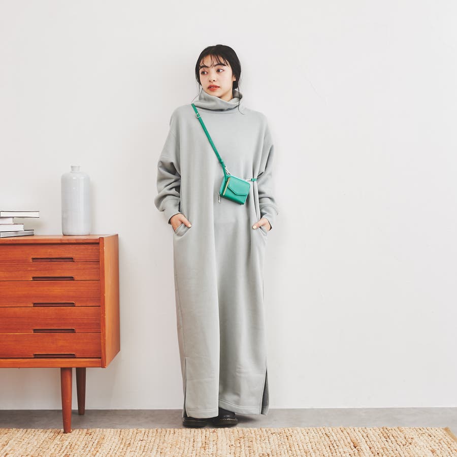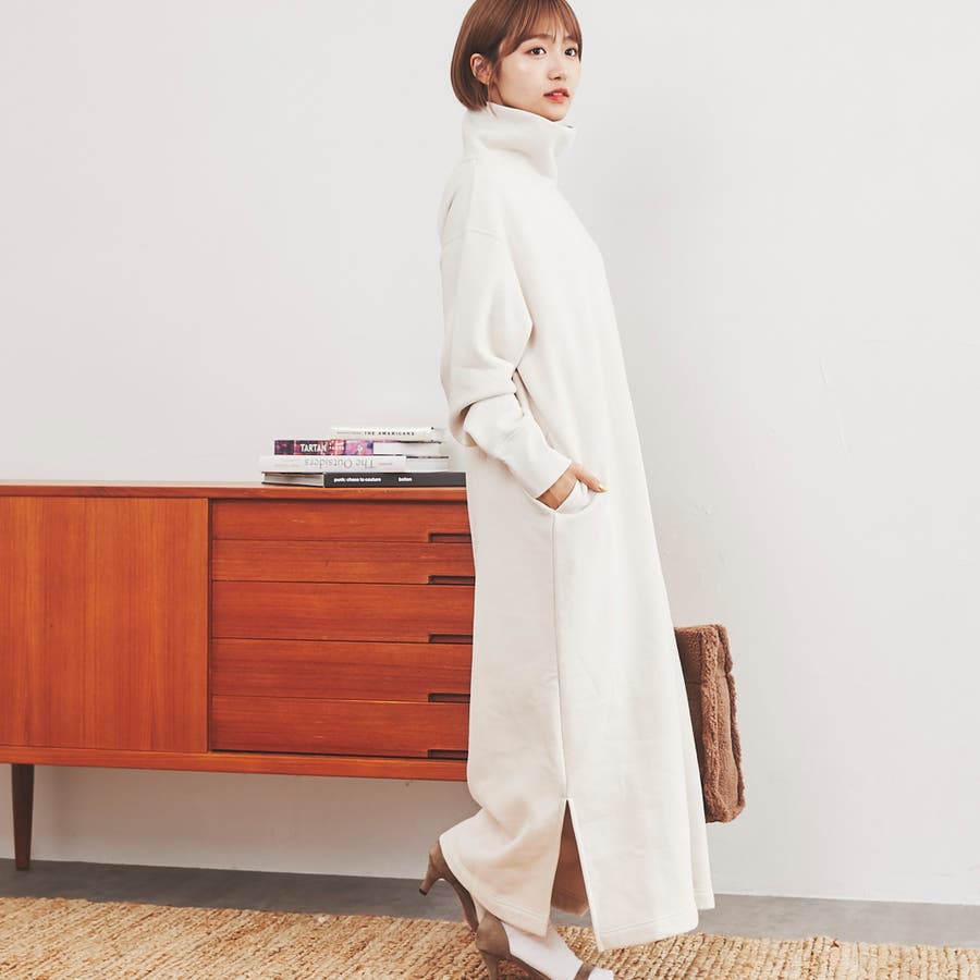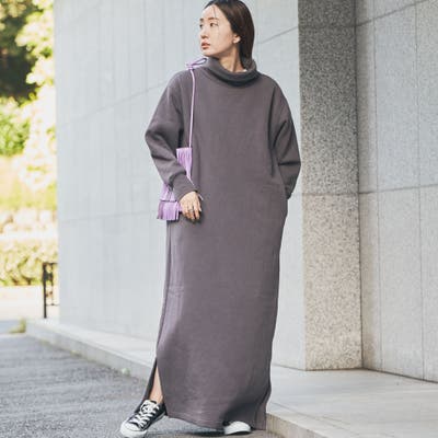 余裕たっぷりのロング丈と少し長めのサイドスリットが、カジュアルな中に女性らしいラフさを演出するタートルネックワンピース。