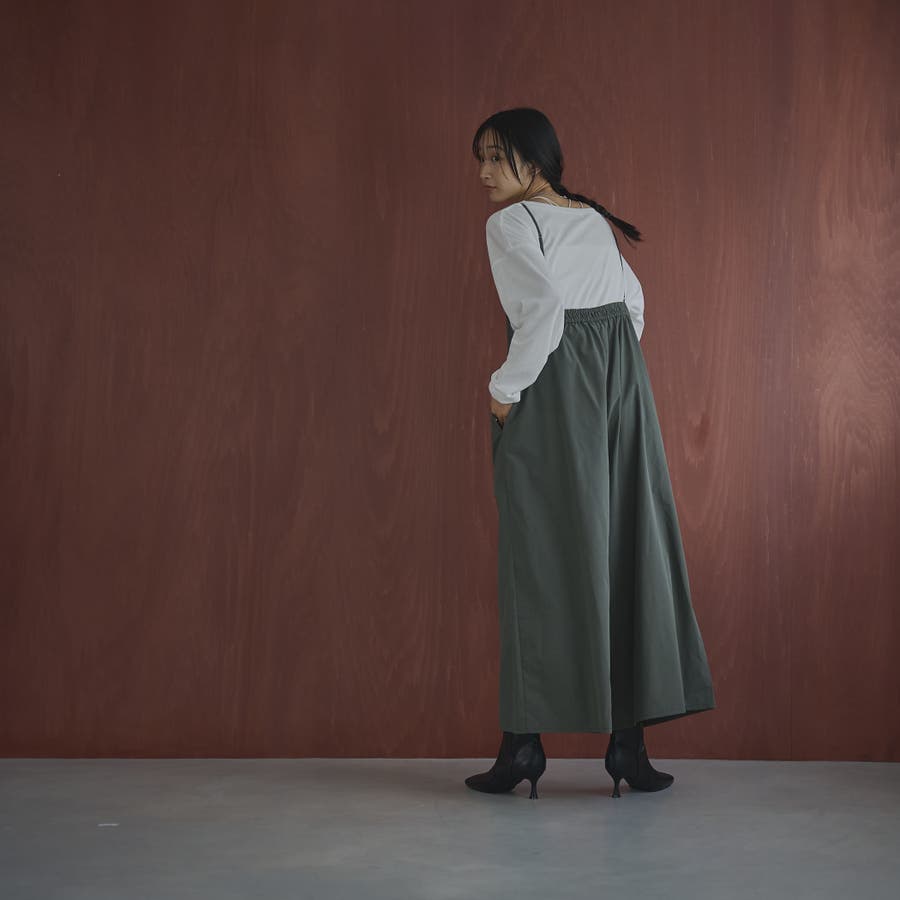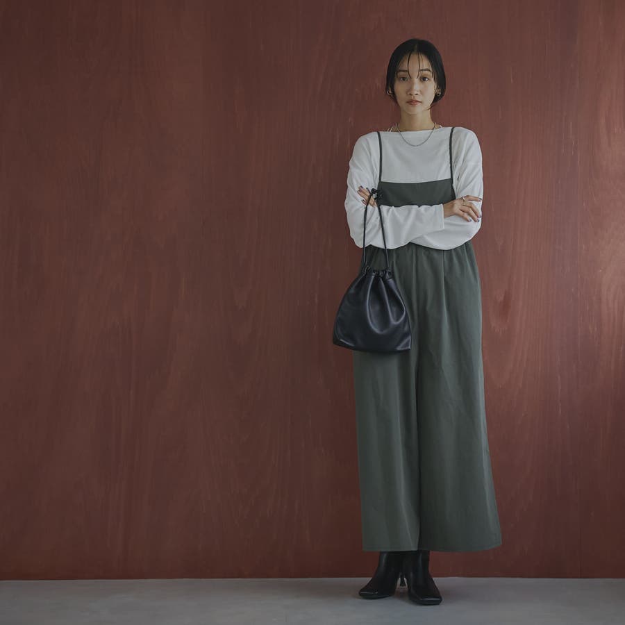 程よく緩さをもたせたトップスと、リラクシーなワイドサロペが楽な着心地です。