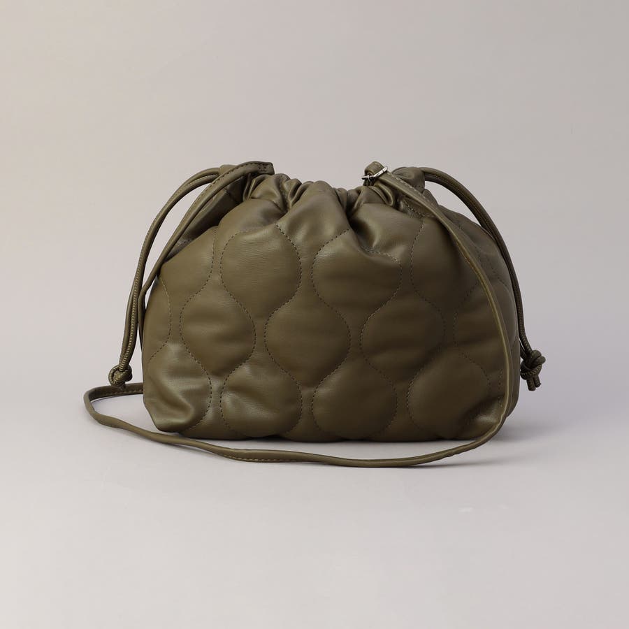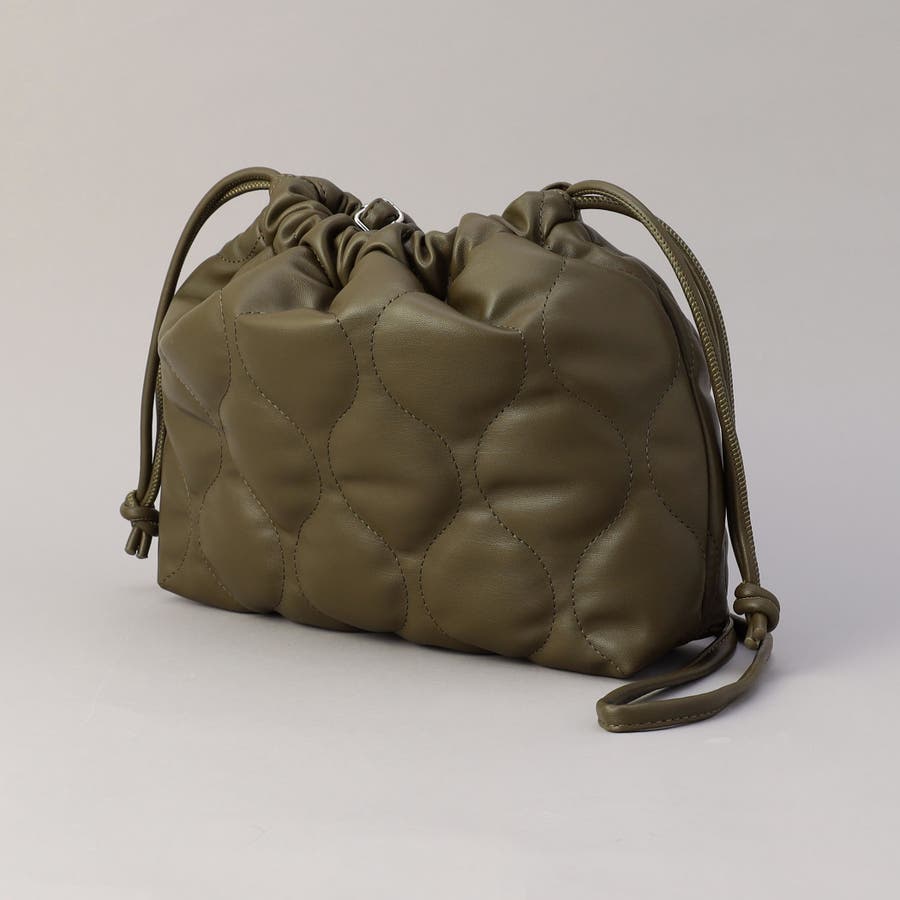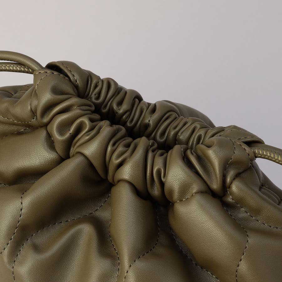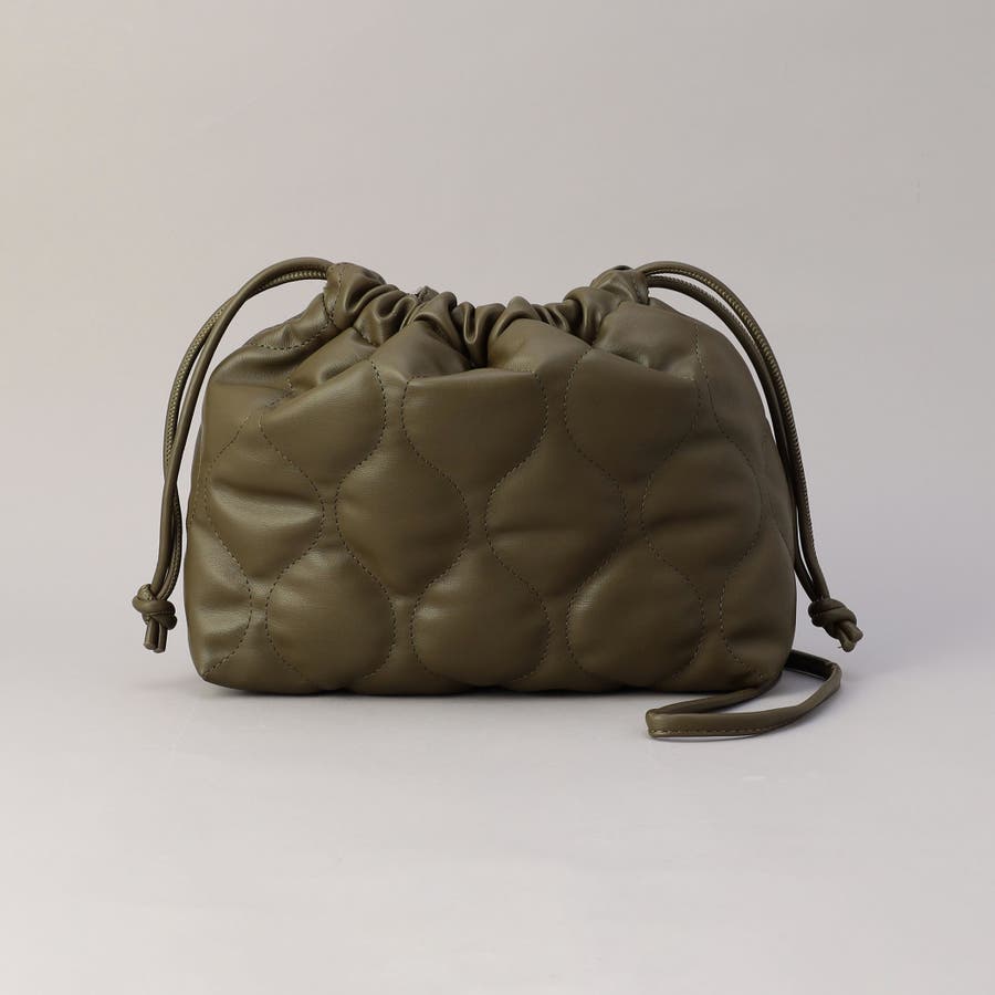 レザーライク素材に瓢箪キルトステッチを施し、カジュアルに仕上げた巾着バッグ。