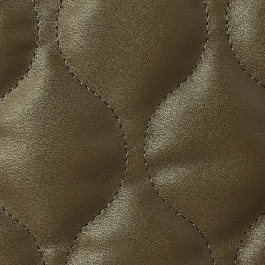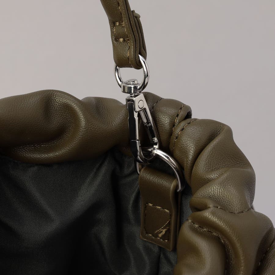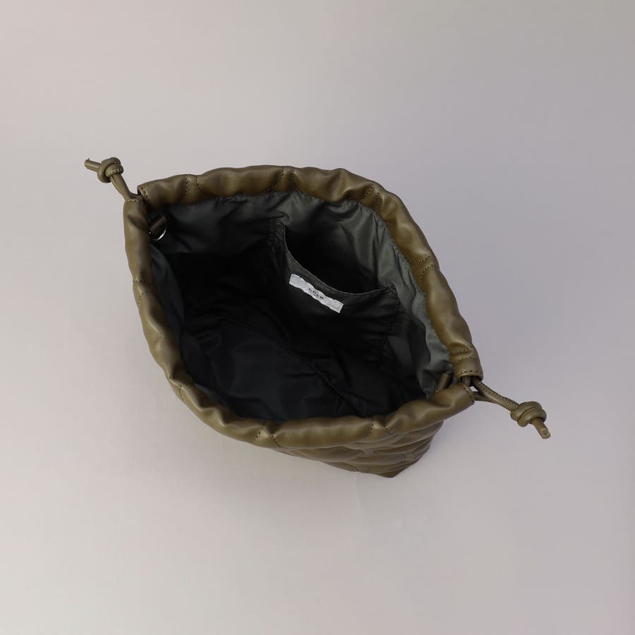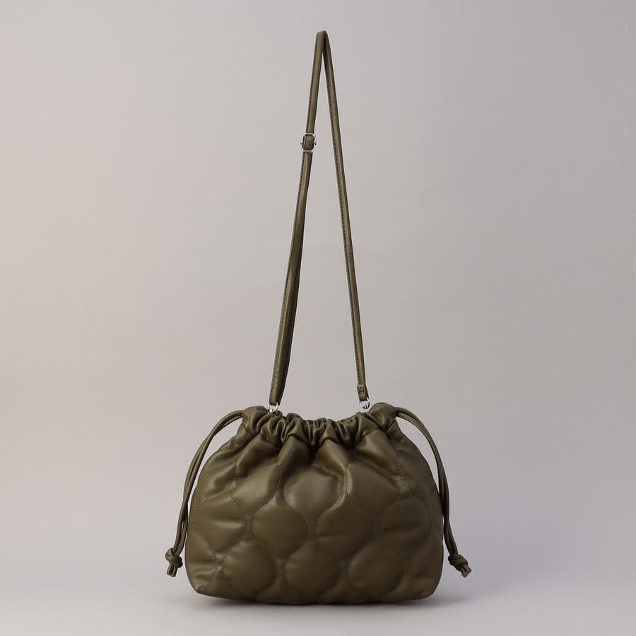 レザーライク素材に瓢箪キルトステッチを施し、カジュアルに仕上げた巾着バッグ。