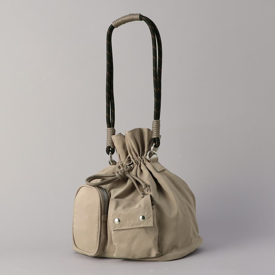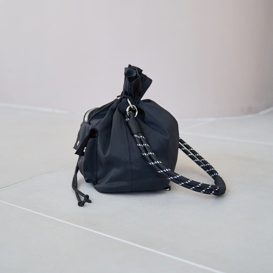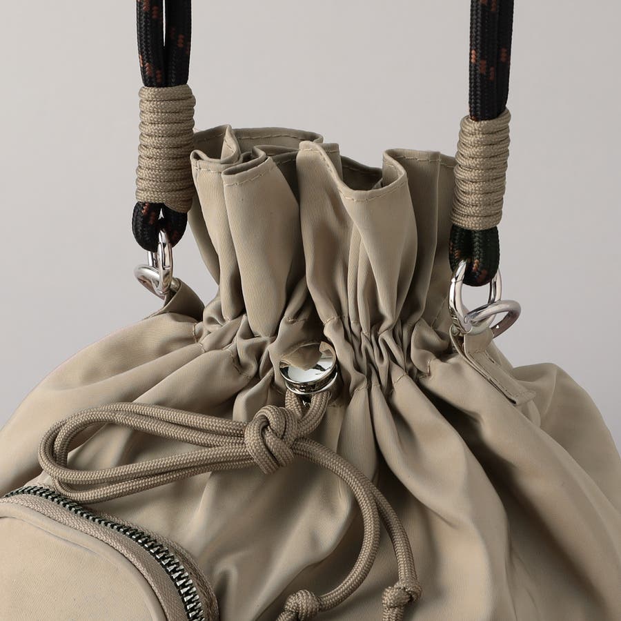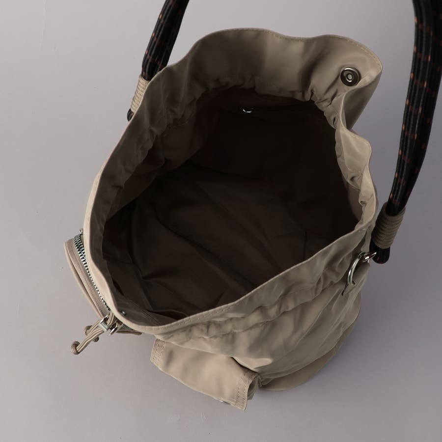口元はドローストリング仕様ながら、サイドにはジップ付きで中身の出し入れもスムーズ。