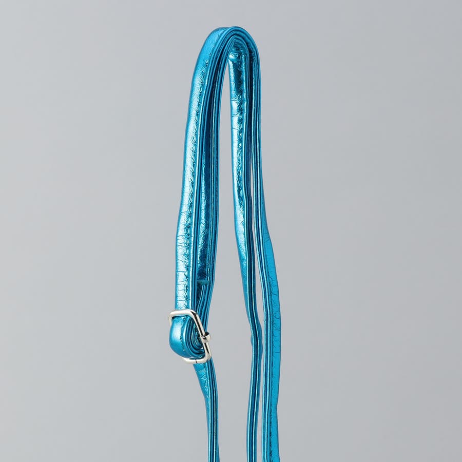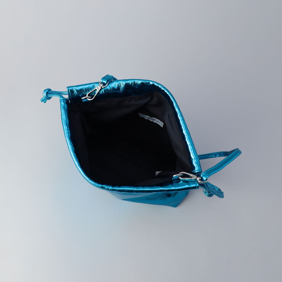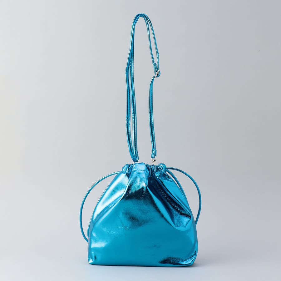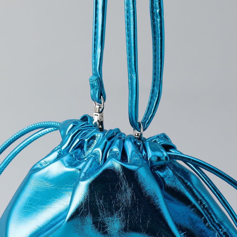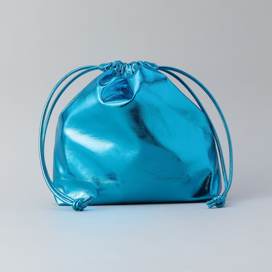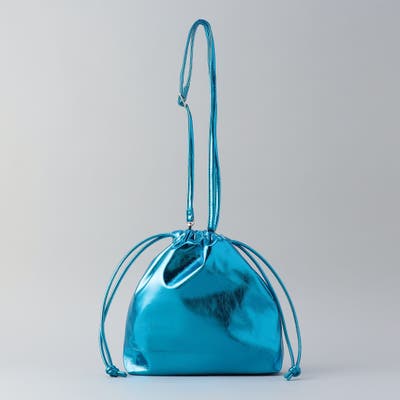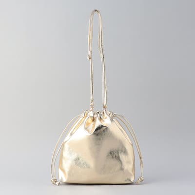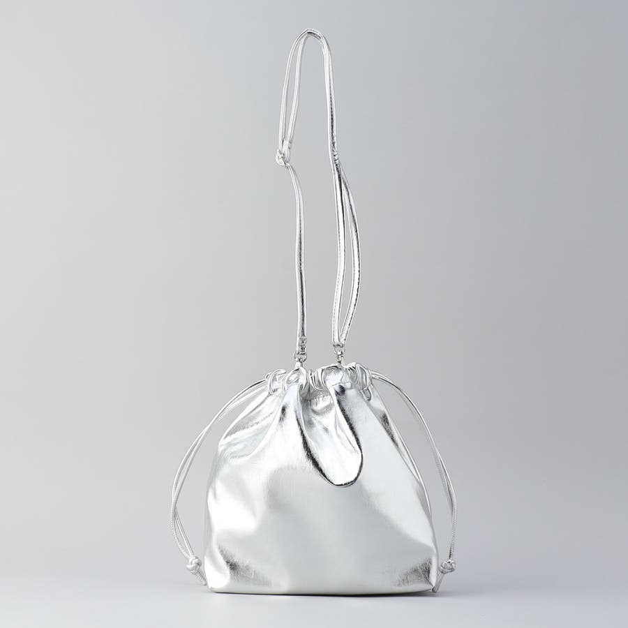 トレンドのメタリック素材が目を引く巾着ショルダーバッグ。