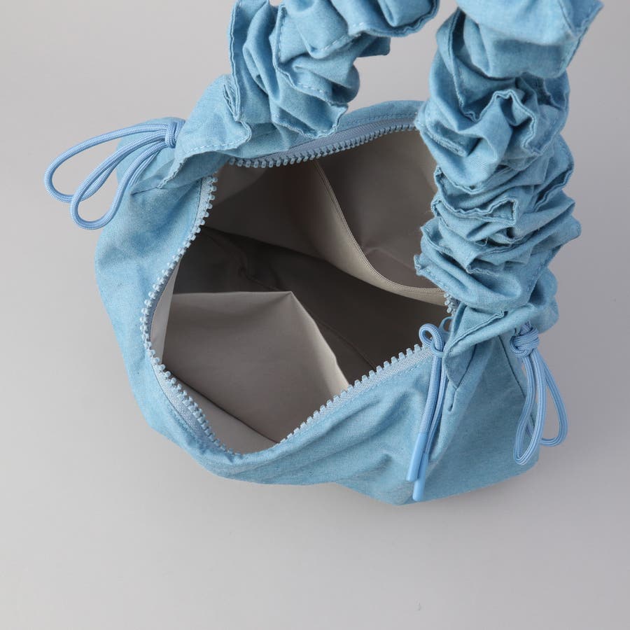 フリルのようにも見えるギャザーハンドルが印象的なショルダーバッグ。