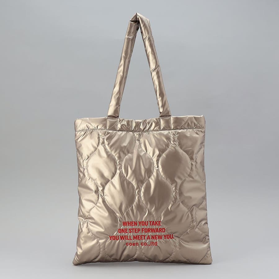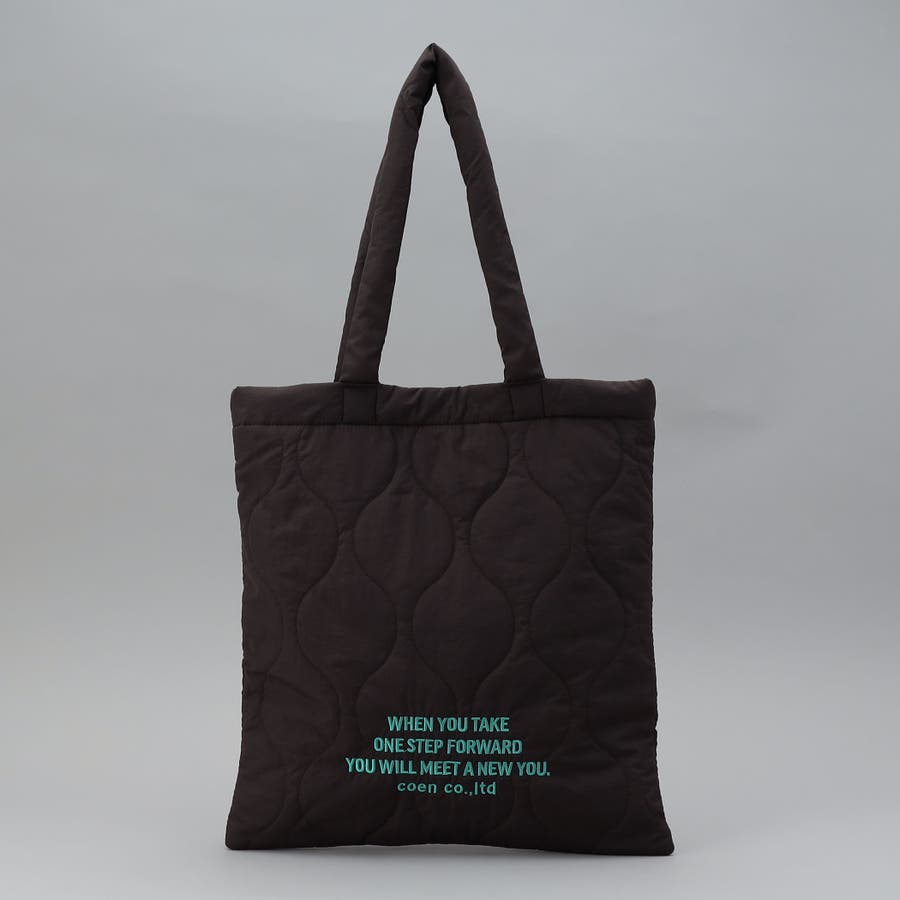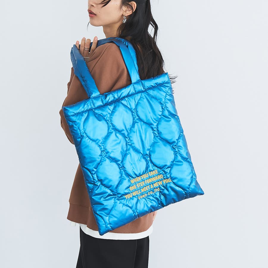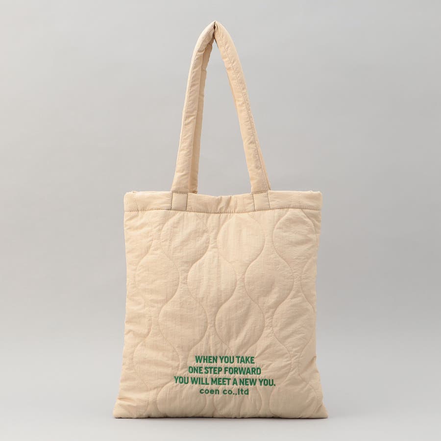 ロゴ刺繍でアクセントを添えたキルティングトートバッグ。