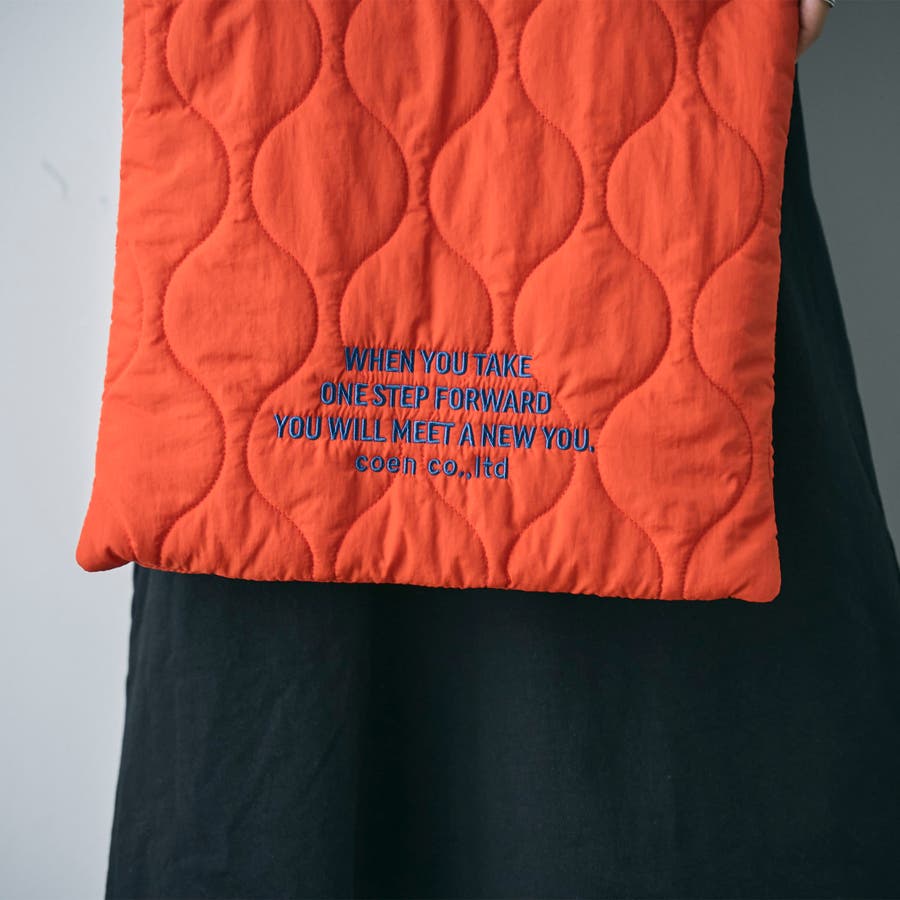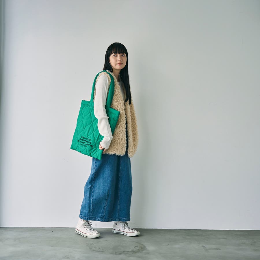 ふんわり柔らかなキルティング素材を使い、薄マチの縦型シルエットに仕上げています。