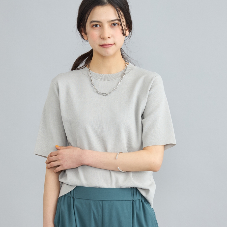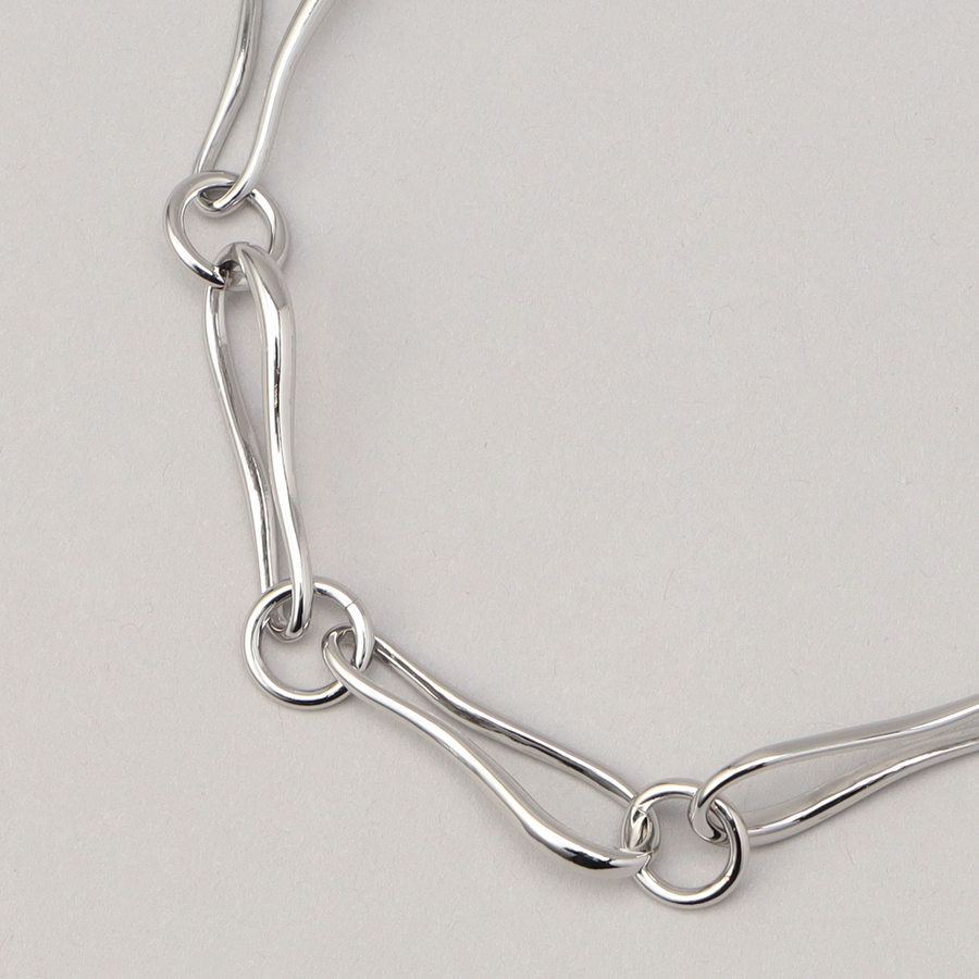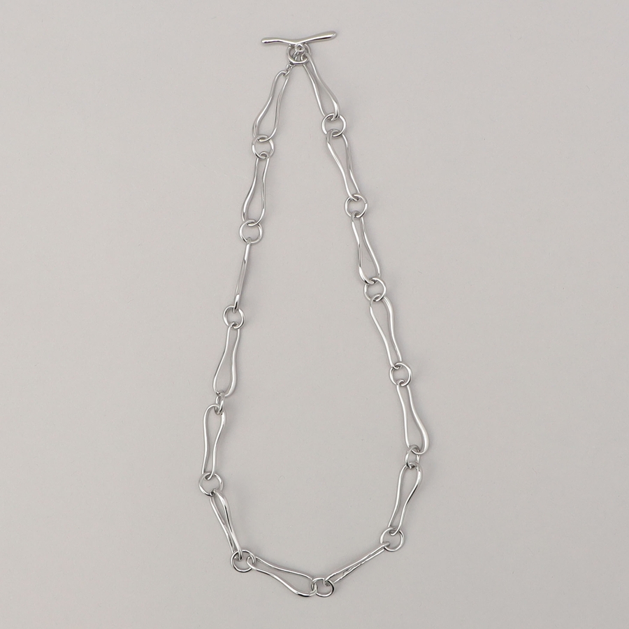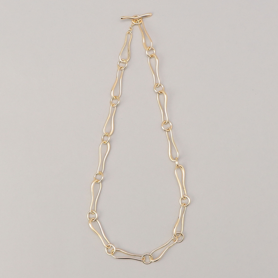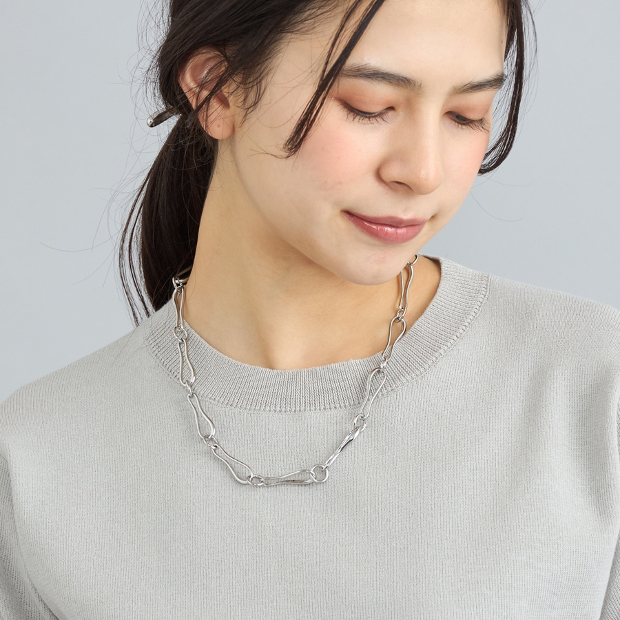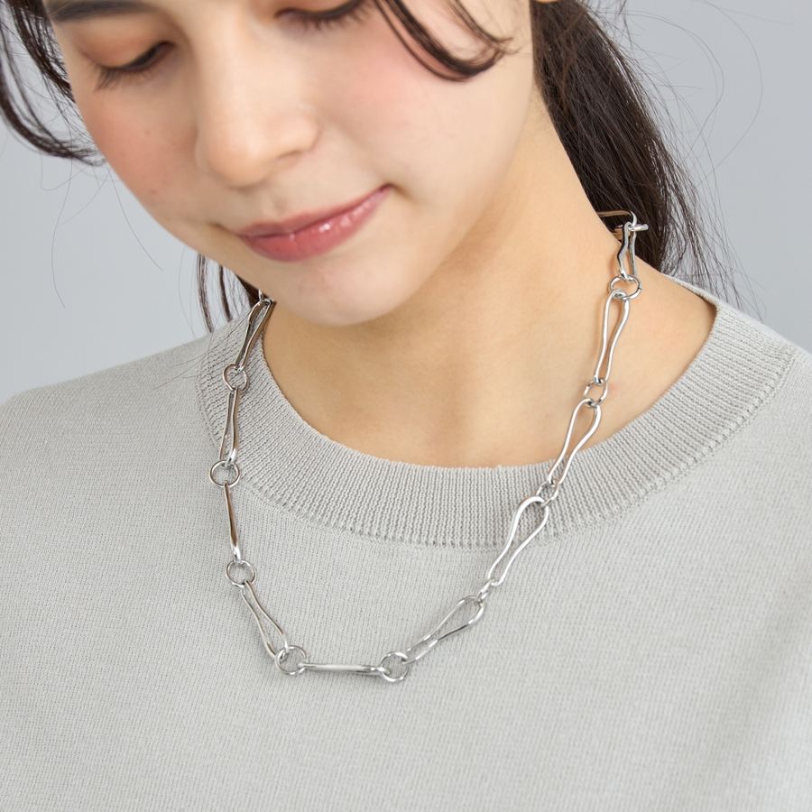 大ぶりなニュアンスパーツを連ねたチェーンネックレス。2重に巻くとブレスレットにもアレンジできる2WAY仕様です。パーツのどこにでもTバーが留められるので、お好みの長さに調整可能。そのままの向きでも、マンテル側を前にしても使えるデザインです。ほどよく存在感があるため、シンプルになりがちなワンツーコーデや首元が寂しいトップスのアクセントにぴったり。こちらひとつでお顔まわりを華やかに見せてくれます。