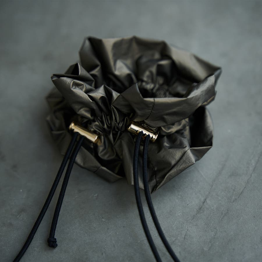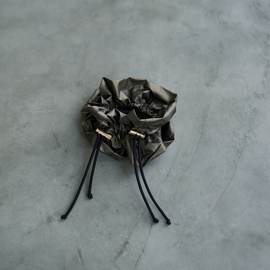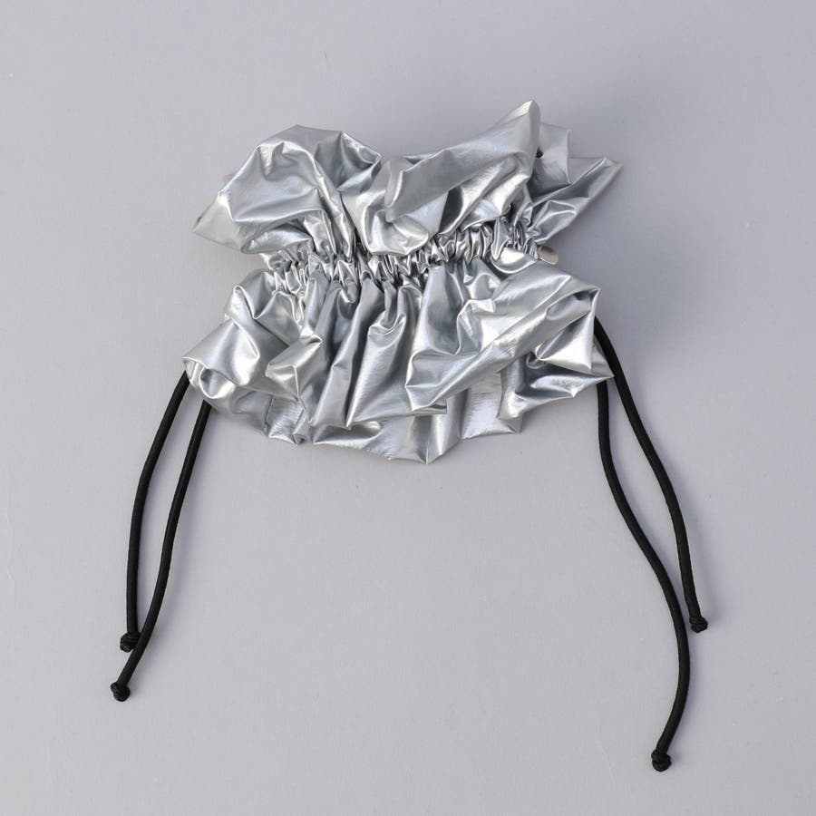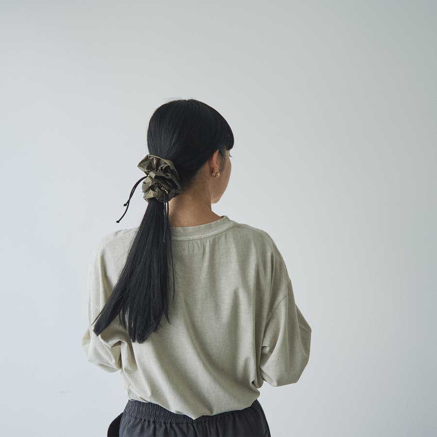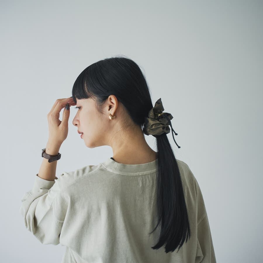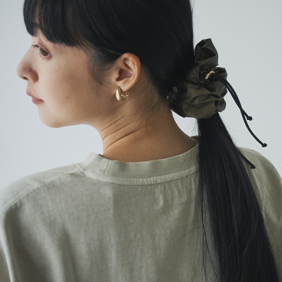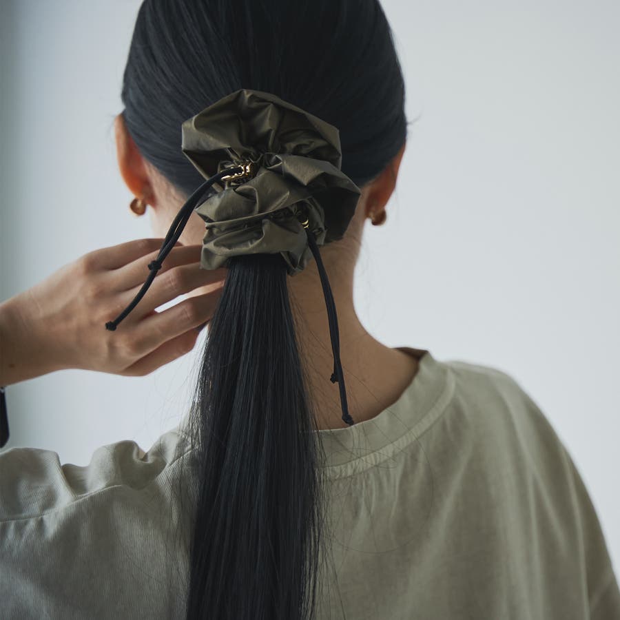 光沢感とドロストデザインでトレンド感をプラスし、甘さを抑えたシュシュ。
