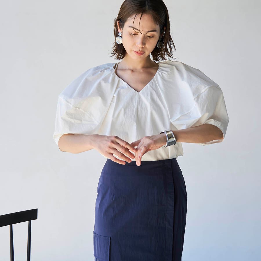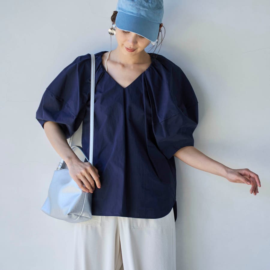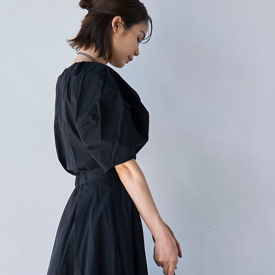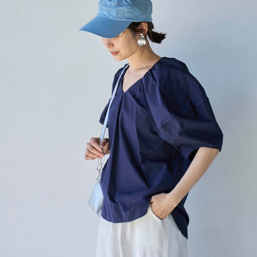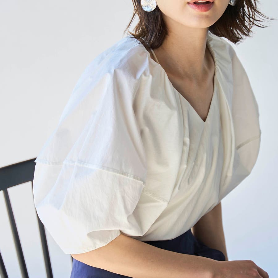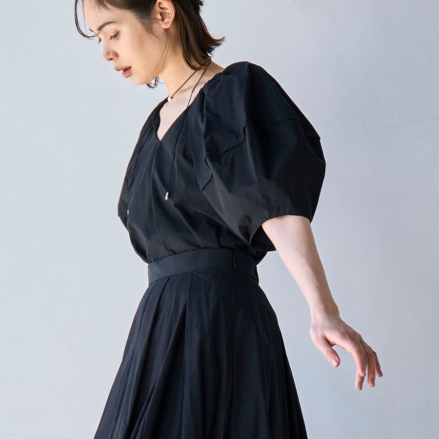 ネック周りはギャザーを配したVネックデザインにし、すっきりとした上品な見映え。