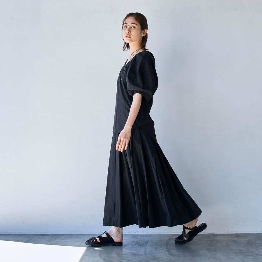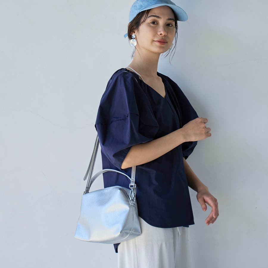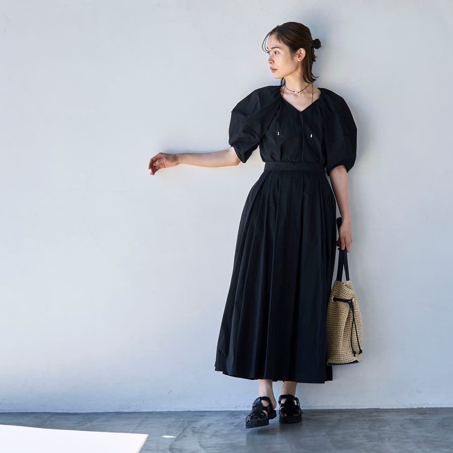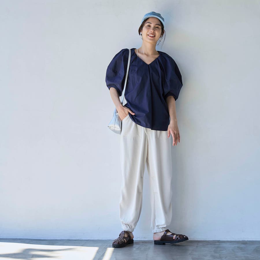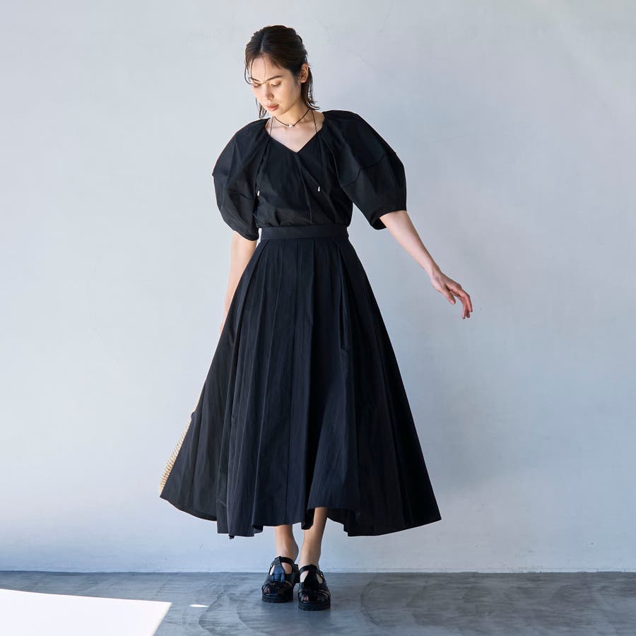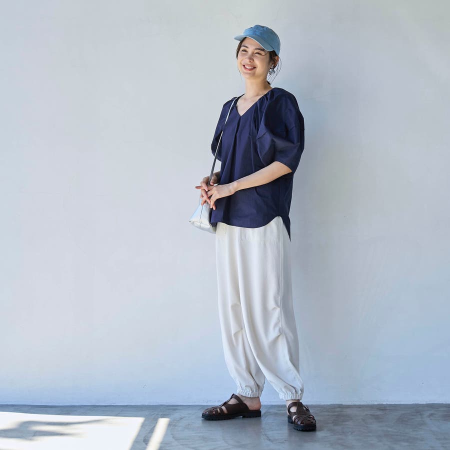 ネック周りはギャザーを配したVネックデザインにし、すっきりとした上品な見映え。