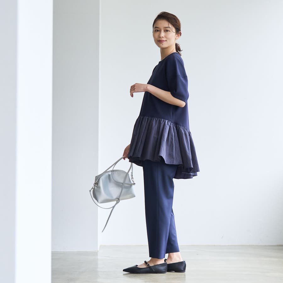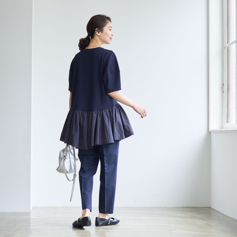 ボリューム感が程よいランタンスリーブの異素材ドッキングプルオーバー。