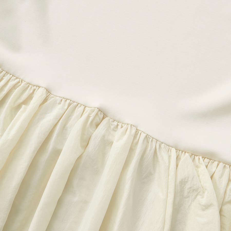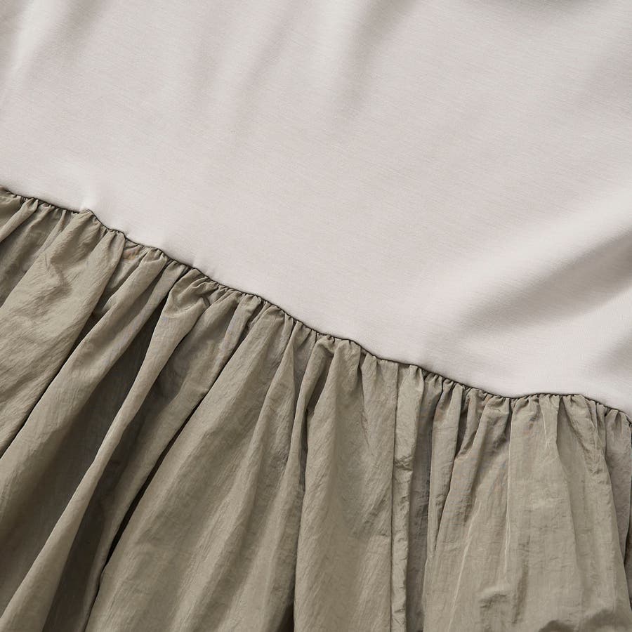 袖は切替を入れてランタンシルエットにし、ウエスト切替下には今年らしいナイロン布帛でドッキングデザインに仕上げました。