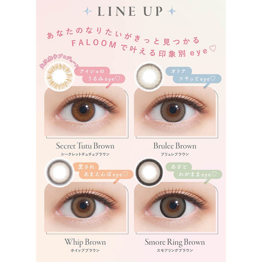| カラー | シークレットチュチュブラウン(Secret Tutu Broen) / ブリュレブラウン(Brulee Brown) / ホイップブラウン(Whip Brown) / スモアリングブラウン(Smore Ring Brown) |