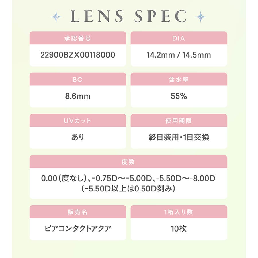 | 度数 | 度数:±0.00 / 度数:-0.75 / 度数:-1.00 / 度数:-1.25 / 度数:-1.50 / 度数:-1.75 / 度数:-2.00 / 度数:-2.25 / 度数:-2.50 / 度数:-2.75 / 度数:-3.00 / 度数:-3.25 / 度数:-3.50 / 度数:-3.75 / 度数:-4.00 / 度数:-4.25 / 度数:-4.50 / 度数:-4.75 / 度数:-5.00 / 度数:-5.25 / 度数:-5.50 / 度数:-5.75 / 度数:-6.00 / 度数:-6.50 / 度数:-7.00 / 度数:-7.50 / 度数:-8.00 |