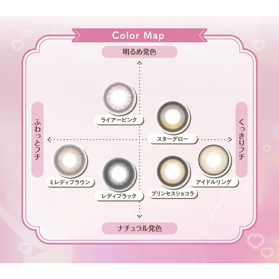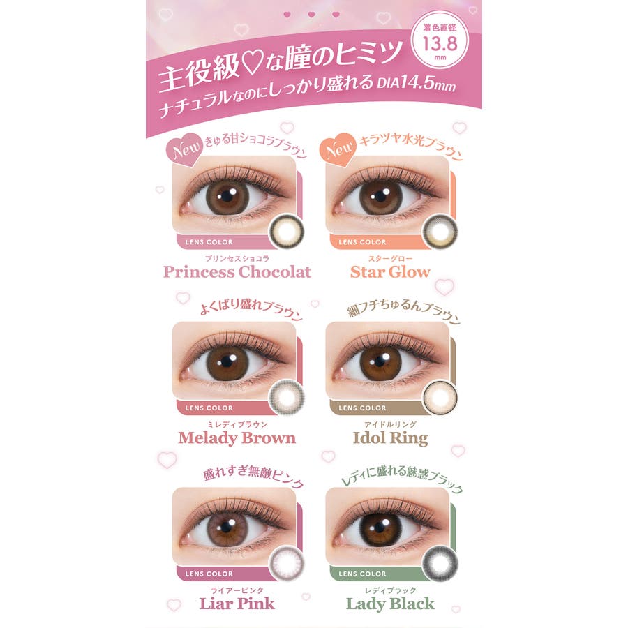 | カラー | アイドルリング(Idol Ring) / ライアーピンク(Liar Pink) / レディブラック(Lady Black) / ミレディブラウン(Melady Brown) / プリンセスショコラ(Princess Chocolat) / スターグロー(Star Glow) |