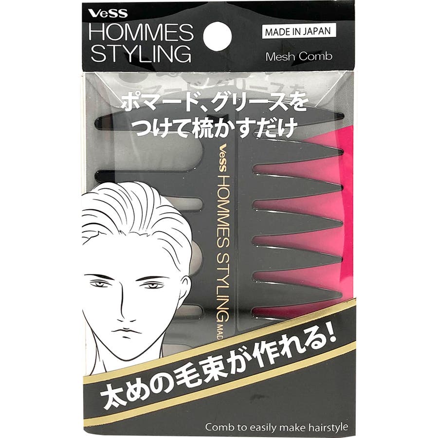 ●太めの毛束が作れる!メッシュコーム!●2種類の異なったあら目のクシ歯で髪のルーズ感、立体感を作り出します。●ワックスやポマードを使用後クシで梳かすだけで手では作り出せない束感を作り出す。●コンパクトサイズが持ち運びしやすく、クシを通すだけの為手が汚れにくい、出先でのスタイリングの手直しにもおススメです。
