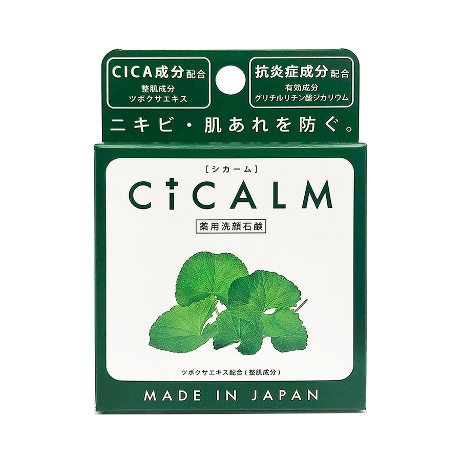 CICA*+抗炎症成分**配合。ニキビ・肌あれを防ぐ薬用洗顔石鹸《CICALM》*ツボクサエキス(整肌成分)**グリチルリチン酸ジカリウム(有効成分)CICAを含む3種の植物エキスと、植物由来の4種の保湿成分が、うるおいのあるすこやかなお肌に導きます。ナチュラルにこだわり、植物由来の洗浄成分を使用しています。パラベン・鉱物油・アルコール・タール系色素 不使用