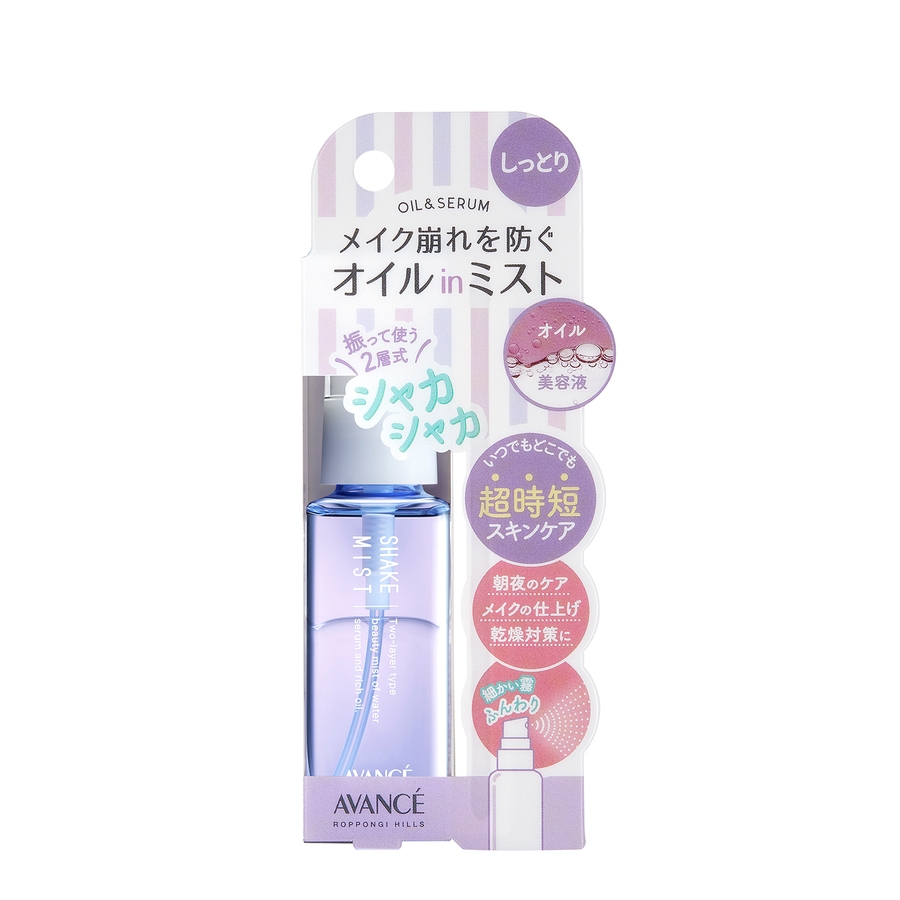 メイク崩れを防ぐオイルインミスト。ポーチに入るミニサイズ登場。メイクのノリ&モチが劇的にUP!!うるおいロングキープ乾燥による過剰な皮脂の分泌を抑えます。細かい霧のふんわりミストタイプ。しっとりうるおいタイプ。