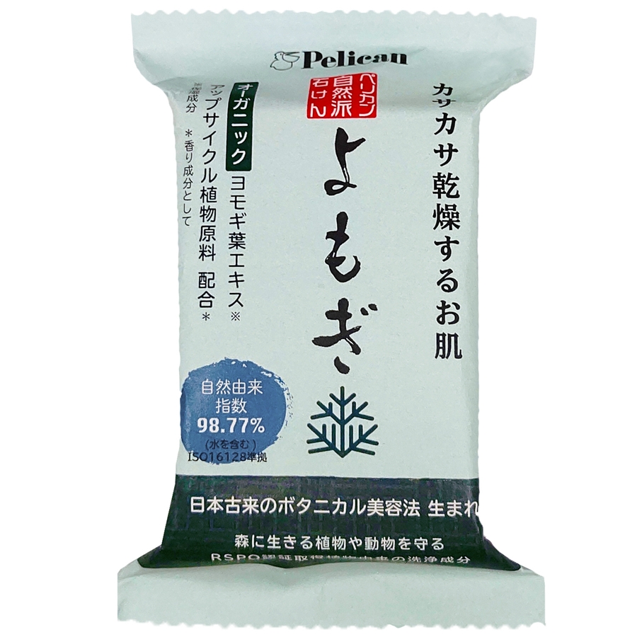 ペリカン自然派石けんシリーズのリニューアル商品。日本古来のオーガニック和素材を使用。保湿成分であるヨモギエキス配合ですべすべお肌に洗い上げます。アップサイクル原料から作った香料使用。やさしいよもぎの香り。